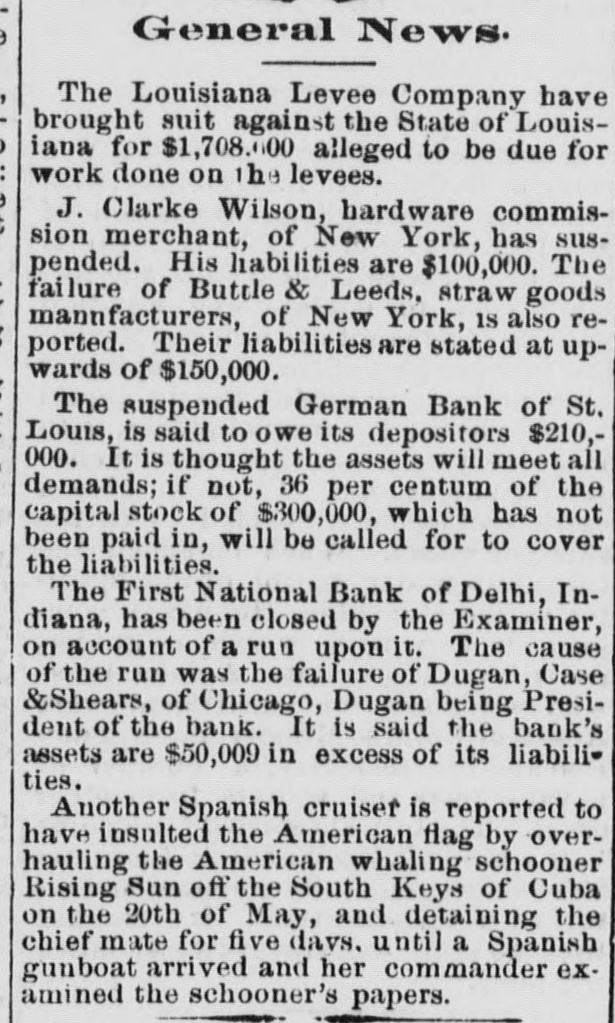 General News. The Louisiana Levee Company have brought suit against the State of Louisiana for $1,708.00 alleged to be due for work done on the levees. J. Clarke Wilson, hardware commission merchant, of New York, has suspended. His liabilities are $100,000. The failure of Buttle & Leeds, straw goods mannfacturers, of New York, IS also reported. Their liabilities are stated at upwards of $150,000. The suspended German Bank of St. Louis, is said to owe its depositors $210,000. It is thought the assets will meet all demands; if not, 36 per centum of the capital stock of $300,000, which has not been paid in, will be called for to cover the liabilities. The First National Bank of Delhi, Indiana, has been closed by the Examiner, on account of a run upon it. The cause of the run was the failure of Dugan, Case &Shears, of Chicago, Dugan being President of the bank. It is said the bank's assets are $50,009 in excess of its liabilities. Another Spanish cruiser is reported to have insulted the American flag by overhauling the American whaling schooner Rising Sun off the South Keys of Cuba on the 20th of May, and detaining the chief mate for five days. until a Spanish gunboat arrived and her commander examined the schooner's papers.
