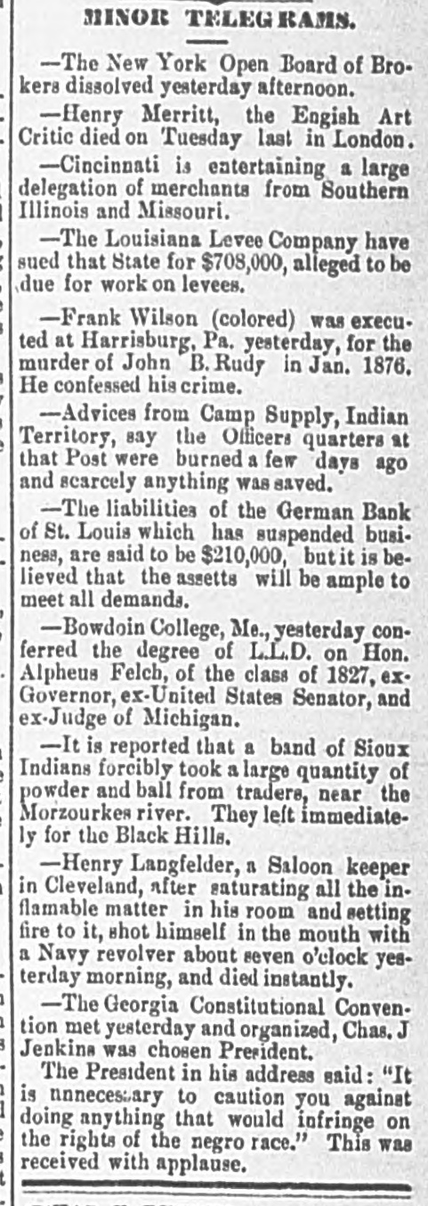 MINOR TELEGRAMS. -The New York Open Board of Brokers dissolved yesterday afternoon. -Henry Merritt, the Engish Art : Critic died on Tuesday last in London. -Cincinnati is entertaining a large delegation of merchants from Southern Illinois and Missouri. I ) -The Louisiana Levee Company have : sued that State for $708,000, alleged to be due for work on levees. ) -Frank Wilson (colored) was execu3 ted at Harrisburg, Pa. yesterday, for the murder of John B. Rudy in Jan. 1876. I He confessed his crime. 7 -Advices from Camp Supply, Indian ) Territory, say the Officers quarters at e that Post were burned a few days ago and scarcely anything was saved. -The liabilities of the German Bank of St. Louis which has suspended business, are said to be $210,000, but it is believed that the assetts will be ample to meet all demands. -Bowdoin College, Me., yesterday conferred the degree of L.L.D. on Hon. Alpheus Felch, of the class of 1827, exGovernor, ex-United States Senator, and ex-Judge of Michigan. 1 -It is reported that a band of Sioux Indians forcibly took a large quantity of powder and ball from tradere, near the : Morzourkes river. They left immediately for the Black Hills. : -Henry Langfelder, a Saloon keeper i in Cleveland, riter saturating all the inflamable matter in his room and setting fire to it, shot himself in the mouth with a Navy revolver about seven o'clock yesterday morning, and died instantly. 1 -The Georgia Constitutional Conven1 tion met yesterday and organized, Chas. J 3 Jenkins was chosen President. . The President in his address said: "It 1 is nnnecessary to caution you against 1 doing anything that would infringe on e the rights of the negro race." This was 3 received with applause. t . -