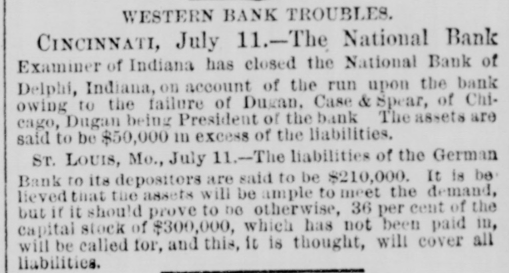 WESTERN BANK TROUBLES. CINCINNATI, July 11.-The National Bank Examiner of Indiana has closed the National Bank of Delphi, Indiana, on account of the run upon the bank owing to the failure of Dugan. Case & Spear, of Chicago, Dugan being President of the bank The assets are said to be $50,000 in excess of the liabilities. ST. LOUIS, Mo., July 11.-The liabilities of the German Bank to its depositors are said to be $210,000. It is be lieved that the assets will be ample to meet the demand, but if it should prove to 00 otherwise, 36 per cent of the capital stock of $300,000, which has not been paid 111, will be called for, and this, it is thought, will cover all liabilities.
