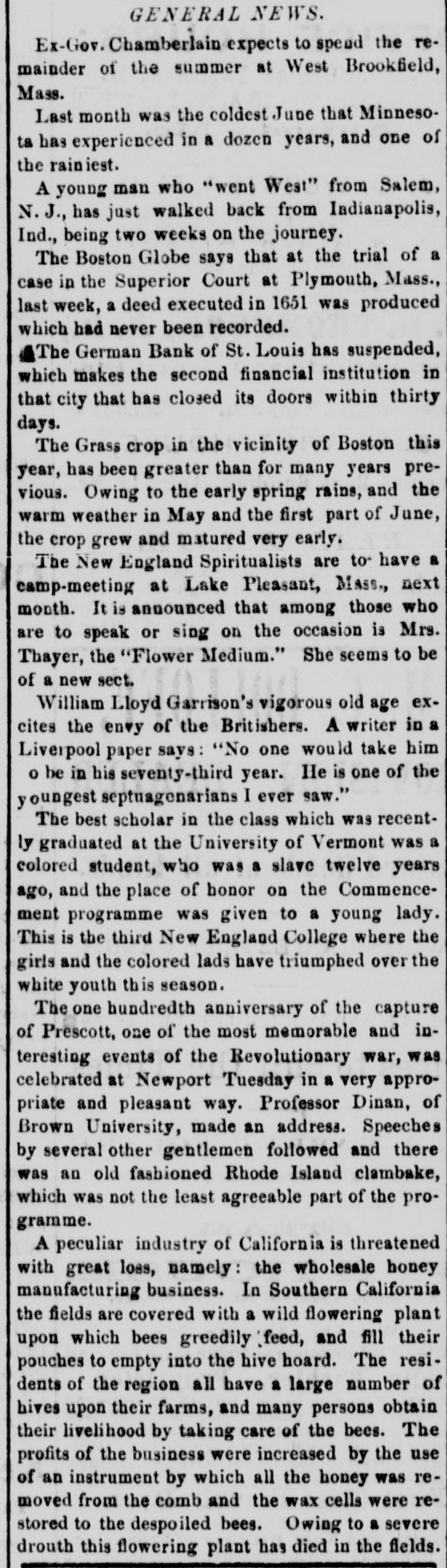 GENERAL NEWS. Ex-Gov.Chamberlain expects to spend the remainder of the summer at West Brookfield, Mass. Last month was the coldest June that Minnesota has experienced in a dozen years, and one of the rainiest. A young man who "went West" from Salem, N. J., has just walked back from Indianapolis, Ind., being two weeks on the journey. The Boston Globe says that at the trial of a case in the Superior Court at Plymouth, Mass., last week, a deed executed in 1651 was produced which had never been recorded. The German Bank of St. Louis has suspended, which makes the second financial institution in that city that has closed its doors within thirty days. The Grass crop in the vicinity of Boston this year, has been greater than for many years previous. Owing to the early spring rains, and the warm weather in May and the first part of June, the crop grew and matured very early. The New England Spiritualists are to have a camp-meeting at Lake Pleasant, Mass., next month. It is announced that among those who are to speak or sing on the occasion is Mrs. Thayer, the "Flower Medium." She seems to be of a new sect. William Lloyd Garrison's vigorous old age excites the envy of the Britishers. A writer in a Liverpool paper says: "No one would take him o be in his seventy-third year. He is one of the youngest septuagenarians I ever saw." The best scholar in the class which was recently graduated at the University of Vermont was a colored student, who was a slave twelve years ago, and the place of honor on the Commencement programme was given to a young lady. This is the third New England College where the girls and the colored lads have triumphed over the white youth this season. The one hundredth anniversary of the capture of Prescott, one of the most memorable and interesting events of the Revolutionary war, was celebrated at Newport Tuesday in a very appropriate and pleasant way. Professor Dinan, of Brown University, made an address. Speeches by several other gentlemen followed and there was an old fashioned Rhode Island clambake, which was not the least agreeable part of the programme. A peculiar industry of California is threatened with great loss, namely: the wholesale honey manufacturing business. In Southern California the fields are covered with a wild flowering plant upon which bees greedily feed, and fill their pouches to empty into the hive hoard. The residents of the region all have a large number of hives upon their farms, and many persons obtain their livelihood by taking care of the bees. The profits of the business were increased by the use of an instrument by which all the honey was removed from the comb and the wax cells were restored to the despoiled bees. Owing to a severe drouth this flowering plant has died in the fields.