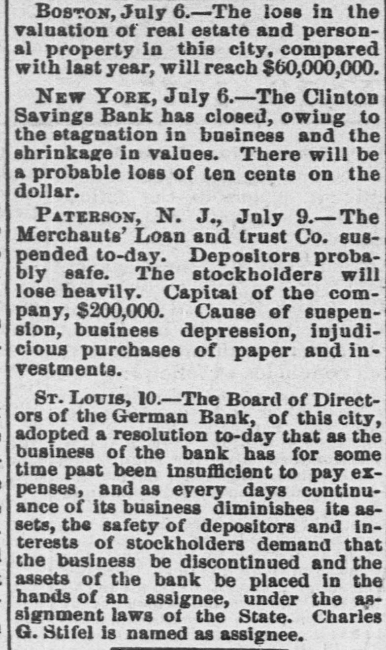 BOSTON, July 6.-The loss in the valuation of real estate and personal property in this city, compared with last year, will reach $60,000,000. NEW YORK, July -The Clinton Savings Bank has closed, owing to the stagnation in business and the shrinkage in values. There will be a probable loss of ten cents on the dollar. PATERSON, N. J., July 9.- The Merchauts' Loan and trust Co. suspended to-day. Depositors probably safe. The stockholders will lose heavily. Capital of the company, $200,000. Cause of suspension, business depression, injudicious purchases of paper and investments. Sr. LOUIS, 10.-The Board of Directors of the German Bank, of this city, adopted a resolution to-day that as the business of the bank has for some time past been insufficient to pay expenses, and as every days continuance of its business diminishes its assets, the safety of depositors and interests of stockholders demand that the business be discontinued and the assets of the bank be placed in the hands of an assignee, under the assignment laws of the State. Charles G. Stifel is named as assignee.