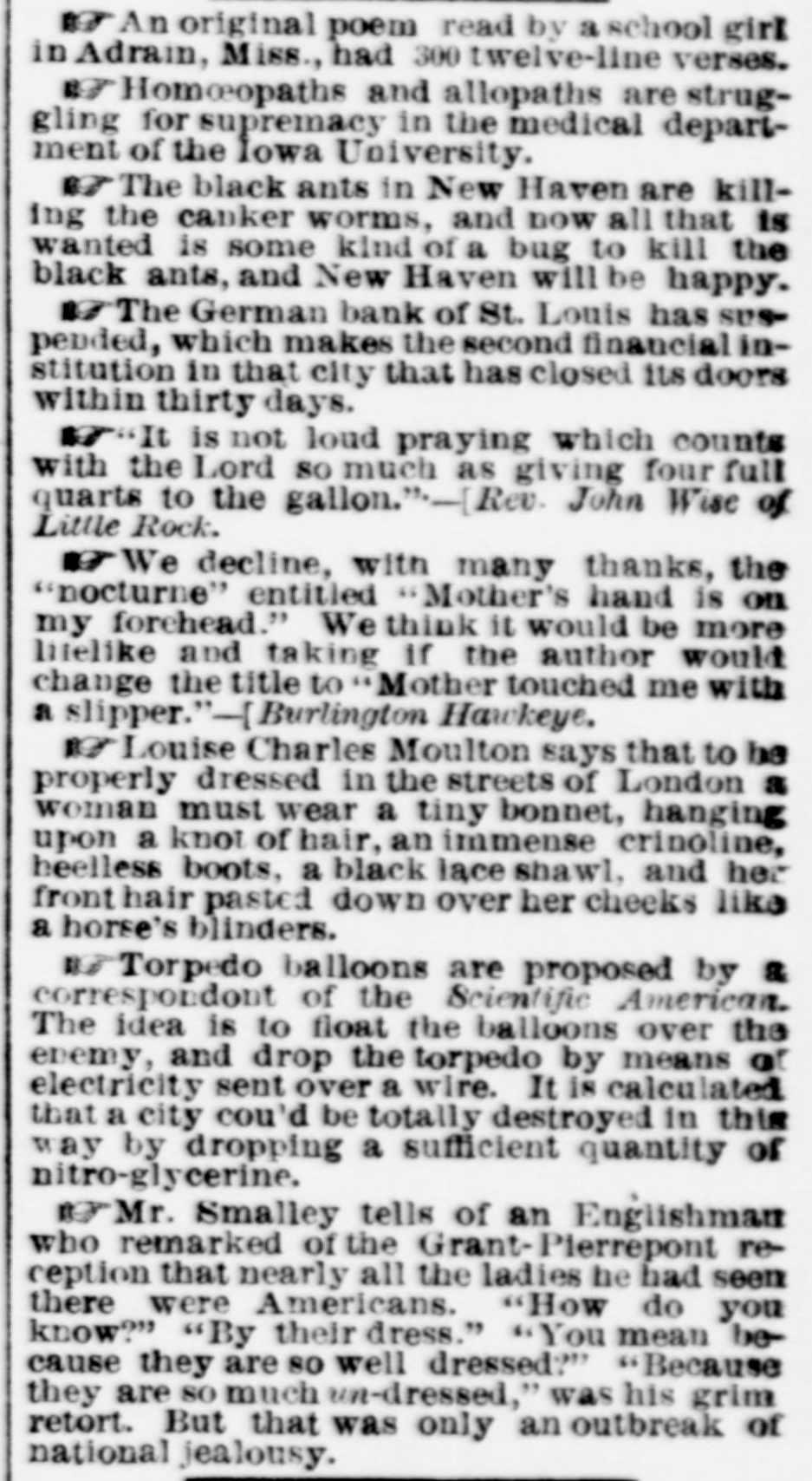 n An original poem read by a school girl in Adrain, Miss., had 300 twelve-line verses. - Homoepaths and allopaths are struggling for supremacy in the medical department of the Iowa University. or The black ants in New Haven are killing the canker worms, and now all that is wanted is some kind of a bug to kill the black ants, and New Haven will be happy. 19 The German bank of St. Louis has suspended, which makes the second financial institution in that city that has closed its doors within thirty days. w It is not loud praying which counts with the Lord so much as giving four full quarts to the gallon." -{Rev. John Wise of Little Rock. We decline, with many thanks, the "nocturne" entitled "Mother's hand is on my forehead." We think it would be more lifelike and taking If the author would change the title to Mother touched me with a slipper."-[Burlington Hawkeye. w Louise Charles Moulton says that to be properly dressed in the streets of London a woman must wear a tiny bonnet, hanging upon a knot of hair, an immense crinoline, beelless boots, a black lace shawl, and her front hair pasted down over her cheeks like a horse's blinders. 17 Torpedo balloons are proposed by a correspondent of the Scientific American. The idea is to float the balloons over the enemy, and drop the torpedo by means of electricity sent over a wire. It is calculated that a city cou'd be totally destroyed in this way by dropping a sufficient quantity of nitro-glycerine. or Mr. Smalley tells of an Englishman who remarked of the Grant-Pierrepont reception that nearly all the ladies be had seen there were Americans. "How do you know?" "By their dress." "You mean be cause they are 80 well dressed?" "Because they are so much un-dressed," was his grim retort. But that was only an outbreak of national jealousy.