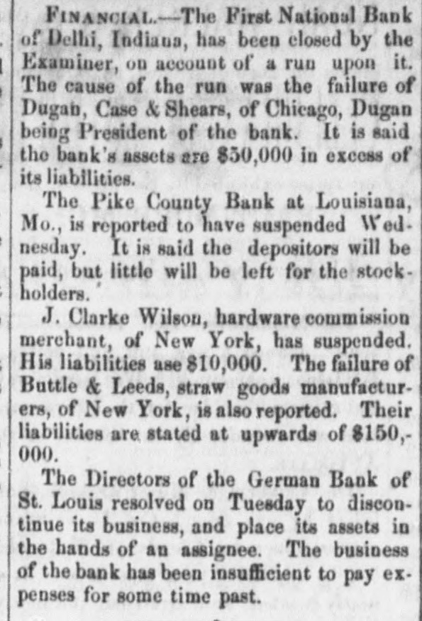 FINANCIAL.-The First National Bank of Delhi, Indiana, has been closed by the Examiner, on account of a run upon it. The cause of the run was the failure of Dugah, Case & Shears, of Chicago, Dugan being President of the bank. It is said the bank's assets are $50,000 in excess of its liabilities. The Pike County Bank at Louisiana, Mo., is reported to have suspended Wed. nesday. It is said the depositors will be paid, but little will be left for the stockholders. J. Clarke Wilson, hardware commission merchant, of New York, has suspended. His liabilities ase $10,000. The failure of Buttle & Leeds, straw goods manufacturers, of New York, is also reported. Their liabilities are stated at upwards of $150,000. The Directors of the German Bank of St. Louis resolved on Tuesday to discontinue its business, and place its assets in the hands of an assignee. The business of the bank has been insufficient to pay expenses for some time past.