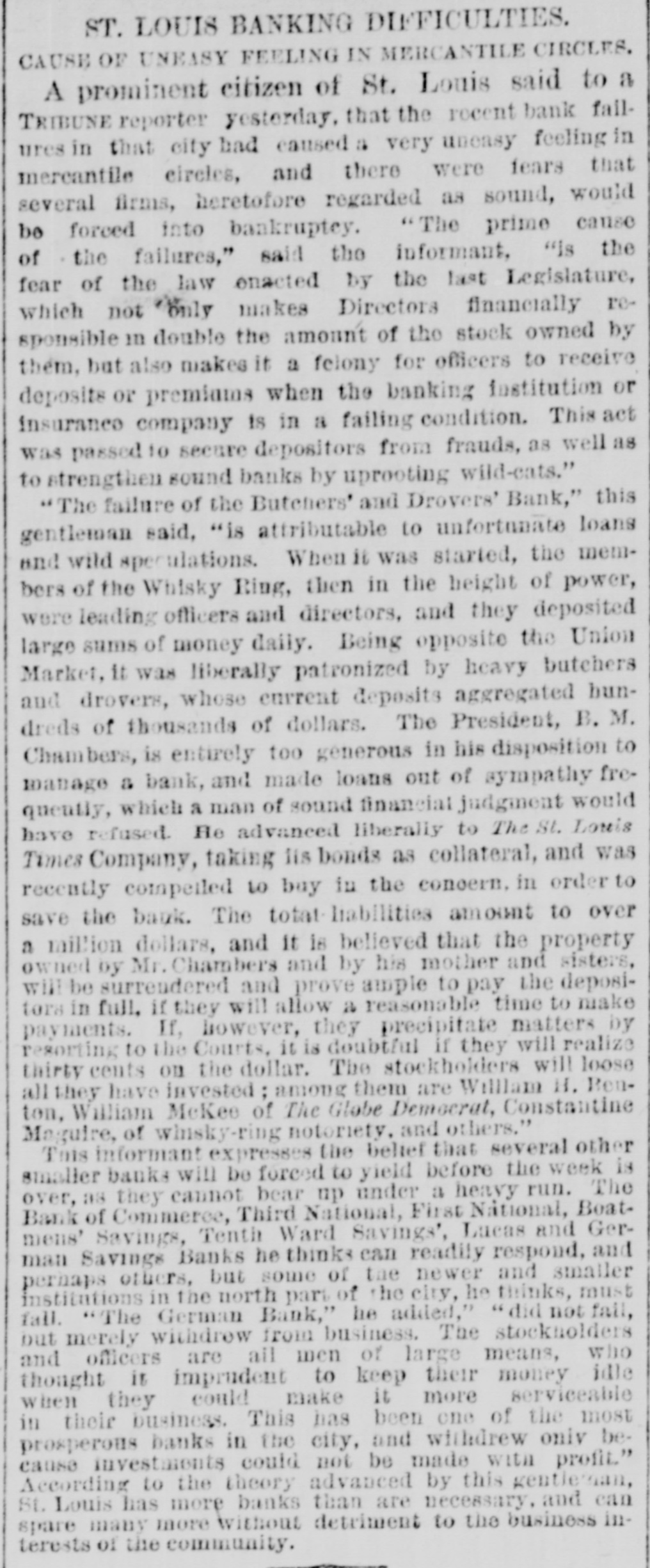 ST. LOUIS BANKING DIFFICULTIES. CAUSE OF UNEASY FEELING IN MERCANTILE CIRCLES. A prominent citizen of St. Louis said to a TRIBUNE reporter yesterday. that the recent bank fallures in that city had caused a very uneasy feeling in mercantile circles, and there were fears that several firms, heretofore regarded as sound, would be forced into bankruptey. "The prime cause of the failures," said the informant, "Is the fear of the law enacted by the last Legislature, which not only makes Directors financially responsible in double the amount of the stock owned by them, but also makes it a felony for officers to receive deposits or premiamas when the banking institution or insurance company is in a failing condition. This act was passed to secure depositors from frauds, as well as to strengthen sound banks by uprooting wild-eats." "The failure of the Butchers' and Drovers' Bank," this gentleman said, "is attributable to unfortunate loans and wild speculations. When it was started, the members of the Whisky Ring, then in the height of power, were leading officers and directors, and they deposited large sums of money daily. Being opposite the Union Market, it was liberally patronized by heavy butchers and drovers, whose current deposits aggregated hundreds of thousands of dollars. The President, B. M. Chambers, is entirely too generous in his disposition to manage & bank, and made loans out of sympathy frequently, which a man of sound financial judgment would have refused. He advanced liberally to The St. Louis Times Company, taking lis bonds as collateral, and was recently compelled to buy in the conoern. in order to save the bank. The total liabilities amount to over a million dollars. and It is believed that the property owned by Mr. Chambers and by his mother and sisters. will be surreudered and prove simple to pay the depositora in full. if they will allow a reasonable time to make payments. If, however, they precipitate matters by resorting to the Courts, it is doubtful if they will realize thirty cents on the dollar. The stockholders will loose all they have invested among them are William H. Renton, William McKee of The Globe Democrat, Constantine Maguire, of winsky-ring notoriety, and others." This informant expresses the belief that several other smaller banks will be forced to yield before the week is over, as they cannot bear up under a heavy run. The Bank of Commerce, Third National, First National, Boat. mens' Savings, Tenth Ward Savings', Lacas and German Savings Banks he thinks can readily respond, and perhaps others, but some of the newer and smaller institutions in the north part of the city, he thinks, must fall. "The German Bank," he added," "did not fall, but merely withdrow from business. The stockholders and officers are all men of large means, who thought it imprudent to keep their money idle when they could make it more serviceable in their business. This has been one of the most prosperous banks in the city, and withdrew oniv because investments could not be made with profit." According to the theory advanced by this gentleman St. Louis has more banks than are necessary. and can spare many more without detriment to the business interests of the community.