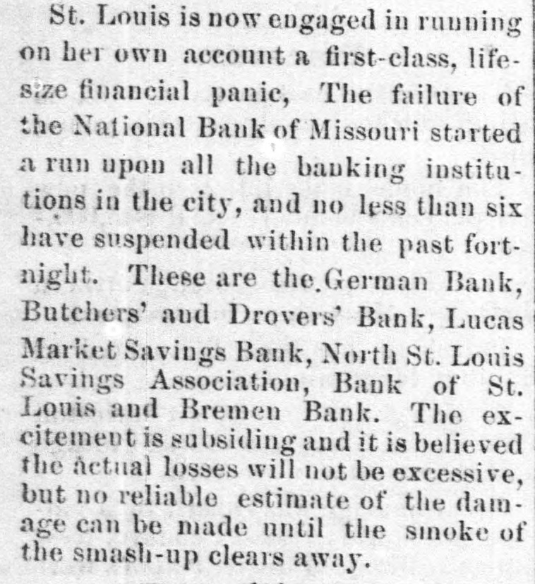 St. Louis is now engaged in running on her own account a first-class, lifesize financial panic, The failure of the National Bank of Missouri started a run upon all the banking institutions in the city, and no less than six have suspended within the past fortnight. These are the, German Bank, Butchers' and Drovers' Bank, Lucas Market Savings Bank, North St. Louis Savings Association, Bank of St. Louis and Bremen Bank. The excitement is subsiding and it is believed the actual losses will not be excessive, but no reliable estimate of the damage can be made until the smoke of the smash-up clears away.