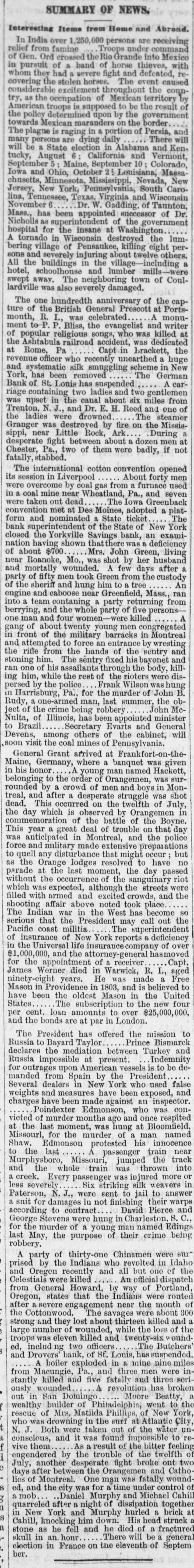 SUMMARY OF NEWS. Interesting Items from Home and Abroad. In India over .250 .000 persons are receiving from Troops famine Gen. Ord crossed th Rio Grande into Mexico in pursuit of band of horse thieves, with whom they had severe fight and defeated recovering the stolen horses. The event caused considerable excitement throughout the countrv. as the occupation of Mexican territory by American troops is supposed to be the result of the policy determined upon by the towards Mexican on the border The plague is raging in portion of Persia, and many persons There daily are will dying will be State election in Alabama and Kentucky, August California and Vermont Septe Maine. September 10 Colorado Iowa and Ohio, October 25 Louisiana, Massa chusetts, Minnesota Mississippi, Nevada New Jersey, New York, Pennsylvania, South Carolina, Tennessee, Texas, Virginia and Wisconsin November Dr. W Gadding of Taunton Mass., has been appointed of Dr Nicholls intendent of the government hospital for the insane at Washington A tornado in Wisconsin destroyed the lumbering village of Pensaukee, killing eight persons and severely injuring about twelve others, All the buildings in the village -including hotel, schoolhouse and lumber mills swept away. The neighboring town of Coullardville was also severely damaged. The one hundredth anniversary of the capture of the British General Prescott at Ports mouth, R. was celebrated monument to P Bliss, the evangelist and writer of popular religious songs, who was killed at the Ashtabula railroad accident was dedicated at Rome. Pa Capt in brackett, the revenue officer who recently unearthed huge and systematic silk smuggling scheme in New been has York removed The German car Bank of St. Lonis has suspended A riage containing two ladies and two gentlemen was upset in the canal about six miles from Trenton, N and Dr. E. H Reed and one of the ladies were drowned The steamer Granger was destroyed by fire on the Mississippi, near Little Rock. Ark During desperate fight between about dozen men at Chester, Pa., two of them were badly, if not fatally stabbed The international cotton convention opened its in session Liverpool About forty men were overcome by coal gas from furnace used in coal mine near Wheatland, Pa., and seven were taken out dead The Iowa Greenback convention met at Des Moines, adopted a platform and nominated a State ticket The bank superintendent of the State of New York closed the Yorkville Savings bank, an examination having shown that there was deficiency of about $700 Mrs John Green, living near Roanoke, Mo. was shot by her husband and mortally wounded A few days after a party of fifty men took Green from the custody An of the sheriff and hung him to tree engine and caboose near Greenfield, Mass. ran into team contaning party returning from berrying and the whole party of five personsone man and four wome killed A gang of about twenty young men con gregated in front of the military barracks in Montreal and attem pted to force an entrance by wresting the rifle from the hands of the sentry and stoning him. The sentry fixed his bavonet and one of his assailants through the body. kill ing him, while the rest of the rioters were dispersed by the police Frank Wilson was hung Harrisburg, Pa. for the murder of John B. Rudy. one-armed man, last summer the ob John Mcject of the crime being robber Nulta, of Illinois, has been appointed minister Brazil Secretary Evarts and General Devens. among others of the cabinet wil soon visit the coal mines of Pennsylvania. General Grant arrived at Frankfort-on-the Maine, Germany where a banquet was given in his honor young man named Hackett belonging to the order of Orangemen, was sur rounded by crowd of men and boys in Montreal, and after desperate struggle was shot dead. This occurred on the twelfth of July the day which is observed by Orangement in commemoration of the battle of the Boyne This year great deal of troubl on that day was antici pated in Montreal and the police force and military made extent ations to quell any disturbance that might occur but as the Orange lodges resolved to have no parade at the last moment the day passed without the occurrence of the sanguinary riot which was expected, although the streets were filled with armed and excited crowds, and the shooting affair above noted took place The Indian war in the West has become so serious that the President may call out the Pacific coast militia The superintendent of insurance of New York reports deficiency in the Universal life insurance company of over 1,000,000, and the attorney -general has for the appointment of receiver Capt James Werner died in Warwick, R aged He Free ninety years. made -eight Mason in Providence in 1803. and is believed to have been the oldest Mason in the United States The subscription to the new four per cent loan amounts to over $25,000,000 and the bonds are at par in London The President has offered the mission to Bismarch Prince Russia to Bavard Taylor declares the mediation between Turkey and Indemnity Russia impossible at present for outrages upon American vessels is to be demanded from Spain by the President Several dealers in New York who used false weights and measures have been exposed, and charges have been made against an inspector. Poindexter Edmonson who was convicted of murder months ago and once respited at the last moment was hung at Bloomfield. Missourl for the murder of man named Shaw. Edmonson protested his to near the last train passenger Missour track the Murphysboro jumped and the whole train was thrown into creek. Every passenger was in jured more less severely Six striking sill weavers in Paterson, N J. were sent to jail to answer a suit for damages not finishing their warps David and Pierce according to contract George Stevens were hung in Charleston C. for the murder of young man named Edings last May, the purpose of their crime being robbery. A party of thirty-one Chinamen were sur prised by the Indians who rev