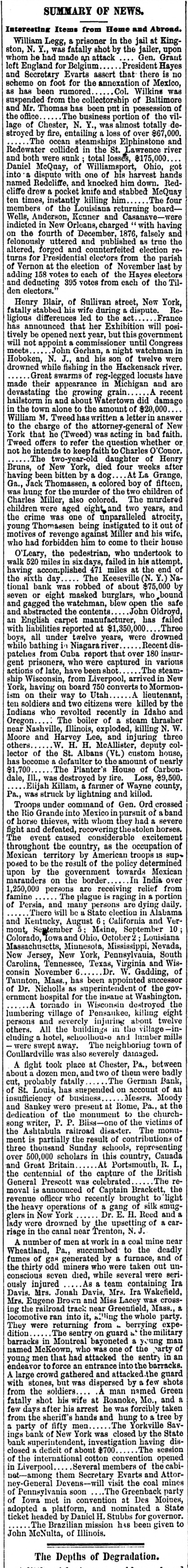 SUMMARY OF NEWS. Interesting Items from Home and Abroad. William Legg, prisoner in the jail at King ston. N. Y. was fatally shot by the jailer, upon Gen. Grant whom he had made an attack President left England for Belgium Hayes and Secretary Evarts assert that there is no scheme on foot for the annexation of Mexico, as has been rumored Col. Vilkins was suspended from the collectorship of Baltimore and Mr. Thomas has been put in session of the office The business portion of the vil lage of Chester, N. Y. was almost totally de stroyed by fire, entailing loss of over $67,000 The ocean steamships Elphinstone and Redewater collided in the St Lawrence river and both were sunk total losses, $175,000 Daniel McQuay of Williamsport Ohio, got into dispute with one of his harvest hands named Redcliffe and knocked him down. Red cliffe drew pocket knife and stabbed McQuay The four ten times, instantly killing him members of the Louisiana returning boardWells, Anderson Kenner and Casanay indicted in New Orleans charged 'with having on the fourth of December 1876 falsely and felonous uttered and published as true the altered. forged and counterfeited election returns for Presidential electors from the parish of Vernon at the election of November last by adding 158 votes to each of the Haves elector and deducting 395 votes from each of the Til den electors. Henry Blair, of Sullivan street, New York Re fatally stabbed his wife during dispute ligious differences led to the France has announced that her Exhibition will positively be opened next year, but this overnment will not appoint commission until Congress meets John Gerhan night watchman in Hoboken, N and his son of twelve were drowned while fishing in the Hack ensack river Great swarms of rep legged locusts have made their appearance in Michiga and are recent devastating the growing grain A hailstorm in and about Watertown did damage in the town alone to the amount of $20,000 William M. Tweed has written letter in answer to the charge of the attorney -general of New York that he (Tweed) was acting in bad faith Tweed offers to refer the question whether or not he intends to keep faith to Charles o 'Conor The two-year-old daughter of Henry Bruns, of New York, died four weeks after having been bitten by dog At La Grange Ga.. Jack Thomassen colored boy of fifteen was hung for the murder of the two children of Charles Miller also colored The murdered children were aged eight and two years, and the crime was one of unparalleled atrocity young Tho massen being instigated to it out of motives of revenge against Miller and his wife. who had forbidden him to come to their house O'Leary, the pedestrian, who undertook to walk 520 miles in days, failed in his attempt of having plished 471 miles at the end the sixth day The Keese tional bank was robbed of about $75,000 by seven or eight masked burglars, who bound and gagged the watchman. blew open the safe and abstracted the contents John Oldroyd failed an English carpet has Three with liabilities reported at $1,350,000 boys, all under twelve years, were drowned while bathing Niagara river Recent dispatches from Cuba report that over 180 insurvarious gent prisoners, who were captured in steamThe actions of late, have been shot ship Wisconsin, from Liverpool arrived in New York having on board 750 converts to Mormon ism on their way to Utah lieutenant ten soldiers and two citizens were killed by the Indians who revolted recently in Idaho and thras) The steam boiler of Oregon near Nashville Illinois, exploded, killing N. W Moore and Harvey Lee, and in juring three others H H McAllister. deputy col lector of the St. Albans (Vt.) custom house has become defaulter to the amount of nearl The Planter 's House of Carbon $1,700 was destroyed by tire Loss $9,500 dale, Elijah Killam. farmer of Wavne county Pa.. was struck by lightning and killed. Troops under command of Gen. Ord crossed the Rio Grande into Mexico in pursuit of band of horse thieves, with whom they had severe fight and defeated, recovering the stolen horses able consider excitement caused The event throughout the country, as the occupation of Mexican territory by American troops 18 supposed to be the result of the policy determined upon by the government towards Mexican marauders on the border In India over 1,250,000 persons are receiving relief from famine The plague raging portion of Persia, and many persons are dying daily There will be State election in Alabama and Kentucky, August California and Ver mont, entember Maine, September 10 Colorado Iowa and Ohio. October 2: Louisiana Massachusetts Minnesota, Mississippi, Nevada New Jersey, New York, Pennsy vania, South Carolina, Tennessee Texas, Virginia and Wis Dr of W. 6 consin November Gadding, Taunton, Mass., has been appointed successor of Dr. Nicholls as superintende of the gov ernment hospital for the insaue at Washington A tornado in Wisconsin destroyed the lumbering village of Pensaukee killing eight about twelve and severely persons others. the buildings in the villagecluding hotel, schoolhou-e and lumber mills swept away The neighboring town of Coullardville was also severely damaged A fight took place at Chester Pa. between about dozen men. and two of them were badly German Bank fatally cut probably of St. Louis, has suepended on account of all Moody of business insufficiency Messrs. and Sankey were present at Rome, Pa. at the dedication of the monument to the churchsong writer, P P. of the victims of the Ashtabula railroad disaster. The monument is partially the result contributions of three thousand Sunday schools, representing over 500,000 scholars in this country, Cauada and Great Britain At Portsmouth R. I. the centennial of the capture of the British General Prescott was celebrated The re moval is announced of Captain Brackett the revenue officer who brought to light the heavy operations of gang of silk smug Reed H and Dr glers New York lady were drowned by the upsetting of a carriage in the 