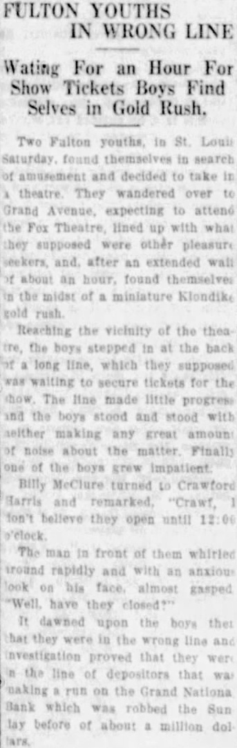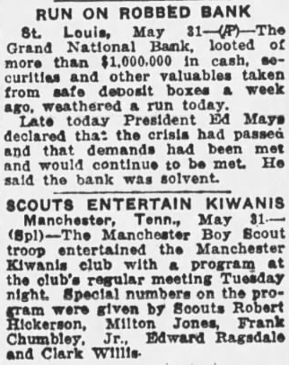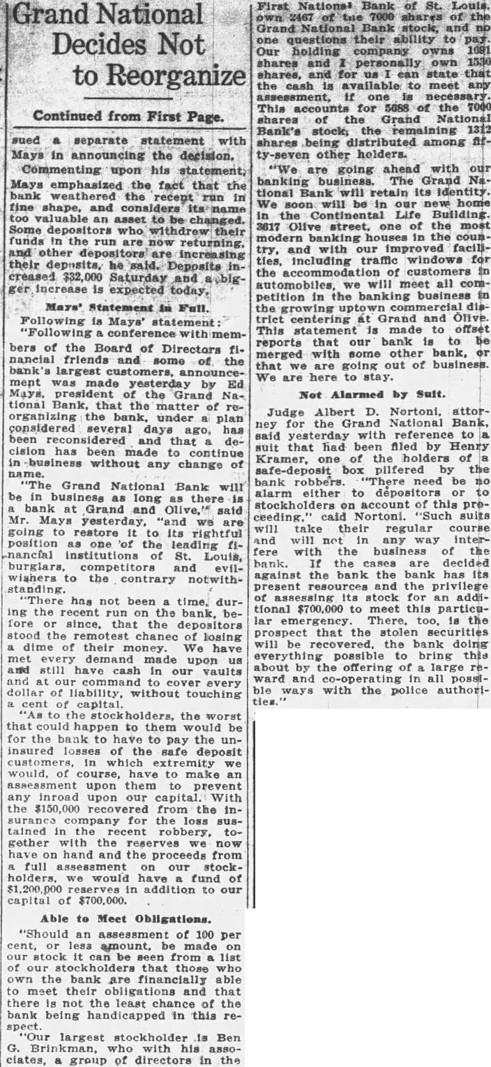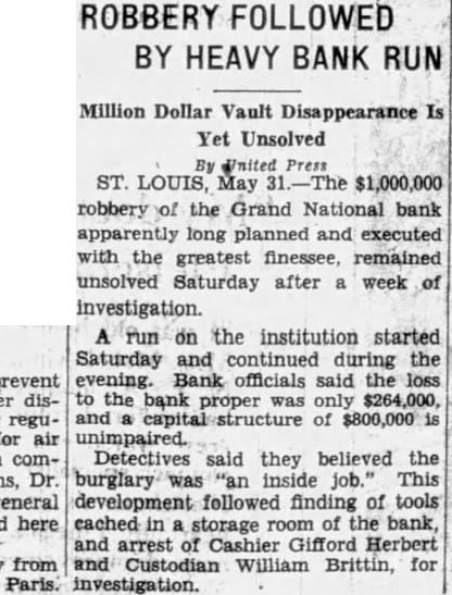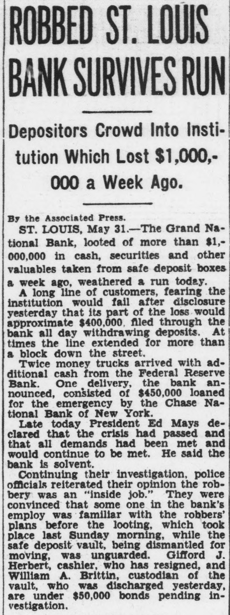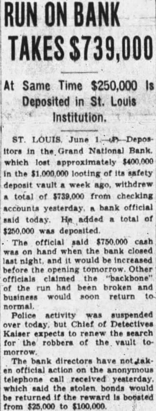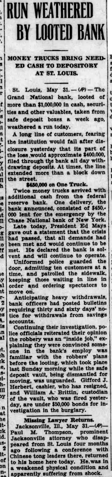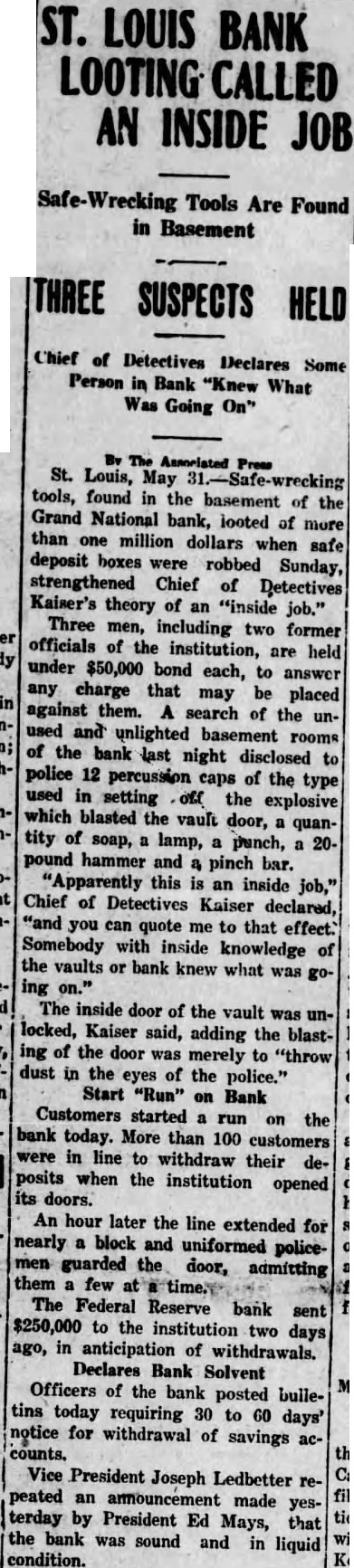 LOUIS BANK LOOTING CALLED AN INSIDE Tools Are Found in Basement SUSPECTS HELD Chief of Detectives Declares Some Person in Bank "Knew What Going On" Associated St. Louis, May tools, found in the basement of the Grand National bank, looted of more than one million dollars when safe deposit boxes were robbed Sunday, strengthened Chief of Detectives Kaiser's theory of an "inside job." Three men, including two former officials of the institution, are held under $50,000 bond each, to answer any charge that may be placed against them. search of the unused and unlighted basement rooms of the bank last night disclosed police 12 percussion caps of the type used in setting the explosive which blasted the vault door, quantity of soap, lamp, punch, pound hammer and pinch bar. "Apparently this is an inside job," Chief of Detectives Kaiser declared, "and you can quote me to that effect.' Somebody with inside knowledge of the vaults or bank knew what was ing The inside door of the vault was unlocked, Kaiser said, adding the blasting of the door was merely to "throw dust in the eyes of the police." Start "Run" on Bank Customers started run on the bank today. More than 100 customers in line to withdraw their deposits when the institution opened its doors. An hour later the line extended for nearly block and uniformed policemen guarded the door, admitting them few The Federal Reserve bank sent $250,000 to the institution two days ago, in anticipation of withdrawals. Declares Bank Solvent Officers of the bank posted bulletins today requiring 30 to 60 days' notice for withdrawal of savings accounts. Vice President Joseph Ledbetter repeated an announcement made yesterday by President Ed Mays, that the bank was sound and in liquid condition.