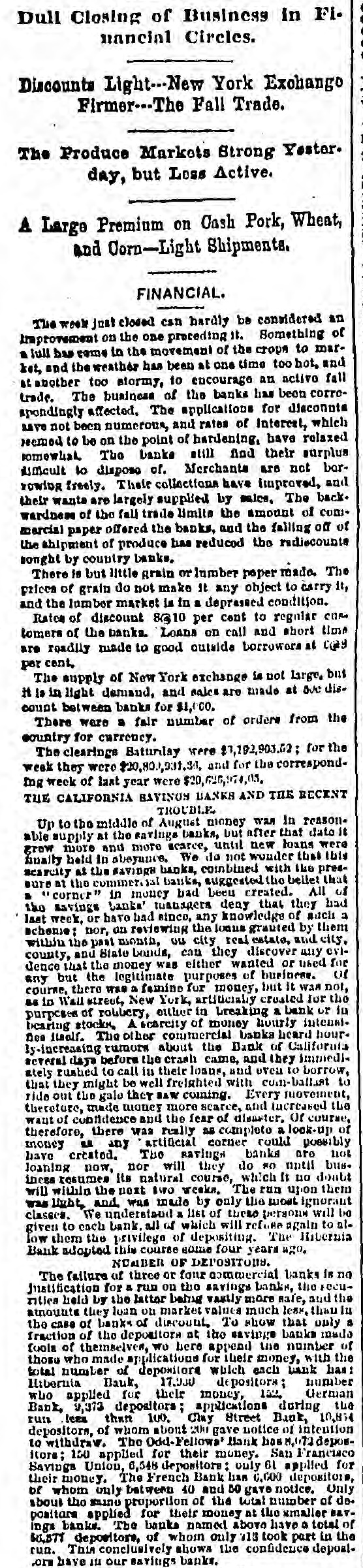 Dull Closing of Business in Financial Circles. Discounts Light--New York Exchango Firmer--The Fall Trade. The Produce Markets Strong Yester. day, but Loss Active. A Large Premium on Cash Pork, Wheat, and Corn-Light Shipments. FINANCIAL. The week just closed can hardly be considered an Improvement on the one preceding 11. Something of a full bas come in the movement of the crops to market, and the weather has been at one time too hot. and at another too stormy, to encourage an active fall trade. The business of the banks has been correspendingly affected. The applications for discounts save not been numerous, and rates of Interest, which reemed to be on the point of hardening, have relaxed somewhat. The banks still And their surplus difficult to dispose of. Merchants are not borvowing freely. Their collections have improved, and their wants are largely supplied by sales, The back. wardness of the fall trade limits the amount of commarcial paper offered the banks, and the falling off of the shipment of produce has reduced the rediscounts songht by country banks, There is but little grain or lumber paper made. The prices of grain do not make It any object to carry it, and the lumber market is in a depressed condition. Rates of discount 8(210 per cent to regular CURtomers of the banks. Loans on call and short time are readily made to good outside borrowors at c@9 per cent, The supply of New York exchange is not Large. but it is in light demand, and sales are made at ave discount between banks for $1,000. There were a fair number of orders from the country for currency. The clearings Baturday were $1,192,903.52; for the week they were $20,80,931.34, and for the correspondmg week of last year were $20,626,974.03. THE CALIFORNIA BAVINOS BANKS AND THE RECENT TROUBLE Up to the middle of August money was In reason. able supply at the savings banks, but after that date it grow more and more scaree, until new loans were finally held in absyance. We do not wonder that this searcity at the SAVIDGH banks, coinbined with the pressure at the commercial banks, suggested the bellet that a "corner" in money bad been created. All of the savings Lanks' managers deny that they had last week, or have had sinco, any knowledge of such a scheme: nor, on reviewing the loans granted by them within the past month, ou city real estate, and city, county, and State bonds, can they discover any evidence that the money was either wanted or used for any but the legitimate purposes of business. of course, there was a famine for money, but it WAR not, as in Wall street, New York, artiticially created for the purposes of robbery, other in breaking a bank or in bearing stocks, A scarcity of money hourly intensifiee itself. The other commercial banks heard hourly-increasing rumors about the Bank of California several days before the crash came, and they immediately rushed to call in their loans, and even to borrow, that they might be well freighted with com-ballast to ride out the gale they SAW coming. Every juovement, therefore, made money more scarce, and increased the want of confidence and the fear of disaster. Of course, therefore, there was really as complete a look-up of money as any artificial corner could possibly have created. The savings banks are not loaning now, nor will they do FO until bus. incss resumes its natural course, which It no doubt will within the next two weeks. The run upon them was light, and was inade by only the most ignorant classes. We understand a list of these persons will be given to each bank. all of which will refuse again to allow them the privilege of depositing. The Hibernia Bank adopted this course some four years ago. NUMBER OF DEPOSITONS. The failure of three or four commercial banks in no justification for a run on the savings banks, the secunties held by the latter being vastly more safe, and the amounts they loan on market values much less, than in the case of banks of discount, To show that only a fraction of the depositors at the savings banks inade fools of themselves, We here append the number of those who made applications for their money, with the total number of depositors which each bank has Hibernia Bauk, 17.000 depositors; number who applied for their money, 152, German Bank, 9,373 depositors; applications during the run less than 100. Clay Street Bank, 10,854 depositors, of whom about 200 gave notice of intention to withdraw. The Odd-Fellows' Bank has depositors; 150 applied for their money. San Francisco Savings Union, 6,548 depositors only 61 applied for their money. The French Bank has 0,000 depositors, of whom only between 40 and 50 gave notice. Only about the saino proportion of the total number of do. positors applied for their money at the smaller BAYings banks. The banks named above have a total of 50,577 depositors, of whom only 718 took part in the run. This conclusively shows the confidence deposibanks