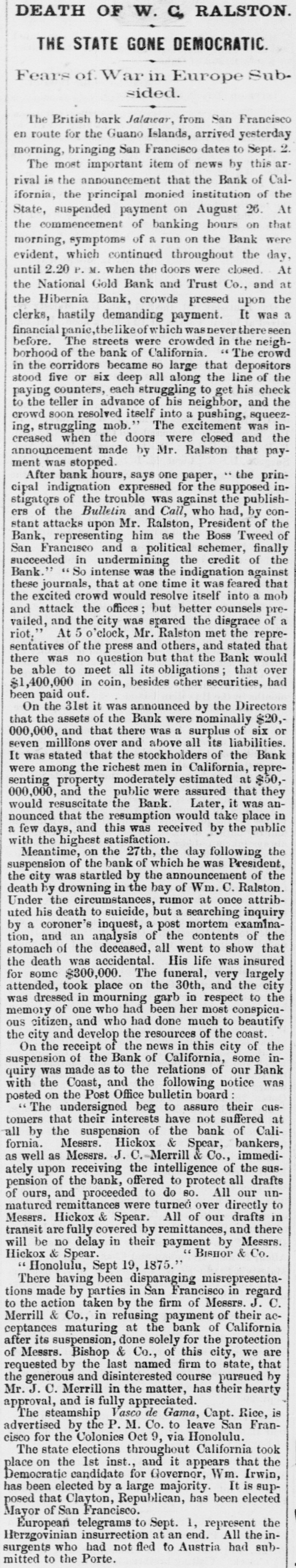 DEATH OF W. C, RALSTON. THE STATE GONE DEMOCRATIC. Fears of. War in Europe Subsided. The British bark Jalawar, from San Francisco en route for the Guano Islands, arrived yesterday morning, bringing San Francisco dates to Sept. 2. The most important item of news by this ar. rival is the announcement that the Bank of California, the principal monied institution of the State, suspended payment on August 26. At the commencement of banking hours on that morning, symptoms of a run on the Bank were evident, which continued throughout the day, until 2.20 P. M. when the doors were closed. At the National Gold Bank and Trust Co., and at the Hibernia Bank, crowds pressed upon the clerks, hastily demanding payment. It was a financial panie, the of hich was never thereseen before. The streets were crowded in the neighborhood of the bank of California. " The crowd in the corridors became 80 large that depositors stood five or six deep all along the line of the paying counters, each struggling to get his check to the teller in advance of his neighbor, and the crowd soon resolved itself into a pushing, squeezing, struggling mob." The excitement was increased when the doors were closed and the announcement made by Mr. Ralston that payment was stopped. After bank hours, says one paper, the principal indignation expressed for the supposed instigators of the trouble was against the publishers of the Bulletin and Call, who had, by constant attacks upon Mr. Ralston, President of the Bank, representing him as the Boss Tweed of San Francisco and a political schemer, finally succeeded in undermining the credit of the Bank." So intense was the indignation against these journals, that at one time it was feared that the excited crowd would resolve itself into a mob and attack the offices; but better counsels prevailed, and the city was spared the disgrace of a riot," At 5 o'clock, Mr. Ralston met the representatives of the press and others, and stated that there was no question but that the Bank would be able to meet all its obligations; that over $1,400,000 in coin, besides other securities, bad been paid out. On the 31st it was announced by the Directors that the assets of the Bank were nominally $20,000,000, and that there was a surplus of six or seven millions over and above all its liabilities. It was stated that the stockholders of the Bank were among the richest men in California, representing property moderately estimated at $50,000,000, and the public were assured that they would resuscitate the Bank. Later, it was announced that the resumption would take place in a few days, and this was received by the public with the highest satisfaction. Meantime, on the 27th, the day following the suspension of the bank of which he was President, the city was startled by the announcement of the death by drowning in the bay of Wm. C. Ralston. Under the circumstances, rumor at once attributed his death to suicide, but a searching inquiry by a coroner's inquest, a post mortem examination, and an analysis of the contents of the stomach of the deceased, all went to show that the death was accidental. His life was insured for some $300,000. The funeral, very largely attended, took place on the 30th, and the city was dressed in mourning garb in respect to the memory of one who had been her most conspicuous citizen, and who had done much to beautify the city and develop the resources of the coast. On the receipt of the news in this city of the suspension of the Bank of California, some inquiry was made as to the relations of our Bank with the Coast, and the following notice was posted on the Post Office bulletin board The undersigned beg to assure their customers that their interests have not suffered at all by the suspension of the bank of California. Messrs. Hickox & Spear, bankers, as well as Messrs. J. C.-Merrill & Co., immediately upon receiving the intelligence of the suspension of the bank, offered to protect all drafts of ours, and proceeded to do SO. All our unmatured remittances were turned over directly to Messrs. Hickox & Spear. All of our drafts in transit are fully covered by remittances, and there will be no delay in their payment by Messrs. " BISHOP & Co. Hickox & Spear. " Honolulu, Sept 19, 1875.' There having been disparaging misrepresentations made by parties in San Francisco in regard to the action taken by the firm of Messrs. J. C. Merrill & Co., in refusing payment of their acceptances maturing at the bank of California after its suspension, done solely for the protection of Messrs. Bishop & Co., of this city, we are requested by the last named firm to state, that the generous and disinterested course pursued by Mr. J. C. Merrill in the matter, has their hearty approval, and is fully appreciated. The steamship Vasco de Gama, Capt. Rice, is advertised by the P. M. Co. to leave San Francisco for the Colonies Oct 9, via Honolulu. The state elections throughout California took