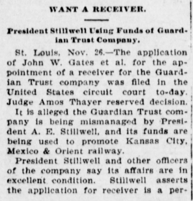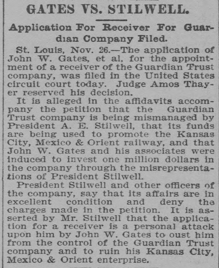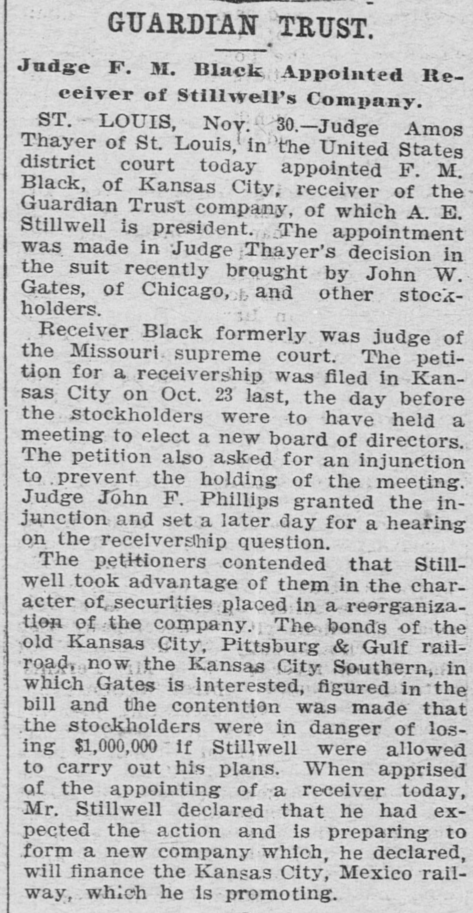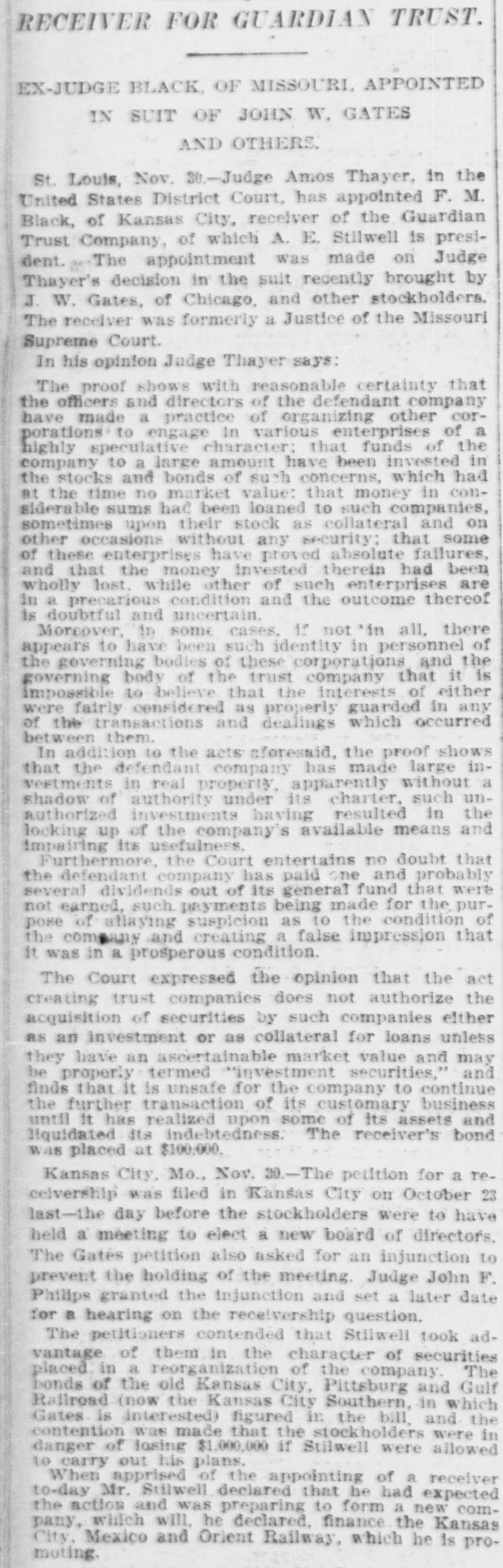 RECEIVER FOR GUARDIAN TRUST. EX-JUDGE BLACK OF MISSOURI. APPOINTED IN SUIT OF JOHN W. GATES AND OTHERS. St. Louis, Nov. 30.-Judge Amos Thayer, in the United States District Court, has appointed F. M. Black, of Kansas City, receiver of the Guardian Trust Company, of which A. E. Stilwell is president. The appointment was made on Judge Thayer's decision in the suit recently brought by J. W. Gates, of Chicago, and other stockholders. The receiver was formerly a Justice of the Missouri Supreme Court. In his opinion Judge Thayer says: The proof shows with reasonable certainty that the officers and directors of the defendant company have made a practice of organizing other corporations to engage in various enterprises of a highly speculative character: that funds of the company to a large amount have been invested in the stocks and bonds of such concerns, which had at the time no market value: that money in considerable sums hac been loaned to such companies, sometimes upon their stock as collateral and on other occasions without any security: that some of these enterprises have proved absolute failures, and that the money invested therein had been wholly lost. while other of such enterprises are in a precarious condition and the outcome thereof is doubtful and uncertain. Moreover, in some cases, if not'in all. there appears to have been such identity in personnel of the governing bodies of these corporations and the governing body of the trust company that it is impossible to believe that the interests of either were fairly considered as properly guarded in any of the transactions and dealings which occurred between them. In addition to the acts aforesaid, the proof shows that the defendant company has made large investments in real property apparently without a shadow of authority under its charter. such unauthorized investments having resulted in the locking up of the company's available means and impairing its usefulness. Furthermore, the Court entertains no doubt that the defendant company has paid one and probably several dividends out of its general fund that were not earned, such payments being made for the purpose of allaying suspicion as to the condition of the company and creating a false impression that it was in a prosperous condition. The Court expressed the opinion that the act creating trust companies does not authorize the acquisition of securities by such companies either as an investment or as collateral for loans unless they have an ascertainable market value and may be properly termed "investment securities," and finds that it is unsafe for the company to continue the further transaction of its customary business until it has realized upon some of its assets and liquidated its indebtedness The receiver's bond was placed at $100,000. Kansas City, Mo., Nov. -The petition for a recelvership was filed in Kansas City on October 23 last-the day before the stockholders were to have held a meeting to elect a new board of directors. The Gatés petition also asked for an injunction to prevent the holding of the meeting Judge John F. Philips granted the injunction and set a later date for a hearing on the receivership question. The petitioners contended that Stilwell took advantage of them in the character of securities placed in a reorganization of the company. The bonds of the old Kansas City, Pittsburg and Gulf Railroad (now the Kansas City Southern, in which Gates is interested) figured in the bill. and the contention was made that the stockholders were in danger of losing $1,000,000 if Stilwell were allowed to carry out his plans. When apprised of the appointing of a receiver to-day Mr. Stilwell declared that he had expected the action and was preparing to form a new company. which will. he declared, finance the Kansas City, Mexico and Orient Railway, which he is promoting.