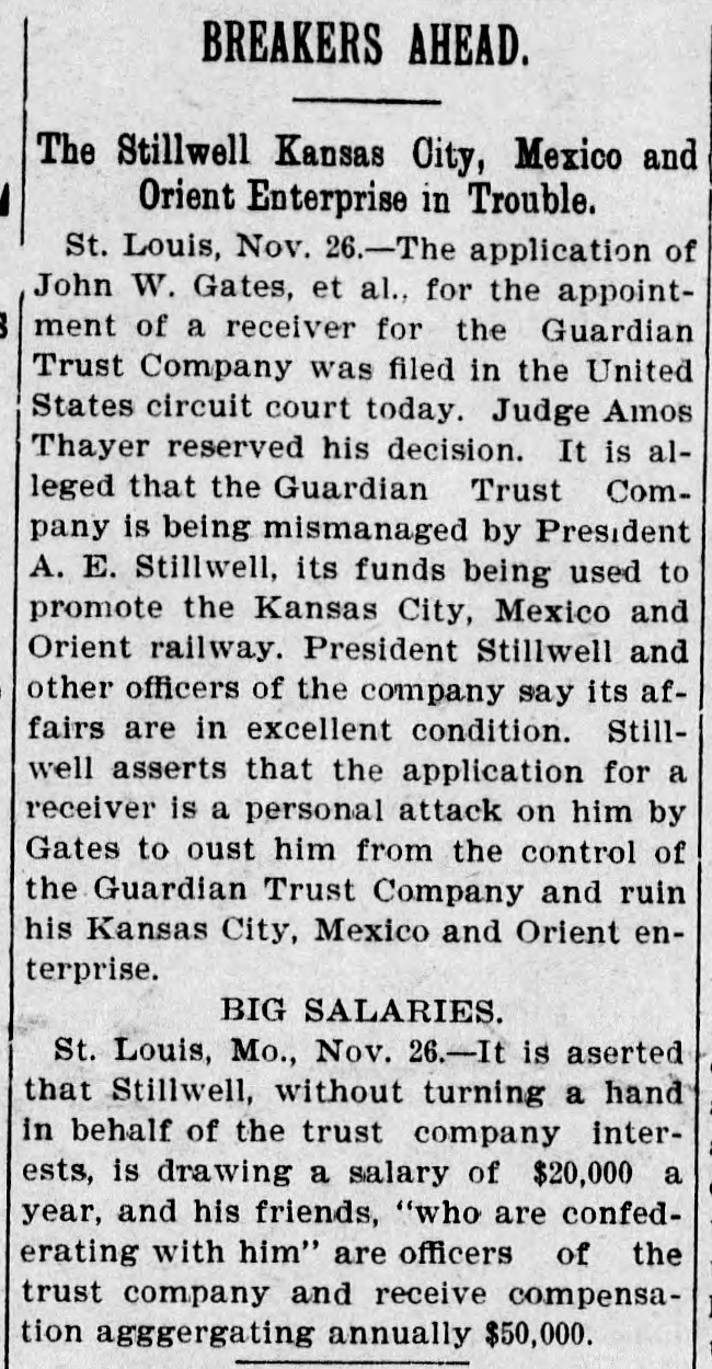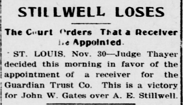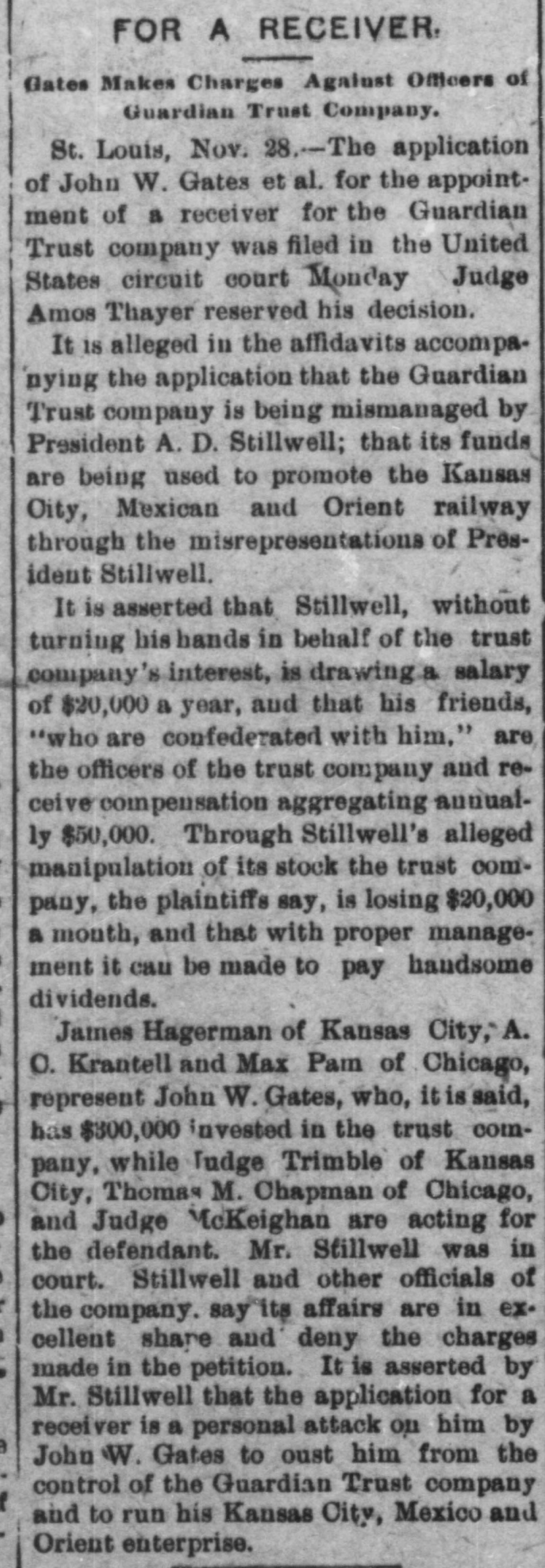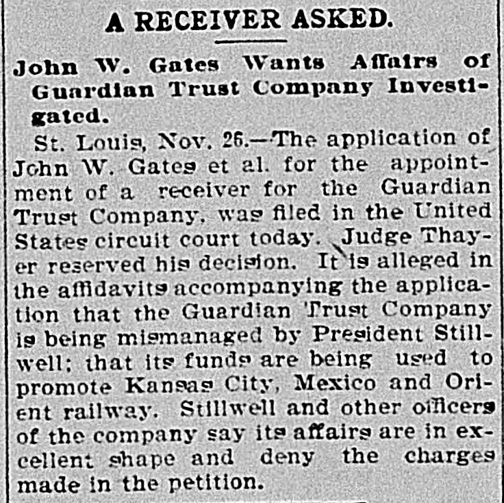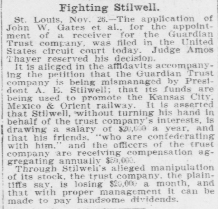 RECEIVER FOR GUARDIAN TRUST. EX-JUDGE BLACK OF MISSOURI. APPOINTED IN SUIT OF JOHN W. GATES AND OTHERS. St. Louis, Nov. 30.-Judge Amos Thayer, in the United States District Court, has appointed F. M. Black, of Kansas City, receiver of the Guardian Trust Company, of which A. E. Stilwell is president. The appointment was made on Judge Thayer's decision in the suit recently brought by J. W. Gates, of Chicago, and other stockholders. The receiver was formerly a Justice of the Missouri Supreme Court. In his opinion Judge Thayer says: The proof shows with reasonable certainty that the officers and directors of the defendant company have made a practice of organizing other corporations to engage in various enterprises of a highly speculative character: that funds of the company to a large amount have been invested in the stocks and bonds of such concerns, which had at the time no market value: that money in considerable sums hac been loaned to such companies, sometimes upon their stock as collateral and on other occasions without any security: that some of these enterprises have proved absolute failures, and that the money invested therein had been wholly lost. while other of such enterprises are in a precarious condition and the outcome thereof is doubtful and uncertain. Moreover, in some cases, if not'in all. there appears to have been such identity in personnel of the governing bodies of these corporations and the governing body of the trust company that it is impossible to believe that the interests of either were fairly considered as properly guarded in any of the transactions and dealings which occurred between them. In addition to the acts aforesaid, the proof shows that the defendant company has made large investments in real property apparently without a shadow of authority under its charter. such unauthorized investments having resulted in the locking up of the company's available means and impairing its usefulness. Furthermore, the Court entertains no doubt that the defendant company has paid one and probably several dividends out of its general fund that were not earned, such payments being made for the purpose of allaying suspicion as to the condition of the company and creating a false impression that it was in a prosperous condition. The Court expressed the opinion that the act creating trust companies does not authorize the acquisition of securities by such companies either as an investment or as collateral for loans unless they have an ascertainable market value and may be properly termed "investment securities," and finds that it is unsafe for the company to continue the further transaction of its customary business until it has realized upon some of its assets and liquidated its indebtedness The receiver's bond was placed at $100,000. Kansas City, Mo., Nov. -The petition for a recelvership was filed in Kansas City on October 23 last-the day before the stockholders were to have held a meeting to elect a new board of directors. The Gatés petition also asked for an injunction to prevent the holding of the meeting Judge John F. Philips granted the injunction and set a later date for a hearing on the receivership question. The petitioners contended that Stilwell took advantage of them in the character of securities placed in a reorganization of the company. The bonds of the old Kansas City, Pittsburg and Gulf Railroad (now the Kansas City Southern, in which Gates is interested) figured in the bill. and the contention was made that the stockholders were in danger of losing $1,000,000 if Stilwell were allowed to carry out his plans. When apprised of the appointing of a receiver to-day Mr. Stilwell declared that he had expected the action and was preparing to form a new company. which will. he declared, finance the Kansas City, Mexico and Orient Railway, which he is promoting.
