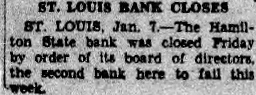 Article states the Hamilton State Bank in St. Louis was [closed] Friday by order of its board of directors, indicating a board-ordered/voluntary suspension that resulted in closure. No mention of a depositor run in the excerpt.