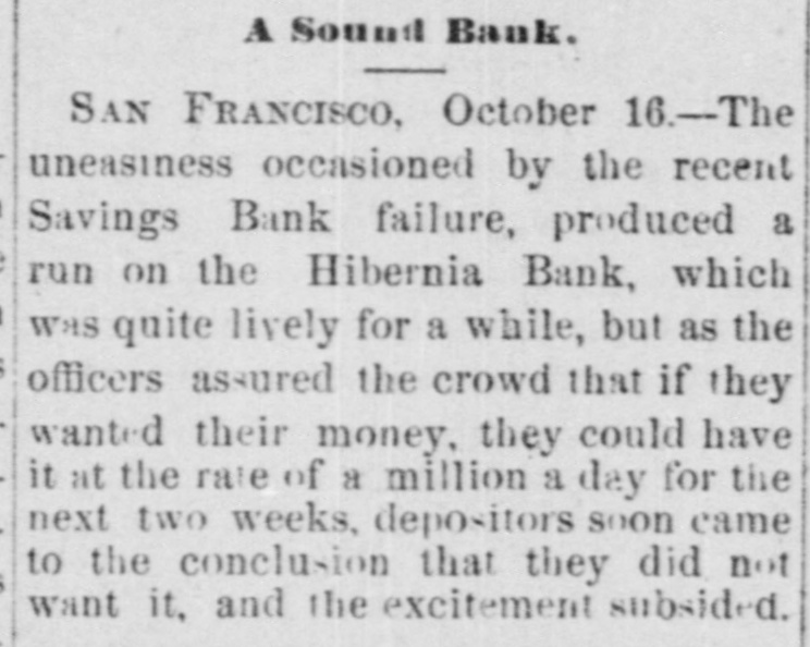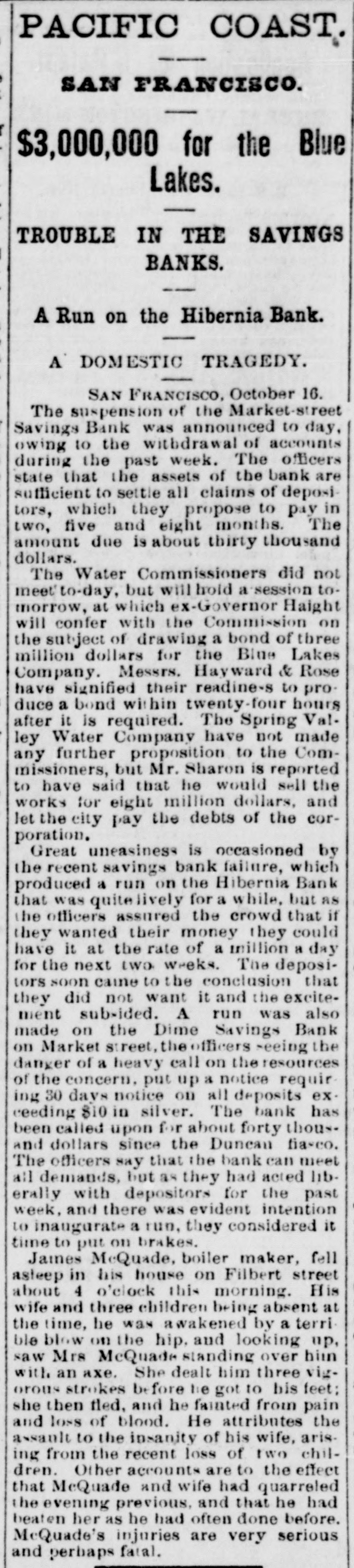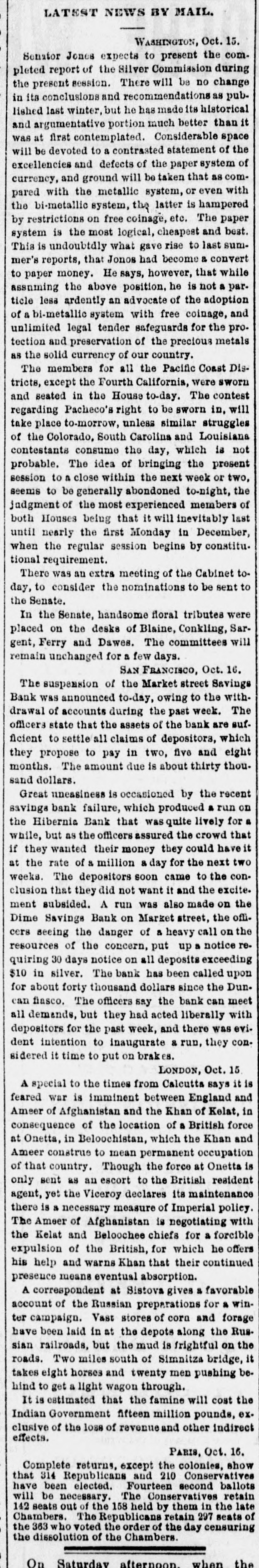 LATEST NEWS BY MAIL. WASHINGTON, Oct. 15. Senator Jones expects to present the completed report of the Silver Commission during the present session. There will be no change in its conclusions and recommendations as published last winter, but he has made its historical and argumentative portion much better than it was at first contemplated. Considerable space will be devoted to a contrasted statement of the excellencies and defects of the paper system of currency, and ground will be taken that as compared with the metallic system, or even with the bi-metallic system, the latter is hampered by restrictions on free coinage, etc. The paper system is the most logical, cheapest and best. This is undoubtdly what gave rise to last summer's reports, that Jonos had become a convert to paper money. He says, however, that while assuming the above position, he is not a particle less ardently an advocate of the adoption of a bi-metallic system with free coinage, and unlimited legal tender safeguards for the protection and preservation of the precious metals as the solid currency of our country. The members for all the Pacific Coast Districts, except the Fourth California, were sworn and seated in the House to-day. The contest regarding Pacheco's right to be sworn in, will take place to-morrow, unless similar struggles of the Colorado, South Carolina and Louisiana contestants consume the day, which is not probable. The idea of bringing the present session to a close within the next week or two, seems to be generally abondoned to-night, the judgment of the most experienced members of both Houses being that it will inevitably last until nearly the first Monday in December, when the regular session begins by constitu. tional requirement. There was an extra meeting of the Cabinet today, to consider the nominations to be sent to the Senate. In the Senate, handsome floral tributes were placed on the desks of Blaine, Conkling, Sargent, Ferry and Dawes. The committees will remain unchanged for a few days. SAN FRANCISCO, Oct. 16. The suspension of the Market street Savings Bank was announced to-day, owing to the withdrawal of accounts during the past week. The officers state that the assets of the bank are sufficient to settle all claims of depositors, which they propose to pay in two, five and eight months. The amount due is about thirty thousand dollars. Great uneasiness is occasioned by the recent savings bank failure, which produced a run on the Hibernia Bank that was quite lively for a while, but as the officers assured the crowd that if they wanted their money they could have it at the rate of & million & day for the next two weeks. The depositors soon came to the conclusion that they did not want it and the excite. ment subsided. A run was also made on the Dime Savings Bank on Market street, the officers seeing the danger of a heavy call on the resources of the concern, put up a notice requiring 30 days notice on all deposits exceeding $10 in silver. The bank has been called upon for about forty thousand dollars since the Duncan fiasco. The officers say the bank can meet all demands, but they had acted liberally with depositors for the past week, and there was evident intention to inaugurate & run, they considered it time to put on brakes. LONDON, Oct. 15 A special to the times from Calcutta says it is feared war is imminent between England and Ameer of Afghanistan and the Khan of Kelat, in consequence of the location of a British force at Onetta, in Beloochistan, which the Khan and Ameer construe to mean permanent occupation of that country. Though the force at Onetta is only sent as an escort to the British resident agent, yet the Viceroy declares its maintenance there is & necessary measure of Imperial policy. The Ameer of Afghanistan is negotiating with the Kelat and Beloochee chiefs for a forcible expulsion of the British, for which he offers his help and warns Khan that their continued presence means eventual absorption. A correspondent at Sistova gives a favorable account of the Russian preparations for a winter campaign. Vast stores of corn and forage have been laid in at the depots along the Russian railroads, but the mud is frightful on the roads. Two miles south of Simnitza bridge, it takes eight horses and twenty men pushing behind to get a light wagon through. It is estimated that the famine will cost the Indian Government fifteen million pounds, ex. clusive of the loss of revenue and other indirect effects. PARIS, Oct. 16. Complete returns, except the colonies, show that 314 Republicans and 210 Conservatives have been elected. Fourteen second ballots will be necessary. The Conservatives retain 142 seats out of the 158 held by them in the late Chambers. The Republicans retain 297 seats of the 363 who voted the order of the day censuring the dissolution of the Chambers. On Saturday afternoon. when the
