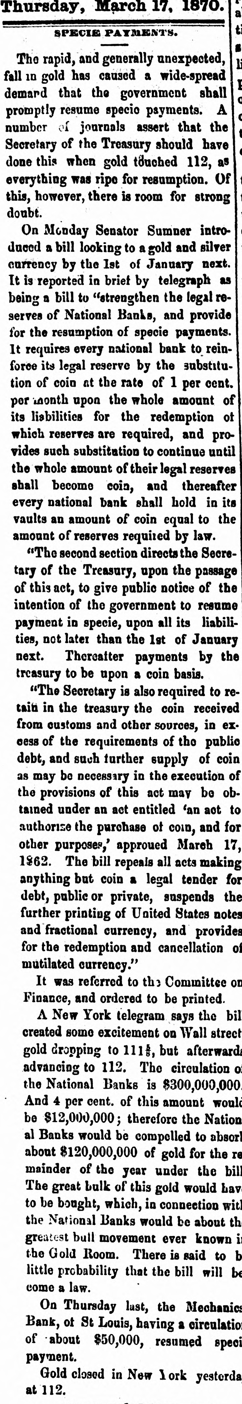 Thursday, March 17, 1870. a t SPECIE PAYMENTS. . The rapid, and generally unexpected, li fall in gold has caused a wide-spread I demard that the government shall d promptly resume specio payments. A d number of journals assert that the Secretary of the Treasury should have done this when gold touched 112, as everything was ripe for resumption. Of this, however, there is room for strong doubt. On Monday Senator Summer introduced a bill looking to a gold and silver currency by the 1st of January next. It is reported in brief by telegraph as being a bill to "strengthen the legal reserves of National Banks, and provide for the resumption of specie payments. It requires every national bank to reinforce its legal reserve by the substitution of coin at the rate of 1 per cent. per month upon the whole amount of its liabilities for the redemption of which reserves are required, and provides such substitution to continue until the whole amount of their legal reserves shall become coin, and thereafter every national bank shall hold in its vaults an amount of coin equal to the amount of reserves required by law. "The second section directs the Secretary of the Treasury, upon the passage of this act, to give public notice of the intention of the government to resume payment in specie, upon all its liabilities, not later than the 1st of January next. Thereafter payments by the treasury to be upon a coin basis. "The Secretary is also required to retain in the treasury the coin received from customs and other sources, in exof the requirements of the public debt, and such further supply of coin as may be necessary in the execution of the provisions of this act may be obtained under an act entitled 'an act to authorise the purchase of coin, and for other purposes,' approued March 17, 1962. The bill repeals all acts making anything but coin a legal tender for debt, public or private, suspends the further printing of United States notes and fractional currency, and provides for the redemption and cancellation of mutilated currency." It was referred to the Committee on Finance, and ordered to be printed. A New York telegram says the bill created some excitement on Wall street gold dropping to 111 but afterward advancing to 112. The circulation o the National Banks is $300,000,000 And 4 per cent. of this amount would be $12,000,000; therefore the Nation al Banks would be compelled to absor about $120,000,000 of gold for the re mainder of the year under the bill The great bulk of this gold would hav to be bought, which, in connection with the National Banks would be about th greatest bull movement ever known i the Gold Room. There is said to b little probability that the bill will be come a law. On Thursday last, the Mechanics Bank, of St Louis, having a circulatio of about $50,000, resumed speci payment. Gold closed in New York yesterda at 112.