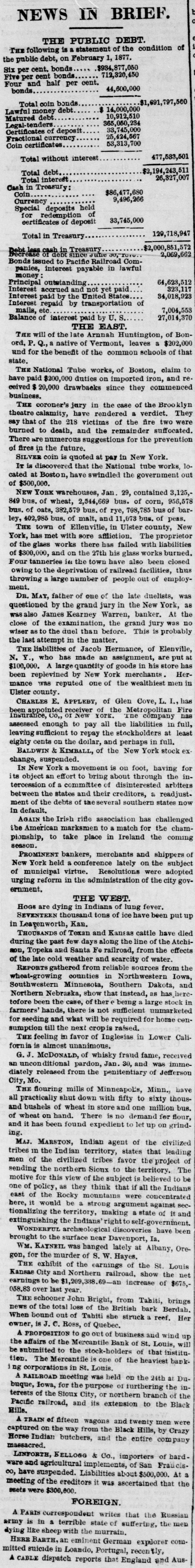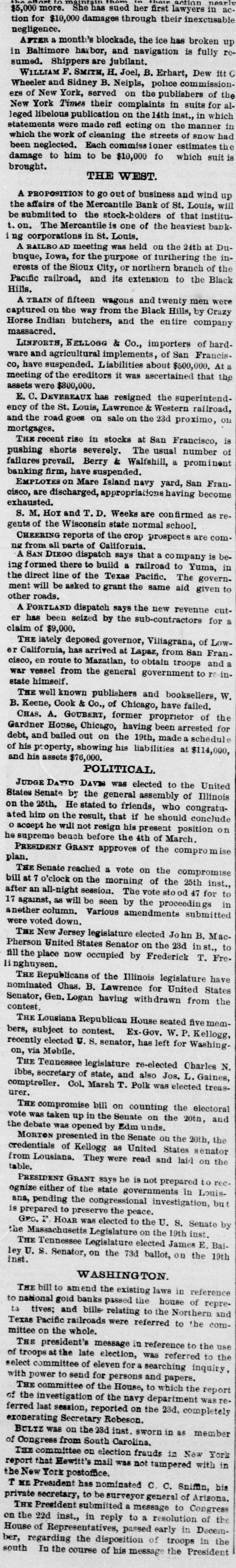 their action near $5,000 more. She has sued her first lawyers in action for $10,000 damages through their inexcusable negligence. AFTER a month's blockade, the ice has broken up in Baltimore harbor, and navigation is fully resumed. Shippers are jubilant. WILLIAM F. SMITH, H. Joel, B. Erhart, Dew itt C Wheeler and Sidney B. Neipls, police commissioners of New York, served on the publishers of the New York Times their complaints in suits for alleged libelous publication on the 14th inst., in which statements were made refl ecting on the manner in which the work of cleaning the streets of snow had been neglected. Each commiss ioner estimates the damage to him to be $10,000 fo which suit is brought. THE WEST. A PROPOSITION to go out of business and wind up the affairs of the Mercantile Bank of St. Louis, will be submitted to the stock-holders of that institut.on. The Mercantile is one of the heaviest banking corporations in St. Louis. A RAILRO AD meeting was held on the 24th at Dubuque, Iowa, for the purpose of furthering the inerests of the Sioux City, or northern branch of the Pacific railroad, and its extension to the Black Hills. A TRAIN of fifteen wagons and twenty men were captured on the way from the Black Hills, by Crazy Horse Indian butchers, and the en tire company massacred. LINFORTH, BELLOGG & Co., importers of hardware and agricultural implements, of San Francisco, have suspended. Liabilities about $500,000. At meeting of the ereditors it was ascertained that the assets were $800,000. E. C. DEVEREAUX has resigned the superintendency of the St. Louis, Lawrence & Western railroad, and the road goes on sale on the 23d proximo, Oli mortgages. THE recent rise in stocks at San Francisco, is pushing shorts severely. The usual number of failures prevail. Berry & Walfshill, a prominent banking firm, have suspended. EMPLOYES on Mare Island navy yard, San Francisco, are discharged, appropriations having become exhausted. S. M. Hox and T. D. Weeks are confirmed as regents of the Wisconsin state normal school. CHEERING reports of the crop prospects are comng from all parts of California. A SAN DIEGO dispatch says that a CO mpany is being formed there to build a railroad to Yuma, in the direct line of the Texas Pacific. The government will be asked to grant the same aid given to other roads. A PORTLAND dispatch says the new revenue cuter has been seized by the sub-contractors for a claim of $9,000. THE lately deposed governor, Viliagrana, of Lower California, has arrived at Lapaz, from San Francisco, en route to Mazatlan, to obtain troops and war vessel from the general government to re instate himself. THE well known publishers and booksellers, W. B. Keene, Cook & Co., of Chicago, have failed. CHAS. A. GOUBERT, former proprietor of the Gardner House, Chicago, having been arrested for debt, and bailed out on the 19th, made a schedule of his property, showing his liabilities at $114,000, and his assets $76,000. POLITICAL. JUDGE DANID DAVES was elected to the United States Senate by the general assembly of Illinois on the 25th. He stated to friends, who congratuated him on the result, that if he should conclude o accept he will not resign his present position on he supreme bench before the 4th of March. PRESIDENT GRANT approves of the comprom ise plan. THE Senate reached a vote on the compromise bill at 7 o'clock on the morning of the 25th inst., after an all-night session. The vote sto od 47 for to 17 against, as will be seen by the proceedings in another column. Various amendments submitte were voted down. THE New Jersey legislature elected Jo hn B. MacPherson United States Senator on the 23d inst., to fill the place now occupied by Frederick T. Freli nghuysen. THE Republicans of the Illinois legislature have nominated Chas. B. Lawrence for United States Senator, Gen. Legan having withdrawn from the contest. THE Lousiana Republican House seated five members, subject to contest. Ex-Gov. W. P. Kellogg, recently elected U. S. senator, has left for Washingon, via Mobile. THE Tennessee legislature re-elected Charles N. ibbs, secretary of state, and also Jos. L. Gaines, urer. comptreller. Col. Marsh T. Polk was elected treasTHE compromise bill on counting the electoral vote was taken up in the Senate on the 20tn, and the debate was opened by Edm unds. MORTON presented in the Senate on the 20th, the credentials of Kellogg as United States senator from Lousiana. They were read and laid on the table. PRESIDENT GRANT says he is not prepared to recognize either of the state governments in Louisana, pending the congressional investigation, bu is prepared to preserve the peace. Gro. F. HOAR was elected to the U. S. Senate by the Massachusetts Legislature on the 19th inst. THE Tennessee Legislature elected James E. Baiinst. ley U. S. Senator, on the 73d ballot, on the 19th WASHINGTON. THE bill to amend the existing laws in reference to national gold banks passed the house of repreta tives; and bills relating to the Northern and Texas Pacific railroads were referred to the committee on the whole. THE president's message in reference to the use of troops at the late election, was referred to the select committee of eleven for a searching inquiry, with power to send for persons and papers. THE committee of the House, to which the report of the investigation of the navy department was referred last session, reported on the 23d, completely exonerating Secretary Robeson. BULTZ was on the 23d inst. sworn in as member of Congress from South Carolina. THE committee on election frauds in New York report that Hewitt's mail was not tampered with in the New York postoffice. T ME President has nominated C. C. Sniffin, his private secretary, to be surveyor general of Arizona. THE President submitted a message to Congress on the 22d inst., in reply to a resolution of the House of Representatives, passed early in December, regarding the disposition of troops in the south In the course of his message the President