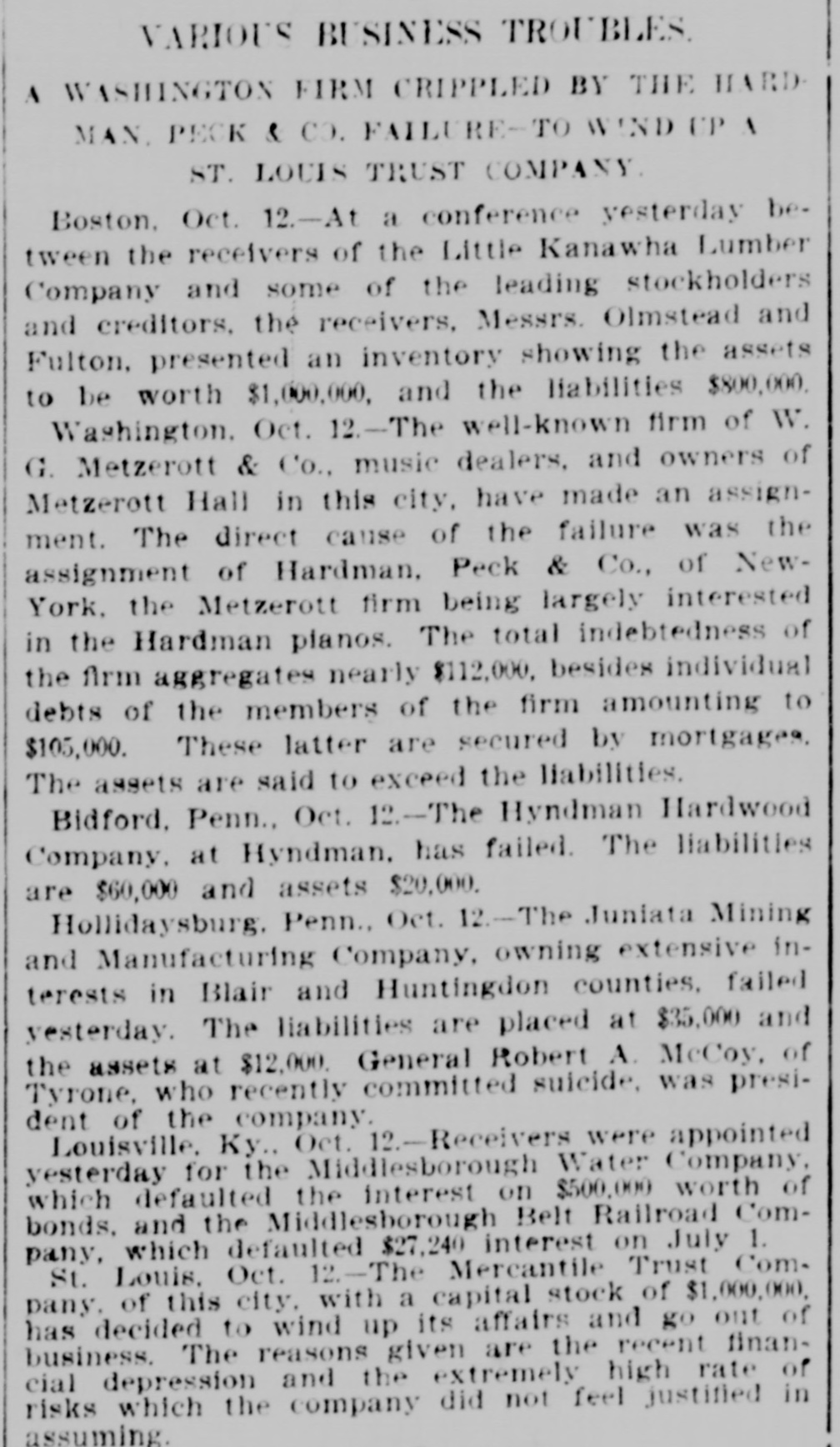 VARIOUS BUSINESS TROUBLES. A WASHINGTON FIRM CRIPPLED BY THE HARDMAN. PECK & CO. FAILURE-TO WIND UP \ ST. LOUIS TRUST COMPANY Boston. Oct. 12.-At a conference yesterday between the receivers of the Little Kanawha Lumber Company and some of the leading stockholders and creditors, the receivers, Messrs. Olmstead and Fulton, presented an inventory showing the assets to be worth $1,000,000, and the liabilities $800,000. Washington. Oct. 12.-The well-known firm of W. G. Metzerott & Co., music dealers, and owners of Metzerott Hall in this city, have made an assignment. The direct cause of the failure was the assignment of Hardman, Peck & Co., of NewYork, the Metzerott firm being largely interested in the Hardman planos. The total indebtedness of the firm aggregates nearly $112,000, besides individual debts of the members of the firm amounting to $105,000. These latter are secured by mortgages. The assets are said to exceed the liabilities. Bidford. Penn., Oct. 12.-The Hyndman Hardwood Company, at Hyndman. has failed. The liabilities are $60,000 and assets $20,000. Hollidaysburg. Penn., Oct. 12.-The Juniata Mining and Manufacturing Company, owning extensive interests in Blair and Huntingdon counties, failed yesterday. The liabilities are placed at $35,000 and the assets at $12,000. General Robert A. McCoy, of Tyrone, who recently committed suicide, was president of the company. Louisville. Ky., Oct. 12.-Receivers were appointed yesterday for the Middlesborough Water Company, which defaulted the interest on $500,000 worth of bonds, and the Middlesborough Belt Railroad Company, which defaulted $27,240 interest on July 1. St. Louis. Oct. 12.-The Mercantile Trust Company, of this city, with a capital stock of $1,000,000, has decided to wind up its affairs and go out of business. The reasons given are the recent financial depression and the extremely high rate of risks which the company did not feel justified in assuming.