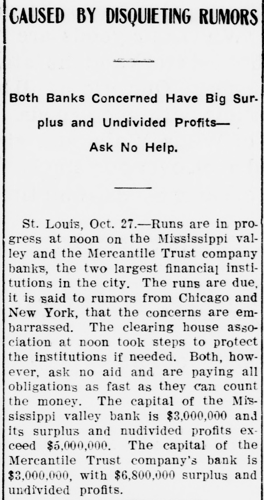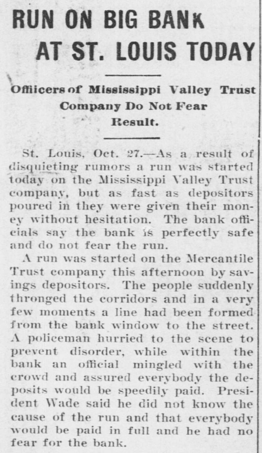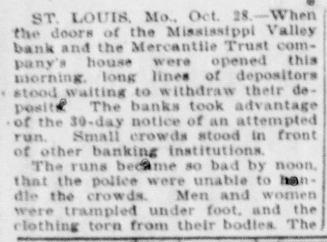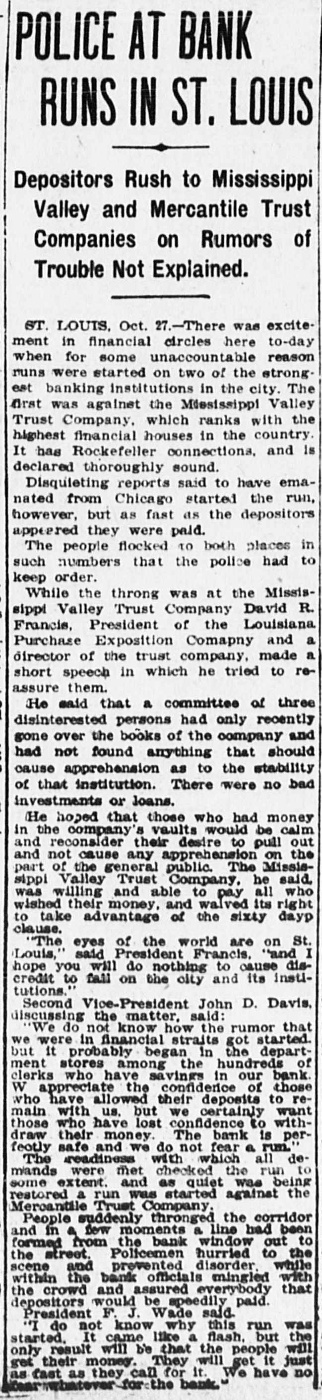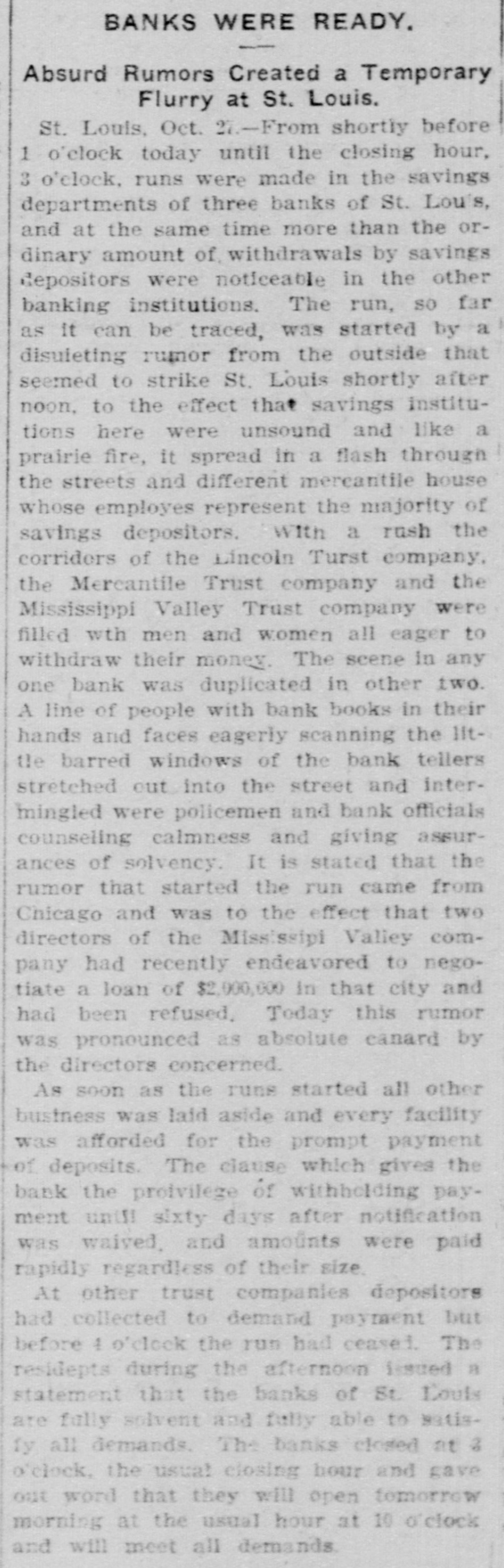 CLAMOR FOR MONEY KEPT FORCES OF ST. LOUIS BANK. ING CONCERNS BUSY. MANY WANTED TO WITHDRAW THE SAVINGS THAT THEY HAD PLACED ON DEPOSIT. Trust Companies Took Advantage of the Time Limit Clause and Demanded Notice of Withdrawal. Aid Was Offered from Other Cities, but Declined-Oflicials Think the Unnecessary Panic Has Been Relieved-Greater Confidence Shown. St. Louis, Oct. 28.-The statement of President Julius S. Walsh of the Mississippi Valley Trust Company, whose sentiments are echoed by other trust company officials of St. Louis, that "the situation is thoroughly in hand, the excitment has subsided and from this on we expect business will be conducted in the usual orderly manner," expresses the opinion that prevailed to-night after the unwonted finacial conditions which prevailed here part of yesterday and to-day. Officials of all the trust companies state that voluntary offers of help were received from financial instiutions in New York, Philadelphia, Chicago, New Orleans, Kansas City, Boston and many of the smaller towns of Missouri and Illinois, but were all declined for the reason that they had sufficient cash with which to handle their business. Expressions of confidence and offers of aid on the part of national banks, financial and other institutions of St. Louis have helped to stregthen the situation and restore confidence. Long before 10 o'clock, the hour of opening, lines of depositors stretched away from the closed doors of the Mississippi Valley Trust Company, the Lincoln Trust Company, the Mercantile Trust Company, and the Missouri Trust Company. Small crowds were assembled before the doors of some of the other savings institutions also. It was observed that most of those in line were working people and many of them women, whose savings were not heavy. Owing to the action taken last night by the officials of the eight trust companies doing business in St. Louis, requiring thirty and sixty day notices of intention to withdraw funds, depositors were not able to get any money. All they could do was to declare their intention of withdrawing their deposits at the expiration of the time limit. Surged Into the Building. The greatest crush was before the doors of the Mercantile Trust Company on Eighth and Locust streets. At 9 o'clock the doors were opened and the crowd surged in with a force that swept aside the lines of police and bank employes formed to preserve a regular line to the windows of the paying tellers. The policemen were unable to handle the crowds and Festus J. Wade, president of the Mercantile Trust Company, mounted a chair and made a statement that unless the depositors formed in line they would all be ejected from the building. He explained that it was impossible to wait on them if they insisted on crowding in such a manner. This announcement had the desired effect, and some semblance of order was restored. By 10 o'clock the crowd around the trust company's building had increased to such an extent that the police were totally unable to control it, and the officers stationed at the doors were swept away from their stations almost as rapidly as they could regain them. Women, who constituted a large percentage of the crowd, were crushed in the jam, and in the struggle their dresses were torn and their hats knocked off. The policemen, in trying to handle the crowd, pushed many of them into the gutter, and in several instances personal fights were averted only by the interposition of cooler persons. Shortly after the doors of the Mercantile Trust Company were opened the streets were crowded for a distance of several hundred feet, and all efforts to keep them clear were practically abandoned, while the police directed their efforts chiefly toward maintaining some degree of order at the doors. Began to Grow Easy in Mind. At 1 o'clock in the afternoon the uneasiness of small depositors in the trust companies seemed to have been removed. At this hour there were only a few depositors withdrawing daily balance accounts or giving notice of withdrawal of saving deposits at the Mercantile and the Mississippi Valley companies. Many persons who withdrew money yesterday deposited it again to-day, and in some instances new savings accounts were opened. Officers of the different institutions made reassuring speeches to the depositors before their doors, and this helped to send others away. The arrival of several boxes of gold and silver in express wagons, guarded by armed offidegree