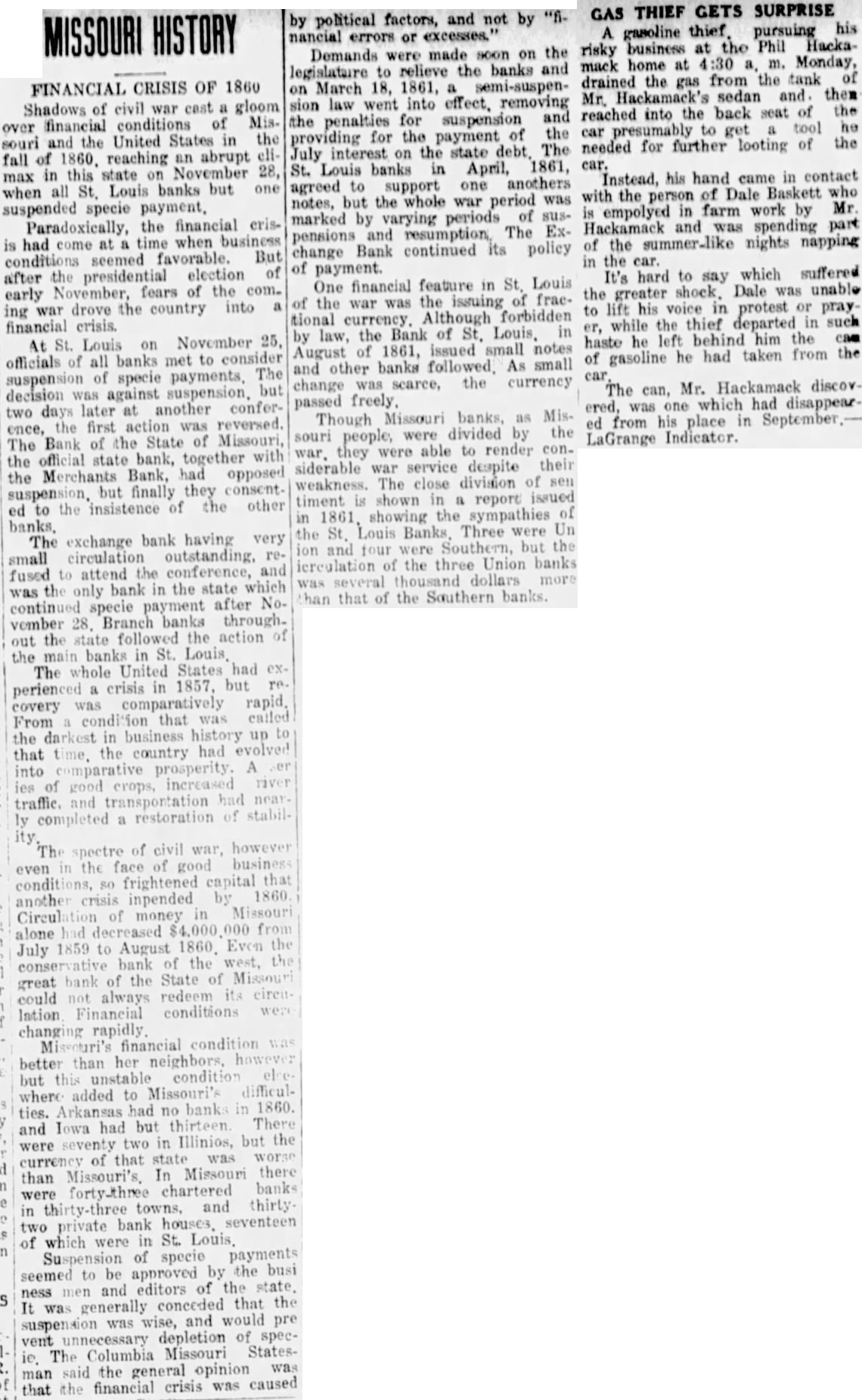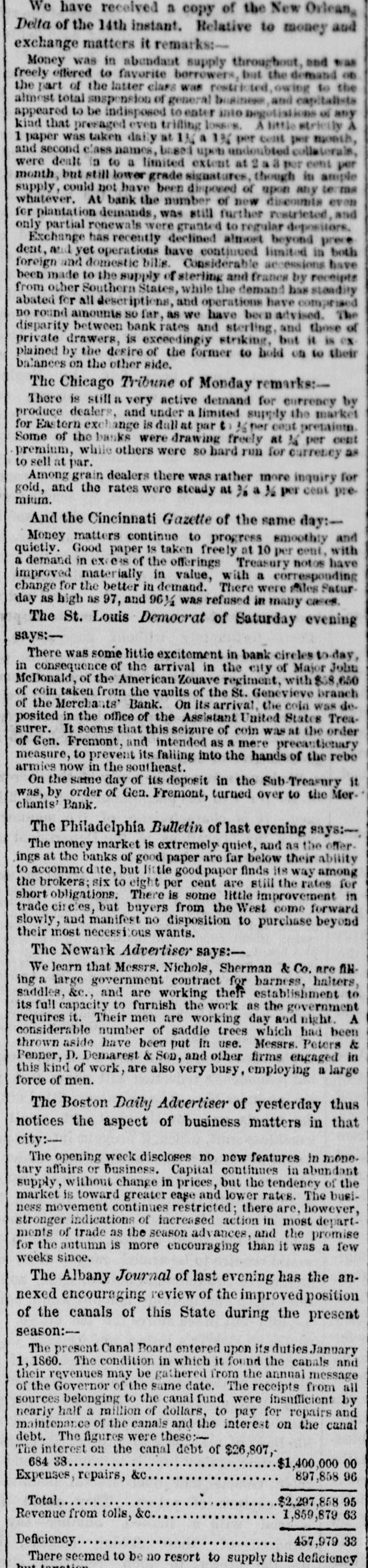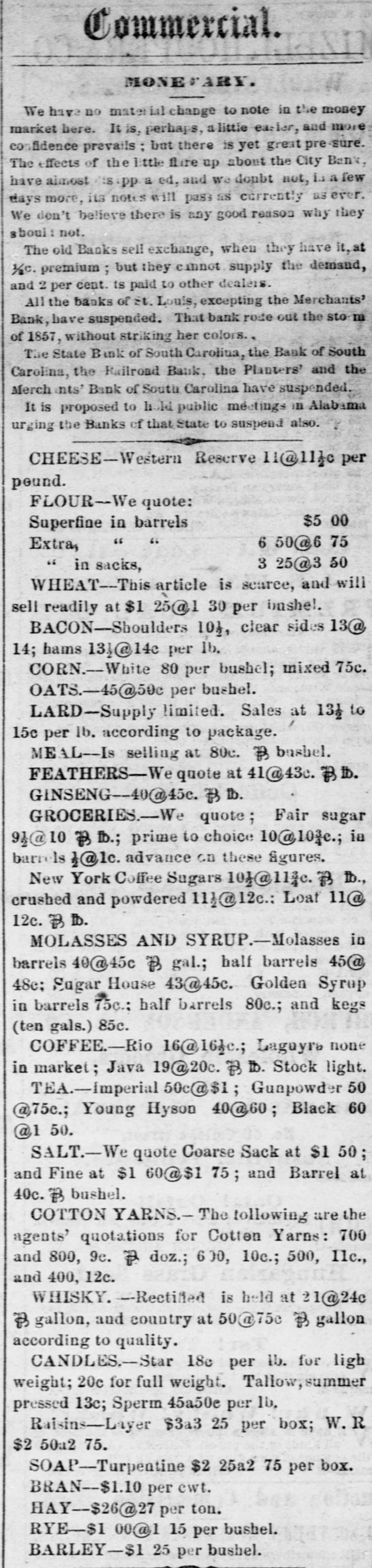 Commercial. MONEVARY. We have no material change to note in the money market here. It is, perhaps, alittle easier, and more confidence prevails; but there is yet great pre sure. The effects of the little flire up about the City Bank, have almost is PP a ed, and we doubt not, is a few days more, its notes will pass as currently as ever. We don't believe there is any good reason why they shoul not. The old Banks sell exchange, when they have it, at 1/2c. premium; but they cannot supply the demand, and 2 per cent. ts paid to other dealers. All the banks of St. Louis, excepting the Merchants' Bank, have suspended. That bank rode out the sto m of 1857, without striking her colors., The State Bank of South Carolina, the Bank of South Carolina, the Railroad Bank, the Planters' and the Merch ints' Bank of South Carolina have suspended It is proposed to hold public méetings in Alabama urging the Banks of that State to suspend also. CHEESE-Western Reserve 11@11}c per pound. FLOUR-We quote: $5.00 Superfine in barrels " " 6 50@6 75 Extra, 3 25@3 50 " in sacks, WHEAT--This article is searce, and will sell readily at $1 25@1 30 per bushel. BACON--Shoulders 10}, clear sides 13@ 14; hams 13}@14c per 1b. CORN.-White 80 per bushel; mixed 75c. OATS.-45@59c per bushel. LARD-Supply limited. Sales at 13½ to 15c per lb. according to package. MEAL-Is selling at 80c. B bushel. FEATHERS-We quote at 41@43c. ฿ ₺. GINSENG--40@45c. B lb. GROCERIES.-We quote; Fair sugar 9}@10 B fb.; prime to choice 10@10}c.; in barrels }@1c. advance on these figures. New York Coffee Sugars 10}@11żc. B lb., crushed and powdered 11}@12c.: Loaf 11@ 12c. B Ib. MOLASSES AND SYRUP.-Molasses in barrels 40@45c B gal.; half barrels 45@ 48c; Sugar House 43@45c. Golden Syrup in barrels 75c.: half barrels 80c.; and kegs (ten gals.) 85c. COFFEE.-Rio 16@16}c.; Laguyra none in market; Java 19@20c. B lb. Stock light. TEA.-Imperial 50c@$1; Gunpowder 50 @75c.; Young Hyson 40@60; Black 60 @1 50. SALT.-We quote Coarse Sack at $1 50 and Fine at $1 60@$1 75; and Barrel at 40c. B bushel. COTTON YARNS.-The tollowing are the agents' quotations for Cotten Yarns: 700 and 800, 9c. P doz.; 600, 10c.; 500, Ilc., and 400, 12c. WHISKY.--Rectifled is held at 21@24c B gallon, and country at 50@75c B gallon according to quality. CANDLES.-Star 18c per 1b. for ligh weight; 20c for full weight. Tallow, summer pressed 13c; Sperm 45a50e per 1b, Raisins-Layer $3a3 25 per box; W.R $2 50a2 75. SOAP-Turpentine $2 25a2 75 per box. BRAN-$1.10 per cwt. HAY-$26@27 per ton. RYE-$1 00@1 15 per bushel. BARLEY-$1 25 per bushel.