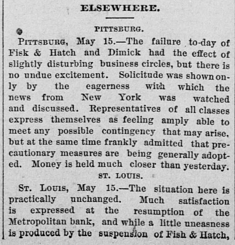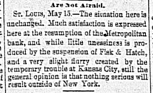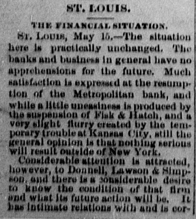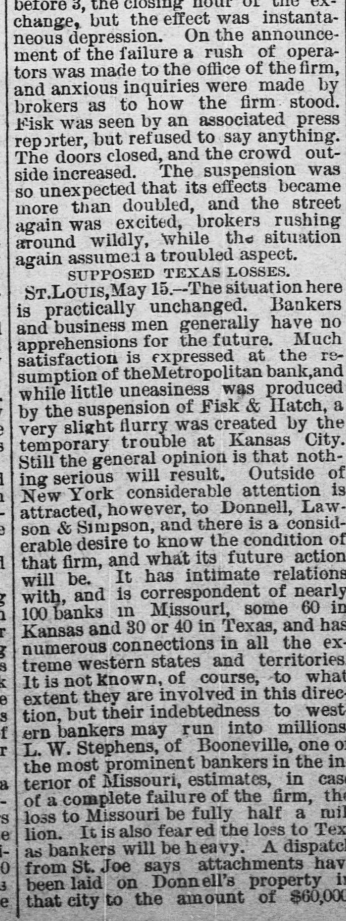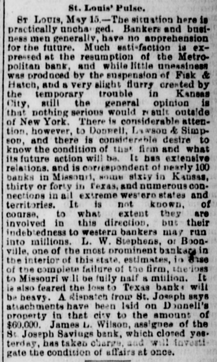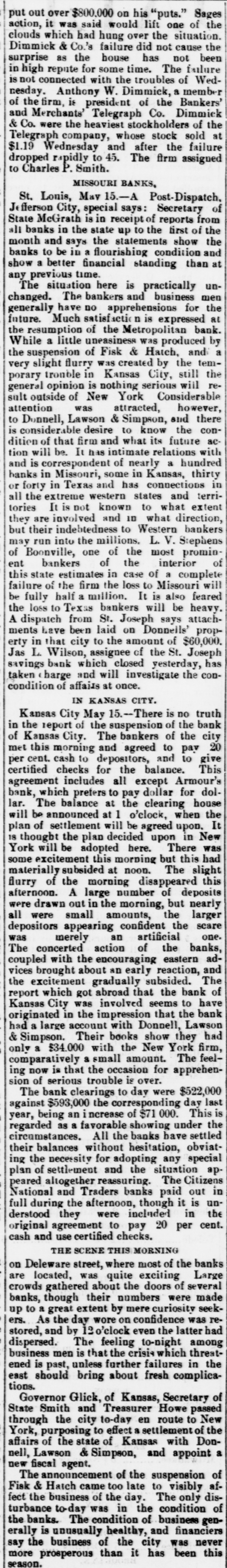 put out over $800,000 on his "puts." Sages action, it was said would lift one of the clouds which had hung over the situation. Dimmick & Co.'s failure did not cause the surprise as the house has not been in high repute for some time. The failure is not connected with the troubles of Wednesday. Anthony W. Dimmick, a member of the firm, is president of the Bankers' and Merchants' Telegraph Co. Dimmick & Co. were the heaviest stockholders of the Telegraph company, whose stock sold at $1.19 Wednesday and after the failure dropped rapidly to 45. The firm assigned to Charles P. Smith. MISSOURI BANKS, St. Lonis, May 15.-A Post-Dispatch, Jefferson City, special says: Secretary of State McGrath is in receipt of reports from all banks in the state up to the tirst of the month and says the statements show the banks to be in a flourishing condition and show a better financial standing than at any previous time. The situation here is practically unchanged. The bankers and business men generally have no apprehensions for the future. Much satisfactic n is expressed at the resumption of the Metropolitan bank. While a little uneasiness was produced by the suspension of Fisk & Hatch, and a very slight flurry was created by the temporary tronble in Kansas City, still the general opinion is nothing serious will result outside of New York Considerable attention was attracted, however, to Donnell, Lawson & Simpson, and there is considerable desire to know the condition of that firm and what its future action will be. It has intimate relations with and is correspondent of nearly a hundred banks in Missouri, some in Kansas, thirty or forty in Texas and has connections in all the extreme western states and territories It is not known to what extent they are involved and in what direction, but their indebtedness to Western bankers may run into the millions. L. V. Stephens of Boonville, one of the most prominent bankers of the interior of this state estimates in case of a complete failure of the firm the loss to Missouri will be fully half a million. It is also feared the loss to Texas bankers will be heavy. A dispatch from St. Joseph says attachments have been laid on Donnells' property in that city to the amount of $60,000. Jas L. Wilson, assignee of the St. Joseph savings bank which closed yesterday, has taken harge and will investigate the concondition of affairs at once. IN KANSAS CITY. Kansas City May 15.-There is no truth in the report of the suspension of the bank of Kansas City. The bankers of the city met this morning and agreed to pay 20 per cent. cash to depositors, and to give certified checks for the balance. This agreement includes all except Armour's bank, which prefers to pay dollar for dollar. The balance at the clearing house will be announced at 1 o'clock, when the plan of settlement will be agreed upon, It 18 thought the plan decided upon in New York will be adopted here. There was some excitement this morning but this had materially subsided at noon. The slight flurry of the morning disappeared this afternoon. A large number of deposits were drawn out in the morning, but nearly all were small amounts, the larger depositors appearing confident the scare was merely an artificial one. The concerted action of the banks, coupled with the encouraging eastern advices brought about an early reaction, and the excitement gradually subsided. The report which got abroad that the bank of Kansas City was involved seems to have originated in the impression that the bank had a large account with Donnell, Lawson & Simpson. Their books show they had only a $34.000 with the New York firm, comparatively a small amount. The feeling now is that the occasion for apprehension of serious trouble is over. The bank clearings to day were $522,000 against $593,000 the corresponding day last year, being an increase of $71 000. This is regarded as a favorable showing under the circumstances. All the banks have settled their balances without hesitation, obviating the necessity for adopting any special plan of settlement and the situation appeared altogether reassuring. The Citizens National and Traders banks paid out in full during the afternoon, though it is understood they were included in the original agreement to pay 20 per cent. cash and use certified checks. THE SCENE THIS MORNING on Deleware street, where most of the banks are located, was quite exciting Large crowds gathered about the doors of several banks, though their numbers were made up to a great extent by mere curiosity seekers. As the day wore on confidence was restored, and by 12 o'clock even the latter had dispersed. The feeling to-night among business men is that the crisis which threatened is past, unless further failures in the east should bring about fresh complications. Governor Glick, of Kansas, Secretary of State Smith and Treasurer Howe passed through the city to-day en route to New York, purposing to effect a settlement of the affairs of the state of Kansas with Donnell, Lawson & Simpson, and appoint a new fiscal agent. The announcement of the suspension of Fisk & Hatch came too late to visibly affect the business of the day. The only disturbance to-day was in the condition of the banks. The condition of business generally is unusually healthy, and financiers say the business of the city was never more prosperous than it has been this