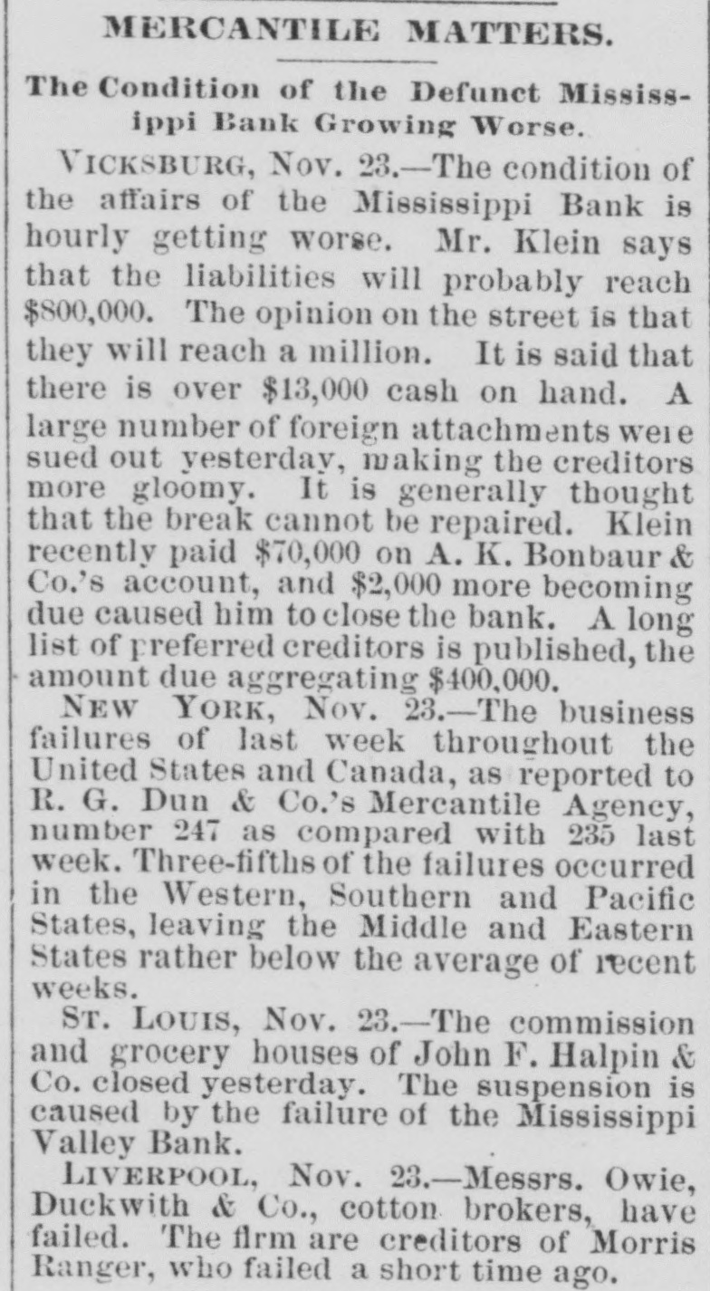 MERCANTILE MATTERS. The Condition of the Defunct Mississippi Bank Growing Worse. VICKSBURG, Nov. 23.-The condition of the affairs of the Mississippi Bank is hourly getting worse. Mr. Klein says that the liabilities will probably reach $800,000. The opinion on the street is that they will reach a million. It is said that there is over $13,000 cash on hand. A large number of foreign attachments were sued out yesterday, making the creditors more gloomy. It is generally thought that the break cannot be repaired. Klein recently paid $70,000 on A. K. Bonbaur & Co.'s account, and $2,000 more becoming due caused him to close the bank. A long list of preferred creditors is published, the amount due aggregating $400,000. NEW YORK, Nov. 23.-The business failures of last week throughout the United States and Canada, as reported to R. G. Dun & Co.'s Mercantile Agency, number 247 as compared with 235 last week. Three-fifths of the failures occurred in the Western, Southern and Pacific States, leaving the Middle and Eastern States rather below the average of recent weeks. ST. LOUIS, Nov. 23.-The commission and grocery houses of John F. Halpin & Co. closed yesterday. The suspension is caused by the failure of the Mississippi Valley Bank. LIVERPOOL, Nov. 23.-Messrs. Owie, Duckwith & Co., cotton brokers, have failed. The firm are creditors of Morris Ranger, who failed a short time ago.