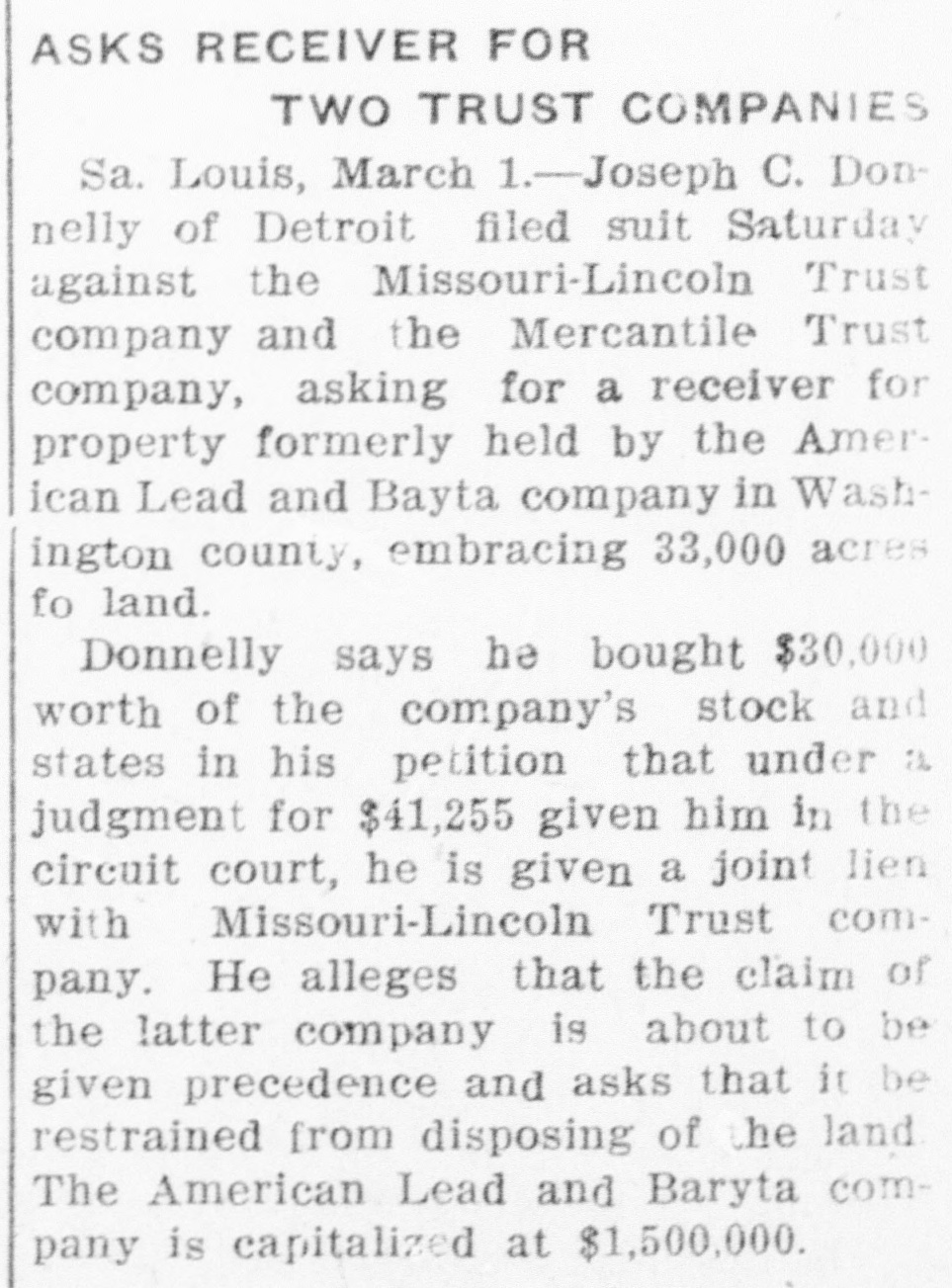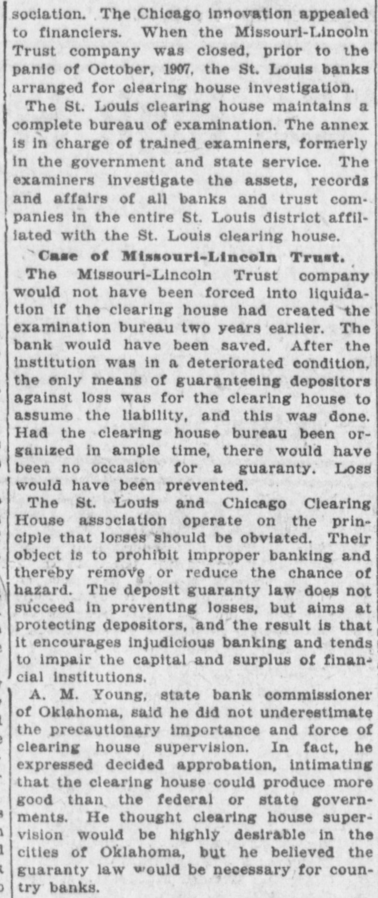 sociation. The Chicago innovation appealed to financiers. When the Missouri-Lincoln Trust company was closed, prior to the panic of October, 1907, the St. Louis banks arranged for clearing house investigation. The St. Louis clearing house maintains a complete bureau of examination. The annex is in charge of trained examiners, formerly in the government and state service. The examiners investigate the assets, records and affairs of all banks and trust companies in the entire St. Louis district affillated with the St. Louis clearing house. Case of Missouri-Lincoln Trust. The Missouri-Lincoln Trust company would not have been forced into liquidation if the clearing house had created the examination bureau two years earlier. The bank would have been saved. After the institution was in a deteriorated condition, the only means of guaranteeing depositors against loss was for the clearing house to assume the liability, and this was done. Had the clearing house bureau been organized in ample time, there would have been no occasion for a guaranty. Loss would have been prevented. The St. Louis and Chicago Clearing House association operate on the principle that losses should be obviated. Their object is to prohibit improper banking and thereby remove or reduce the chance of hazard. The deposit guaranty law does not succeed in preventing losses, but aims at protecting depositors, and the result is that it encourages injudicious banking and tends to impair the capital and surplus of financial institutions. A. M. Young, state bank commissioner of Oklahoma, said he did not underestimate the precautionary importance and force of clearing house supervision. In fact, he expressed decided approbation, intimating that the clearing house could produce more good than the federal or state governments. He thought clearing house supervision would be highly desirable in the cities of Oklahoma, but he believed the guaranty law would be necessary for country banks.