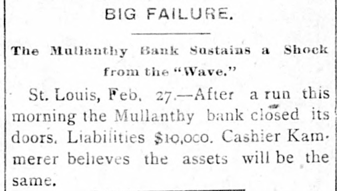 BIG FAILURE. The Mullanthy Bank Sustains a Shock from the "Wave." St. Louis, Feb. 27.-After a run this morning the Mullanthy bank closed its doors, Liabilities $10,000. Cashier Kam. merer believes the assets will be the same.
