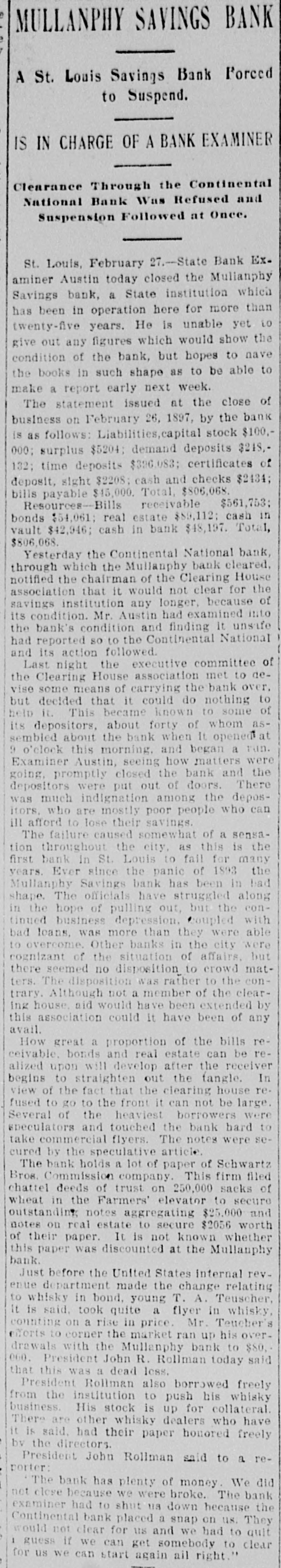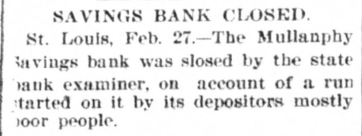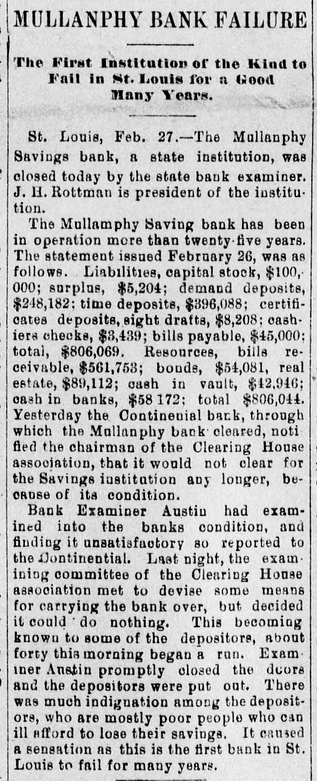 MULLANPHY BANK FAILURE The First Institution of the Kind to Fail in St. Louis for a Good Many Years. St. Louis, Feb. 27.-The Mullanphy Savings bank, a state institution, was closed today by the state bank examiner. J. H. Rottman is president of the institution. The Mullamphy Saving bank has been in operation more than twenty. five years. The statement issued February 26, was as follows. Liabilities, capital stock, $100, 000; surplus, $5,204; demand deposits, $248,182; time deposits, $396,088; certificates deposits, sight drafts, $8,208; cash. iers checks, $3,439; bills payable, $45,000; total, $806,069. Resources, bills receivable, $561,753; bonds, $54,081, real estate, $89,112; cash in vault, $42,946; cash in banks, $58 172: total $806,044. Yesterday the Continenial back, through which the Mallanphy bank cleared, noti fied the chairman of the Clearing House association, that it would not clear for the Savings institution any longer, beCRUSE of its condition. Bank Examiner Austin had examined into the banks condition, and finding it unsatisfactory 80 reported to the Continential. Last night, the exam. ining committee of the Clearing House association met to devise some means for carrying the bank over, but decided it could do nothing. This becoming known to some of the depositore, about forty this morning began a run. Exam. iner Austin promptly closed the deors and the depositors were put out. There was much indiguation among the depositors, who are mostly poor people who can ill afford to lose their savings. It caused a sensation as this is the first bank in St. Louis to fail for many years.