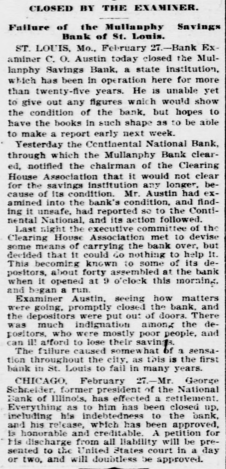 CLOSED BY THE EXAMINER. Failure of the Mullanphy Savings Bank of St. Louis. ST. LOUIS, Mo., February 27.-Bank Examiner C. O. Austin today closed the Mullanphy Savings Bank, a state institution, which has been in operation here for more than twenty-five years. He is unable yet to give out any figures which would show the condition of the bank, but hopes to have the books in such shape as to be able to make a report early next week. Yesterday the Centinental National Bank, through which the Mullanphy Bank cleared, notified the chairman of the Clearing House Association that it would not clear for the savings institution any longer. because of its condition. Mr. Austin had examined into the bank's condition, and finding it unsafe, had reported se to the Continental National, and its action followed. Last night the executive committee of the Clearing House Association met to devise some means of carrying the bank over, but decided that it could do nothing to help It. This becoming known to some of its depositors, about forty assembled at the bank when it opened at 9 o'clock this morning, and began a run. Examiner Austin, seeing how matters were going. promptly closed the bank. and the depositors were put out of doors. There was much indignation among the depositors, who were mostly poor people, and can il! afford to lose their savings. The failure caused somewhat of a sensation throughout the city, as this is the first bank in St. Louis to fail in many years. CHICAGO, February 27.Mr. George Schneider, former president of the National Bank of Illinois, has effected a settlement. Everything as to him has been closed up, including his indebtedness to the bank, and his release, which has been approved, is honorable and creditable. A petition for his discharge from all liability will be presented to the United States court in a day or two, and will doubtless be approved.