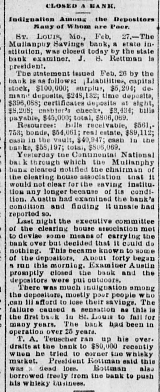 CLOSED A BANK. Indignation Among the Depositors Many of Whom are Poor. ST. LOUIS, Mo., Feb. 27.-The Mullanpuy Savings bank, a state institution, was closed today by the state bank examiner. J. B. Rettman is president. The statement issued Feb. 26 by the bank 18 88 follows: | Liabilities, capital stock, $100,000; surplus, $5,204; de. mand deposits, $248,132; time deposits, $396,088; certificates deposits at eight, $8,208; cashier's checks, $3,484; bills payable, $45,000; total, $806,069. Resources: Bills receivable, $561,758; bonds, $54,061; real estate, $89,112; cash in the vault, $40,947; cash in the banks, $58,197; total, $506,069. Yesterday the Continental National bal k through which the Mullanphy bank cleared notified the chairman of the clearing house association that it would not clear forthe saving institution any longer because of its condition. Austin had examined the bank's condition and finding it unsale had reported so. Last night the executive committee of the clearing house association met to devise some means of carrying the bank over but decided that it could do nothing. This became known to some of the depositors. About forty began a run this morning. Examiner Austin promptly closed the bank and the depositors were put outdoors. There was much indignation among the depositors, mostly poor people who ,can 111 afford to lose their savings. The failure caused & sensation as this is the first back in St. Louis to fall for many years. The bank had been in operation over 25 years. T. A. Teuscher ran up his over. drafts at the bank to $80,000 recently when he tried to corner the whisky market. President Rottman said this was & dead loss. Bottman also borrowed freely from the bank to push his whisky business.