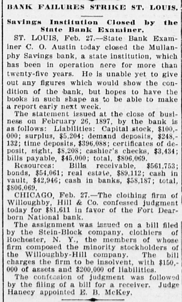 BANK FAILURES STRIKE ST. LOUIS. Savings Institution Closed by the State Bank Examiner. ST. LOUIS, Feb. 27.-State Bank Examiner C. O. Austin today closed the Mullanphy Savings bank, a state institution, which has been in operation nere for more than twenty-five years. He is unable yet to give out any figures which would show the condition of the bank, but hopes to have the books in such shape as to be able to make a report early next week. The statement issued at the close of business on February 26, 1897, by the bank is as follows: Liabilities: Capital stock, $100,000; surplus, $5,204; demand deposits, $248,132; time deposits, $396,088; certificates of deposit, sight, $8,208; cashier's checks, $3,434; bills payable, $45,000; total, $806,069. Resources: Bills receivable, $561,753; bonds, $54,061; real estate, $89,112; cash in vault, $42,946; cash in banks, $58,187; total, $806,069. CHICAGO, Feb. 27.-The clothing firm of Willoughby, Hill & Co. confessed judgment today for $81,611 in favor of the Fort Dearborn National bank. The assignment was issued on a bill filed by the Stein-Block company, clothiers of Rochester, N. Y., the members of whose firm composed the minority stockholders of the Willoughby-Hill company. The bill charges the firm to be insolvent, with $150,000 of assets and $200,000 of liabilities. The confession of judgment was followed by the filing of a bill for a receiver. Judge Hanecy appointed E. B. McKey.