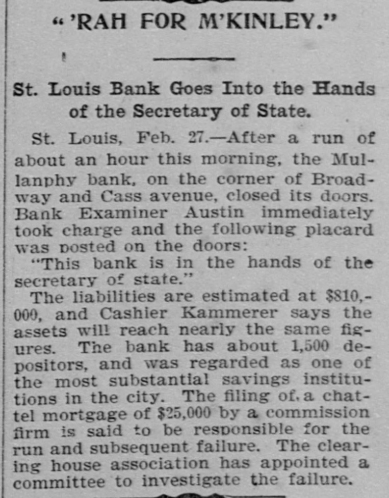 "RAH FOR M'KINLEY." St. Louis Bank Goes Into the Hands of the Secretary of State. St. Louis, Feb. 27.-After a run of about an hour this morning, the Mullanphy bank, on the corner of Broadway and Cass avenue, closed its doors. Bank Examiner Austin immediately took charge and the following placard was posted on the doors: "This bank is in the hands of the secretary of state." The liabilities are estimated at $810,000, and Cashier Kammerer says the assets will reach nearly the same figures. The bank has about 1,500 depositors, and was regarded as one of the most substantial savings institutions in the city. The filing of. a chattel mortgage of $25,000 by a commission firm is said to be responsible for the run and subsequent failure. The clearing house association has appointed a committee to investigate the failure.