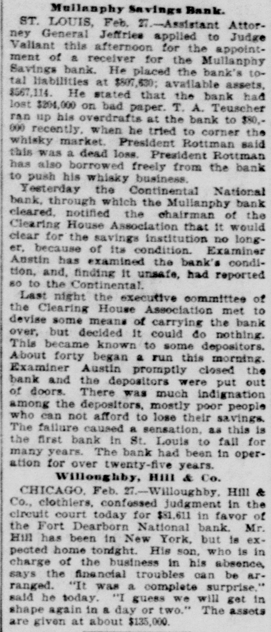 Mullanphy Savings Bank. ST. LOUIS, Feb. 27.-Assistant Attorney General Jeffries applied to Judge Valiant this afternoon for the appointment of a receiver for the Mullanphy Savings bank. He placed the bank's total liabilities at $807,630; available assets, $567,114. He stated that the bank had lost $204,000 on bad paper. T. A. Teuscher ran up his overdrafts at the bank to $80,000 recently. when he tried to corner the whisky market. President Rottman said this was a dead loss. President Rottman has also borrowed freely from the bank to push his whisky business. Yesterday the Continental National bank, through which the Mulianphy bank cleared. notified the chairman of the Clearing House Association that It would clear for the savings institution no longer, because of its condition. Examiner Austin has examined the bank's condition, and, finding It unsafe, had reported 80 to the Continental. Last night the executive committee of the Clearing House Association met to devise some means of carrying the bank over, but decided It could do nothing. This became known to some depositors. About forty began a run this morning. Examiner Austin promptly closed the bank and the depositors were put out of doors. There was much indignation among the depositors, mostly poor people who can not afford to lose their savings. The failure caused a sensation, as this is the first bank In St. Louis to fall for many years. The bank had been in operation for over twenty-five years. Willonghby, HIII & Co. CHICAGO, Feb. 27.-Willoughby. Hill & Co., clothiers, confessed judgment in the circuit court today for $81,611 in favor of the Fort Dearborn National bank. Mr. Hill has been in New York, but is expected home tonight. His son, who is in charge of the business in his absence, says the financial troubles can be arranged. "It was a complete surprise," said he today. "I guess we will get in shape again in & day or two." The assets are given at about $135,000.