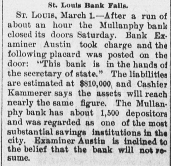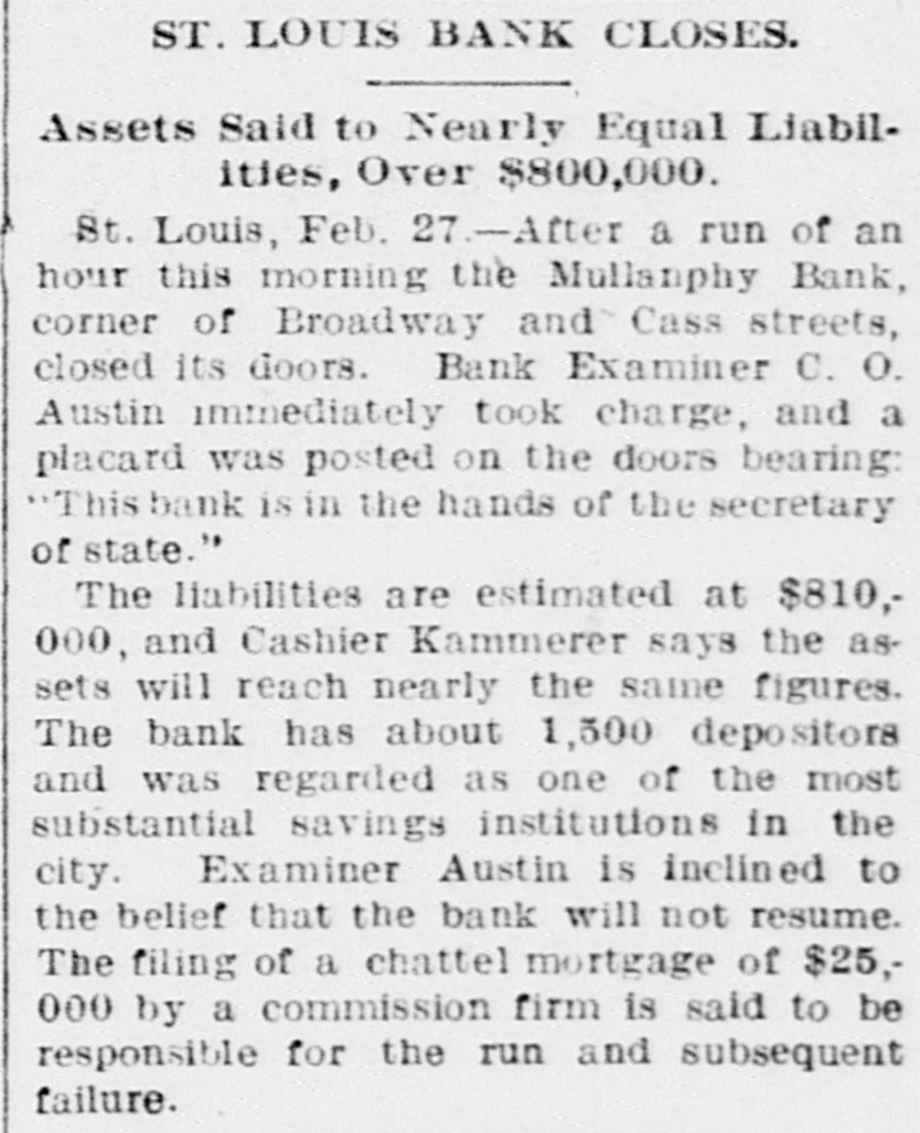 ST. LOUIS BANK CLOSES. Assets Said to Nearly Equal Liabilities, Over $800,000. St. Louis, Feb. 27.-After a run of an hour this morning the Mullanphy Bank, corner of Broadway and Cass streets, closed its doors. Bank Examiner C. O. Austin immediately took charge, and a placard was posted on the doors bearing: "This bank is in the hands of the secretary of state." The liabilities are estimated at $810,000, and Cashier Kammerer says the assets will reach nearly the same figures. The bank has about 1,500 depositors and was regarded as one of the most substantial savings institutions in the city. Examiner Austin is inclined to the belief that the bank will not resume. The filing of a chattel mortgage of $25,000 by a commission firm is said to be responsible for the run and subsequent failure.