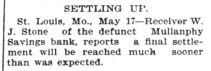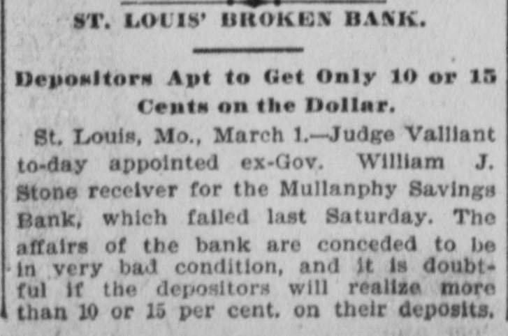 ST. LOUIS' BROKEN BANK. Depositors Apt to Get Only 10 or 15 Cents on the Dollar. St. Louis, Mo., March 1.-Judge Valliant to-day appointed ex-Gov. William J. Stone receiver for the Mullanphy Savings Bank, which failed last Saturday. The affairs of the bank are conceded to be in very bad condition, and it is doubtful if the depositors will realize more than 10 or 15 per cent. on their deposits.