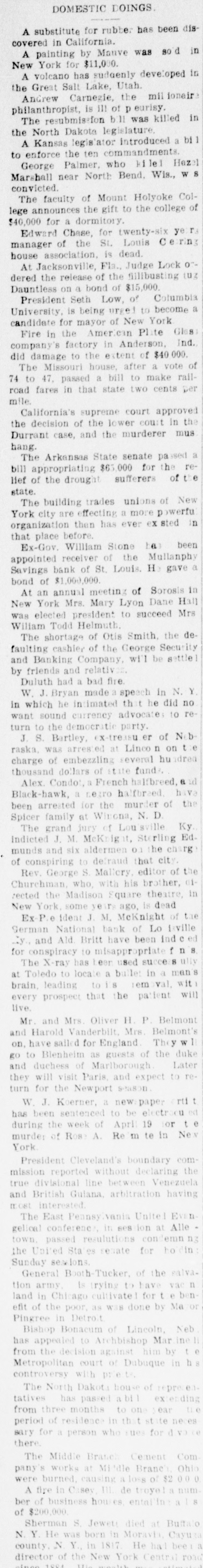 ten the enforce to George Palmer, who kilei Hazel Marshall near North Bend. Wis., W S convicted. The faculty of Mount Holyoke College announces the gift to the college of $40,000 for a dormitory. Edward Chase, for twenty-six manager of the St. Louis Cerring house association, is dead. At Jacksonville, Fla., Judge Lock ordered the release of the fillibusting 10g Dauntless on a bond of $15,000. President Seth Low, of Columbia University, is being urgel to become a candidate for mayor of New York Fire in the American Phte Gless company's factory in Anderson, Ind. did damage to the extent of $40 000. The Missouri house, after a vote of 74 to 47. passed a bill to make railroad fares in that state two cents per mile. California's supreme court approved the decision of the lower court in the Durrant case, and the murderer mus hang. The Arkensas State senate passed a bill appropriating $65,000 for the relief of the drought sufferers of the state. The building trades unions of New York city are effecting a more powerfu organization than has ever ex sted in that place before. Ex-Gov. William Stone has been appointed receiver of the Mullanphy Savings bank of St. Louis. H: gave a bond of $1,000,000. At an annual meeting of Sorosis in New York Mrs. Mary Lyon Dane Hall was elected president to succeed Mrs Wiliam Todd Helmuth. The shortage of Otis Smith, the defaulting cashier of the George Security and Banking Company, will be settlel by friends and relativ Duluth had a bad fire. W. J. Bryan made a speech in N. Y. in which he intimated that he did no want sound currency advocates 10 return to the democratic party. J. S. Bartley, ex-treasu er of Nebraska, was arrested at Linco n on charge of embezzling several hu idred thousand dollars of state funds. Alex. Condot, a French halfbreed, a ul Black-hawk, a negro halfbreed. have been arrested for the murder of the Spicer family at Winona, N. D. The grand jury of Lou sville Ky. Indicted J. M. McKnig it, Sterling Edmunds and six aldermen 0.1 the charg of conspiring to defraud that city. Rev. George S. Mallery, editor of the Churchman, who, with his brother, 01rected the Madison Square theatre, in New York. some years ago, is dead Ex P.e ident J. M. McKnight of the German National bank of Lo inville .y., and Ald Britt have been ind ed for conspiracy to misappropriate f n 8 The X-ray has Leer used success ully at Toledo to locate a bullet in a mans brain, leading to is Tem val, with every prospect that the patient will live. Mr. and Mrs. Oliver H. P. Belmont and Harold Vanderbilt, Mrs. Belmont's on, have sailed for England They 1 go to Blenheim as guests of the duke and duchess of Marlborough Later they will visit Paris and expect to return for the Newport season W. J. Koerner, a newspaper rti t has been sentenced to be electrocu ed during the week of April 19 or te murde: of Rose A. Re m te in New York President Cleveland's boundary commission reported without declaring the true divisional line between Venezuela and British Gulana, arbitration having most interested. The East Pennsylvania United Even gelical conference, in ses ion at Alle town. passed resulutions condemn nz the United Sta es senate for ho Fin Sunday sessions. General Booth-Tucker, of the salvation army, is trying to have vac n land in Chicago cultivated for t ben efit of the poor, as WSS done by Ma 01 Pingree in Detroit Bishop Bonacum of Lincoln, Neb has appealed to Archbishop Mar ine from the decision against him by Metropolitan court of Dubuque in controversy with priects. The North Dakota bouse of represent tatives has passed abil extending from three months to one ear u.e. period of residence in that state neces SELV for person who for