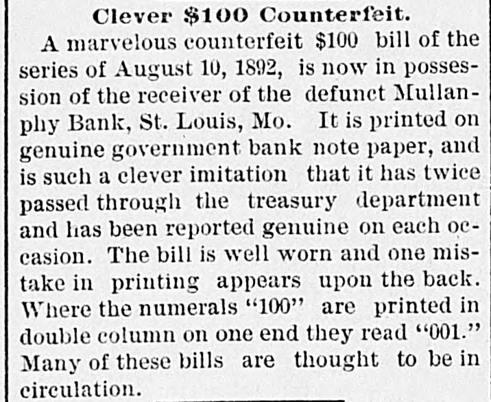 # Clever $100 Counterfeit. A marvelous counterfeit $100 bill of the series of August 10, 1892, is now in possession of the receiver of the defunct Mullan-phy Bank, St. Louis, Mo. It is printed on genuine government bank note paper, and is such a clever imitation that it has twice passed through the treasury department and has been reported genuine on each occasion. The bill is well worn and one mistake in printing appears upon the back. Where the numerals "100" are printed in double column on one end they read "001." Many of these bills are thought to be in circulation.