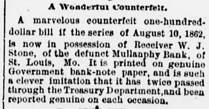 # A Wonderful Counterfeit. A marvelous counterfeit one-hundred-dollar bill if the series of August 10, 1862, is now in possession of Receiver W. J. Stone, of the defunct Mullanphy Bank, of St. Louis, Mo. It is printed on genuine Government bank-note paper, and is such a clever imitation that it has twice passed through the Treasury Department, and been reported genuine on each occasion.