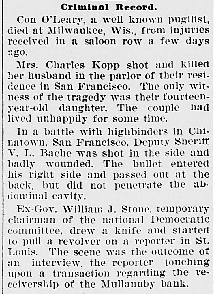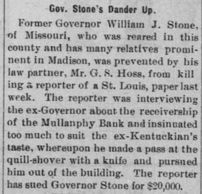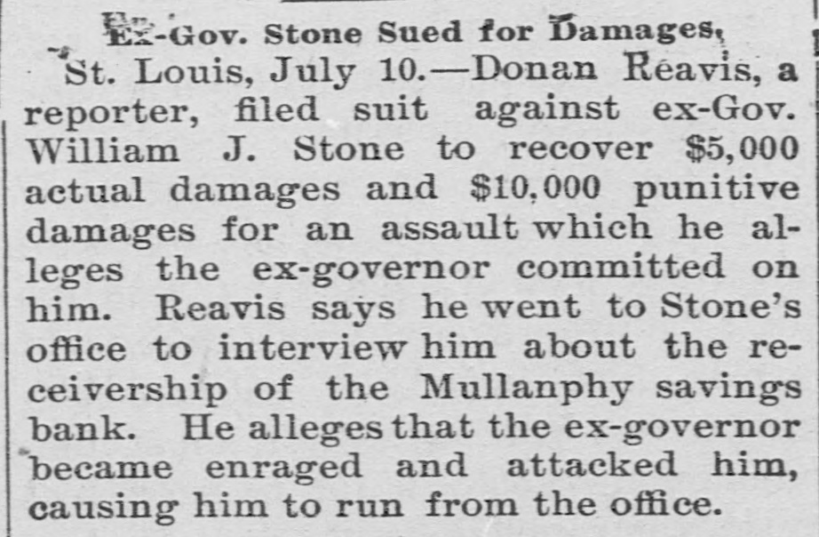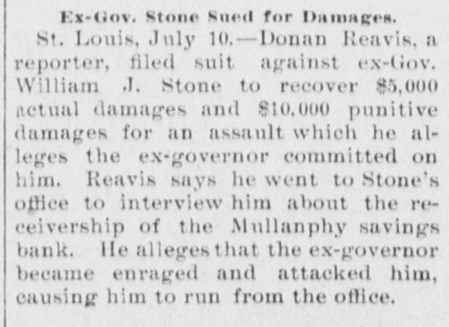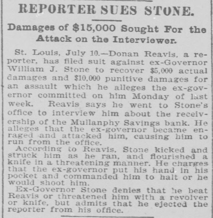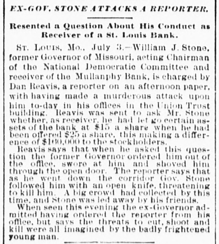 EX-GOV. STONE ATTACKS .4 REPORTER. Resented a Question About His Conduct as Receiver of a St. Louis Bank. ST. LOUIS, Mo., July 3.-William J. Stone. former Governor of Missouri, acting Chairman of the National Democratic Committee and receiver of the Mullanphy Bank, is charged by Dan Reavis, a reporter on an afternoon paper. with having made a murderous attack upon him to-day in his offices in the Union Trust building. Reavis was sent to ask Mr. Stone whether, as receiver. he had let go certain assets of the bank at $15 a share when he had been offered $25 a share. this making a difference of $160. 000 to the stockholders. Reavis says that when he asked this question the former Governor ordered him out of the office. swore at him and shoved him through the open door. The reporter says that as he went down the corridor Gov. Stone followed him with an open knife, threatening to kill him. A big crowd had collected by this time. and Stone was led away by his friends. When seen this evening the ex-Governor admitted having ordered the reporter from his office. but says the threats to cut, shoot and kill were all imagined by the badly frightened young man.