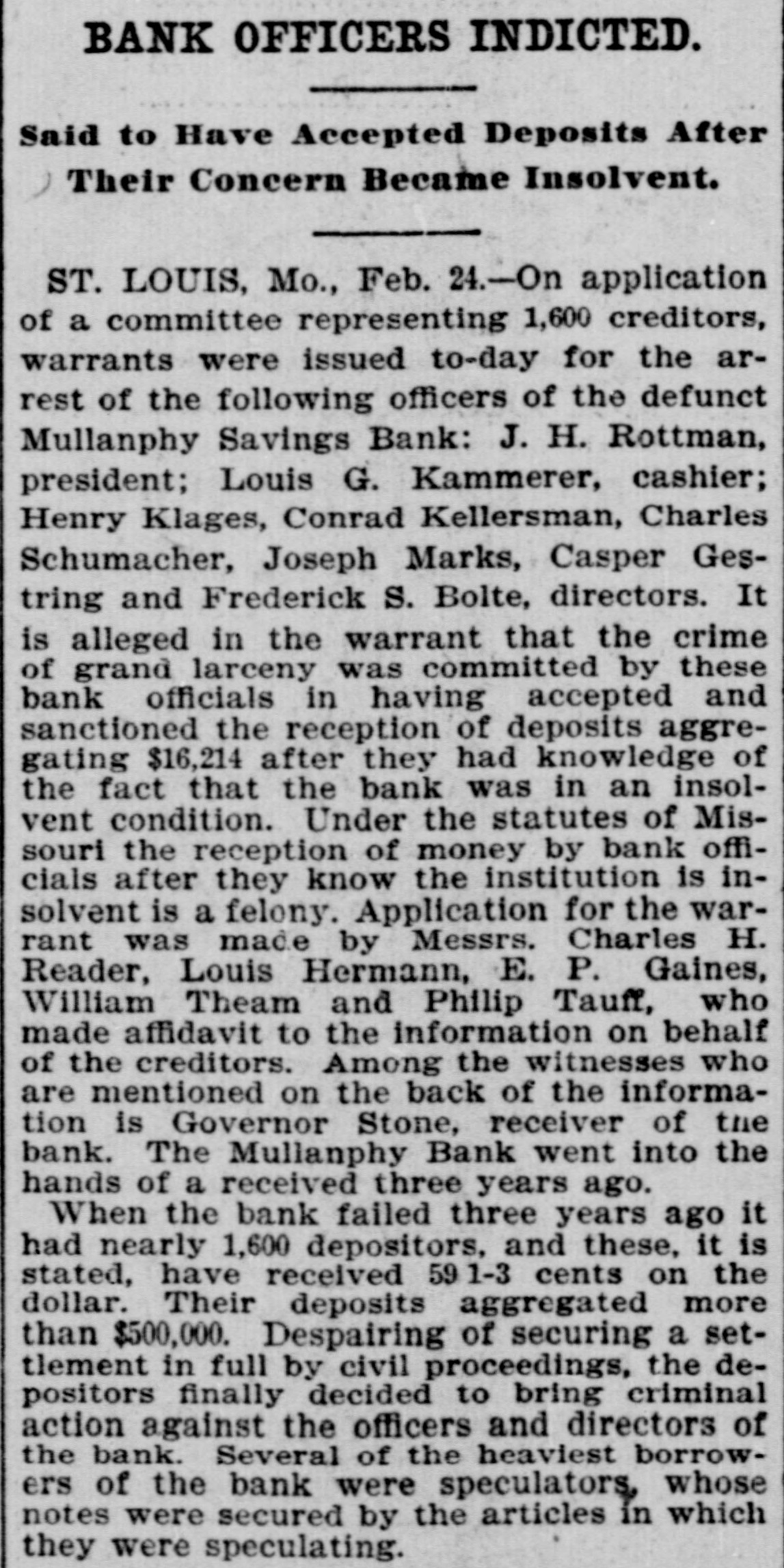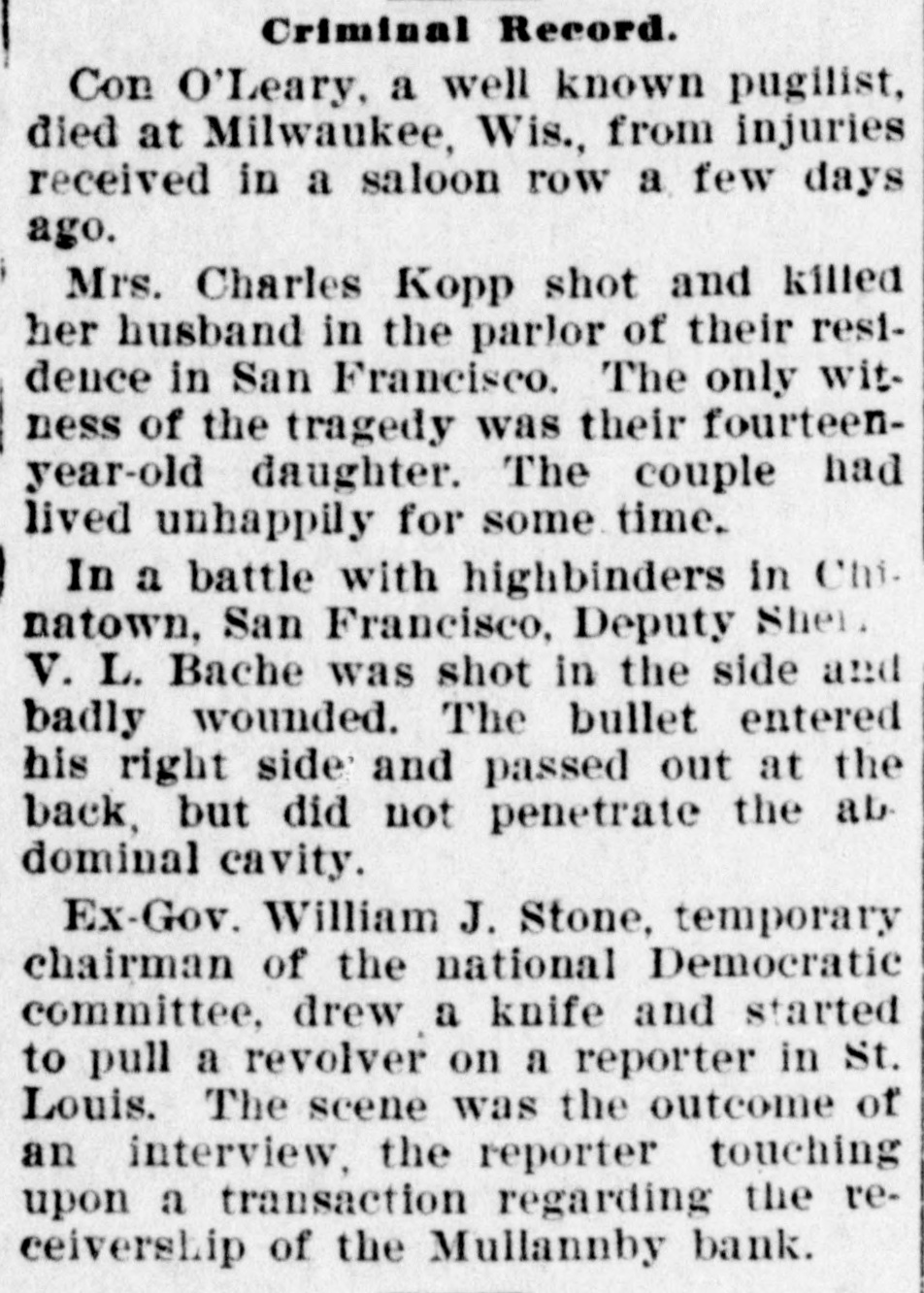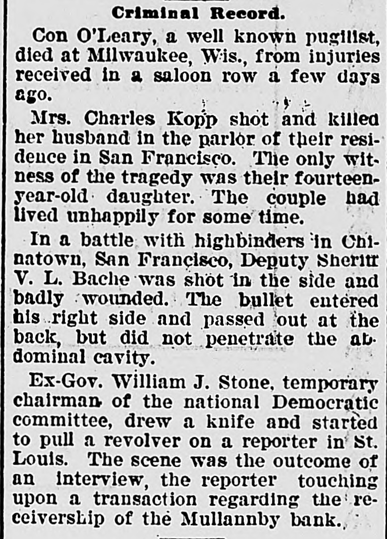EX-GOV. STONE ATTACKS .4 REPORTER. Resented a Question About His Conduct as Receiver of a St. Louis Bank. ST. LOUIS, Mo., July 3.-William J. Stone. former Governor of Missouri, acting Chairman of the National Democratic Committee and receiver of the Mullanphy Bank, is charged by Dan Reavis, a reporter on an afternoon paper. with having made a murderous attack upon him to-day in his offices in the Union Trust building. Reavis was sent to ask Mr. Stone whether, as receiver. he had let go certain assets of the bank at $15 a share when he had been offered $25 a share. this making a difference of $160. 000 to the stockholders. Reavis says that when he asked this question the former Governor ordered him out of the office. swore at him and shoved him through the open door. The reporter says that as he went down the corridor Gov. Stone followed him with an open knife, threatening to kill him. A big crowd had collected by this time. and Stone was led away by his friends. When seen this evening the ex-Governor admitted having ordered the reporter from his office. but says the threats to cut, shoot and kill were all imagined by the badly frightened young man.