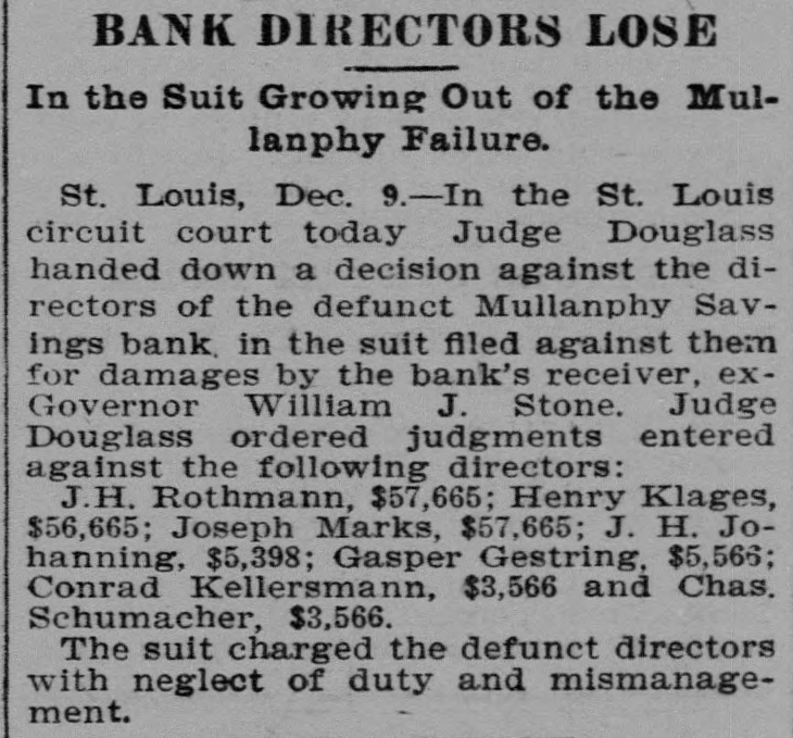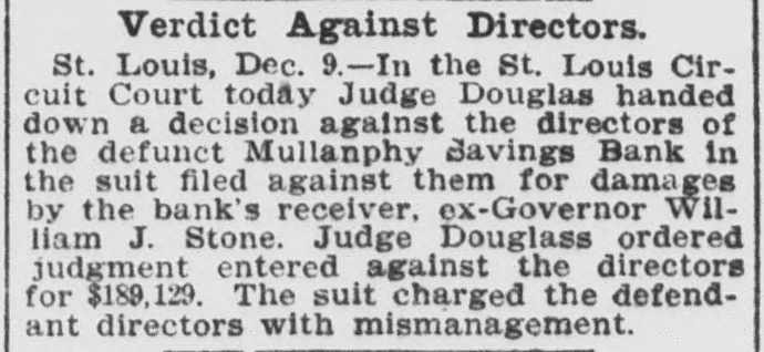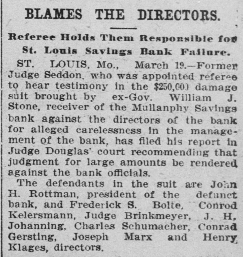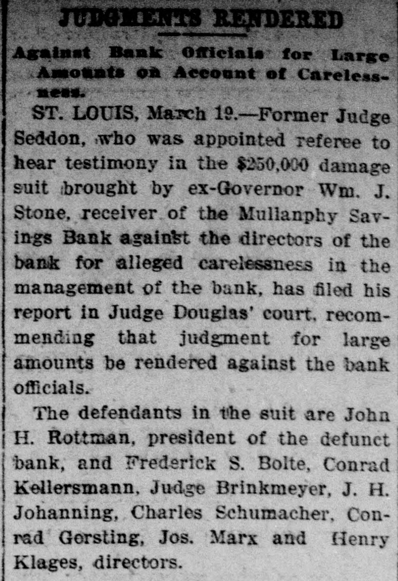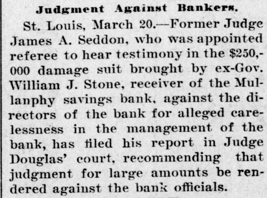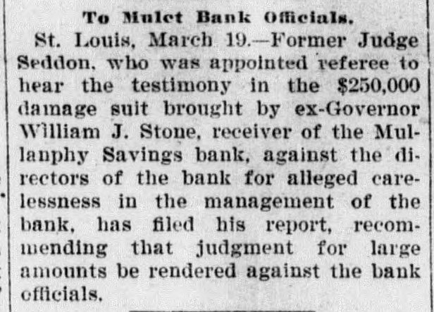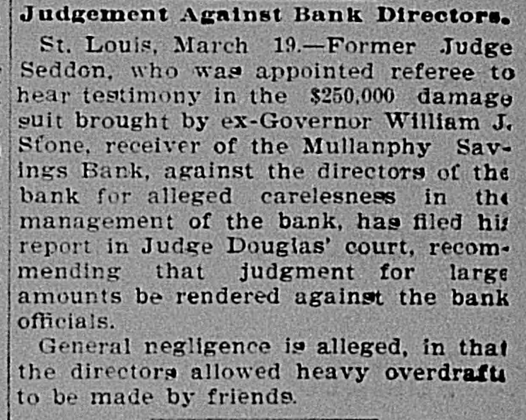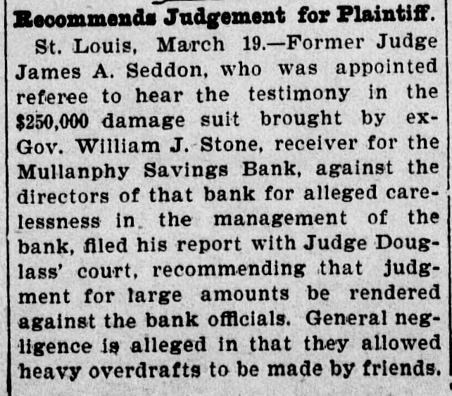 Former Judge A. S. Seddon, who was appointed referee to hear testimony in the $250,000 damage suit brought by ex-Governor William J. Stone, receiver of the Mullanphy Savings Bank, St. Louis, against the directors of the bank for alleged carelessness in the management of the bank, has filed his report in Judge Douglas's court, at St. Louis, recommending that judgment be rendered against the bank officials. General negligence is charged, in that they allowed heavy overdrafts to be made.