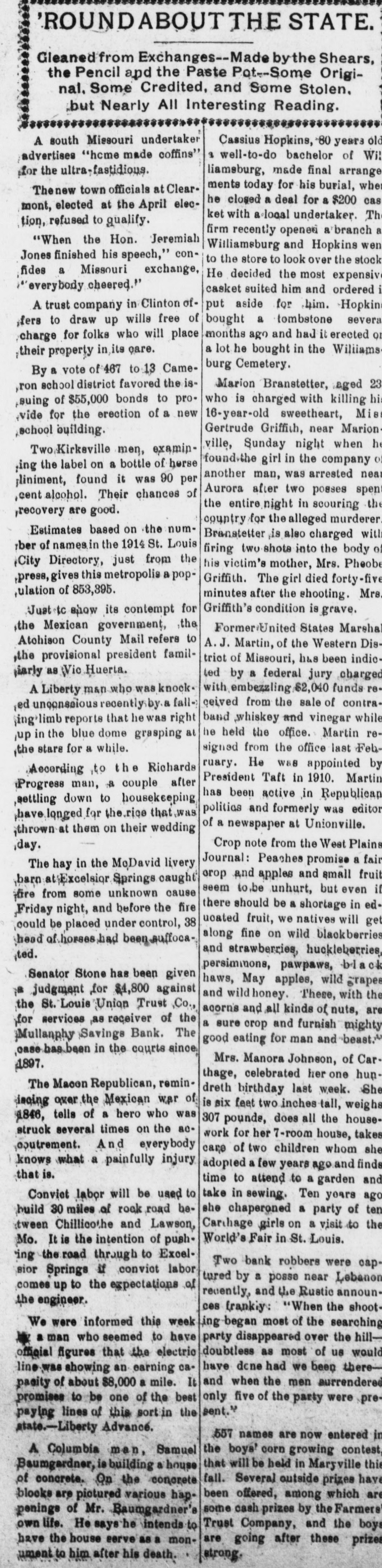 'ROUND ABOUTTHE STATE. Gleaned from Exchanges--Made by the Shears, the Pencil and the Paste Pot--Some Original. Some Credited, and Some Stolen. but Nearly All Interesting Reading. A south Missouri undertaker Cassius Hopkins, 80 years old 3 well-to-do bachelor of Wil advertises "heme made coffins" liamsburg, made final arrange for the ultra- fastidious. ments today for his burial, when The new town officials at Clearhe closed a deal for a $200 cas mont, elected at the April elecket with a local undertaker. Th tion, refused to qualify. firm recently openeri a branch a "When the Hon. Jeremiah Williamsburg and Hopkins wen Jones finished his speech," conto the store to look over the stock fides a Missouri exchange, He decided the most expensive "everybody cheered." casket suited him and ordered i put aside for him. -Hopkins A trust company in Clinton of bought a tombstone severa fers to draw up wills free of months ago and had it erected or charge for folks who will place a lot he bought in the Wiliiams their property in its care. burg Cemetery. By a vote of 467 to 13 CameMarion Branstetter, aged 23 ron school district favored the iswho is charged with killing his suing of $55,000 bonds to pro16-year-old sweetheart, Mis vide for the erection of a new Gertrude Griffith, near Marion school building. ville, Sunday night when h Two.Kirkeville men, examinfound-the girl in the company of ,ing the label on a bottle of herse another man, was arrested near ;liniment, found it was 90 per Aurora after two posses spent cent alcohol. Their chances of the entire night in scouring the ,recovery are good. country for the alleged murderer. Estimates based on the numBranstetter is also charged with rber of namesin the 1914 St. Louis firing two shots into the body of City Directory, just from the his victim's mother, Mrs. Pheobe ,press,gives this metropolis a popGriffith. The girl died forty-fiv ,ulation of 853,395. minutes after the shooting. Mrs. Griffith's condition is grave. Just t show its contempt for the Mexican government, the Former/United States Marshal Atohison County Mail refers to A. J. Martin, of the Western Dis,the provisional president familtriot of Missouri, has been indicpaily as Vic Huerta. ted by a federal jury charged with embezzling $2,040 funds reA Liberty m&n who was knock ceived from the sale of contra. ed unconseious recently.by a fallband ,whiskey and vinegar while ing-lim reports that he was right he held the office. Martin reup in the blue dome grasping at signed from the office last Feb,the stare for a while. ruary. He W88 appointed by According to the Richards President Taft in 1910. Martin Progress man, a couple after has been active in Republican ,settling down to housekeeping politias and formerly was editor ,have longed for the rice that was of a newspaper at Unionville. ,thrown at them on their wedding Crop note from the West Plains day. Journal: Peaches promise a fair The hay in the McDavid livery orop and apples and small fruit ,barn Excelsior Springs caught seem to.be unhurt, but even if fire from some unknown cause there should be a shortage in ed,Friday night, and before the fire ucated fruit, we natives will get could be placed under control, 38 along fine on wild blackberries head of horses had been suffocaand strawberries, huckleberries, ted. persiminons, pawpaws, black Senator Stone has been given haws, May apples, wild grapes a judgment for $4,800 against and wild honey. These, with the the St. Louis Union Trust ,Co., acorns and all kinds of nuts, are for services as receiver of the a sure crop and furnish mighty Mullanphy Savings Bank. The good eating for man and beast. oase.bas.been in the courts since Mrs. Manora Johnson, of Car 1897. thage, celebrated her one hun The Macon Republican, remindreth birthday last week. She iscing over the Mexican war of is six feet two inches tall, weighs 1846, tells of a hero who was 307 pounde, does all the housestruck several times on the acwork for her 7-room house, takes ooutrement. And everybody care of two children whom she knows what a painfully injury adopted a few years ago and finds that is. time to attend to a garden and Convict labor will be used to take in sewing. Ten years ago build 30 miles of rock road be. she chaperoned a party of ten ;tween Chillicothe and Lawson, Carchage girls on a visit to the World's Fair in St. Louis. Mo. It is the intention of push ing road through to Excel Two bank robbers were cap. sior Springs if conviot labor tured by a posse near Lebanon comes up to the expectations of recently, and the Rustic announthe engineer. ces frankiy: "When the shootWe were informed this week ing-began most of the searching a man who seemed to have party disappeared over the hilldoubtless as most of us would an cahave dcne had we been there official figures showing that the earning electric and when the men aurrendered pacity of about $8,000 a mile. It only five of the party were prepromises to be one of the best sent." paying lines of this sort in the state.-Liberty Advance. 557 names are now entered in A Columbia man, Samuel the boys corn growing contest, that will be held in Maryville this Baumgardner, is building a house of concrete. On the conorete fall. Several outside prizes have been offered, among which are blocks are pictured various hapsome cash prizes by the Farmers' penings of Mr. Baumgardner's n life. He says he intends to Trust Company, and the boys have the house serve as a monare going after these prizes ument to him after his death. strong.