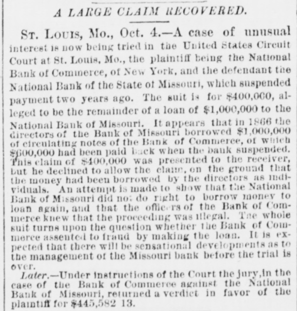 A LARGE CLAIM RECOVERED. ST. LOUIS, Mo., Oct. 4.-A case of unusual interest 18 now being tried in the United States Circuit Court at St. Louis, Mo., the plaintiff being the National Bank of Commerce, of New York, and the defendant the National Bank of the State of Missouri, which suspended payment two years ago. The suit is for $400,000, alleged to be the remainder of a loan of $1,000,000 to the National Bank of Missouri. It appears that in 1866 the directors of the Bank of Missouri borrowed $1,000,000 of circulating notes of the Bank of Commerce, of which $600,000 had been paid back when the bank suspended. This claim of $400,000 was presented to the receiver, but he declined to allow the claims, on the ground that the money had been borrowed by the directors as individuals. An attempt is made to show that the National Bank of Missouri did no: do right to borrow money to loan again, and that the officers of the Bank of Commerce knew that the proceeding was illegal. The whole suit turns upon the question whether the Bank of Commeree assented to fraud by making the loan. It is expected that there will be sensational developments as to the management of the Missouri bank before the trial is over. Later.-Under instructions of the Court the jury, in the case of the Bank of Commerce against the National Bank of Missouri, returned a verdict in favor of the plaintiff for $445,582 13.