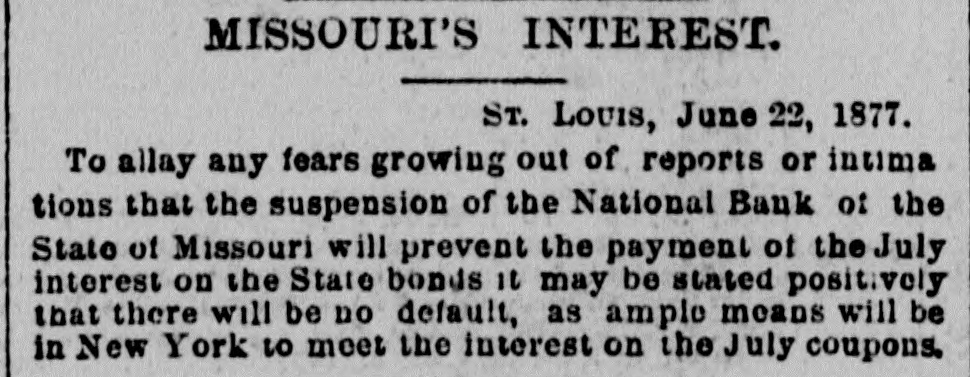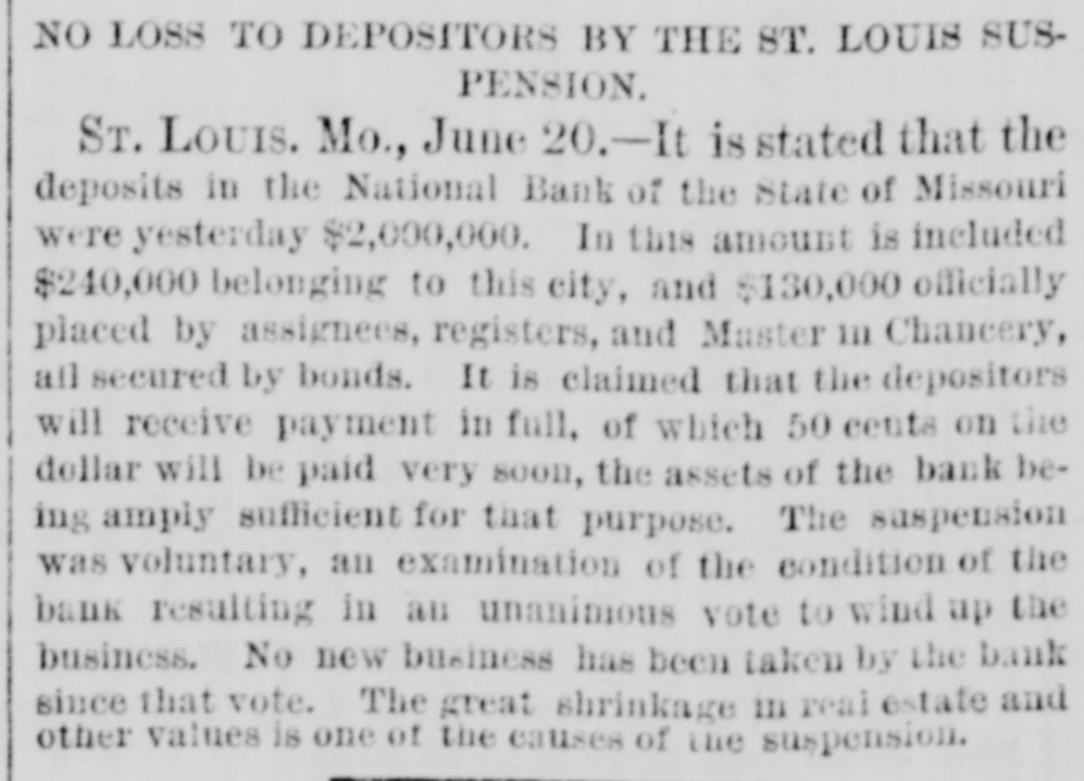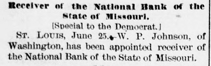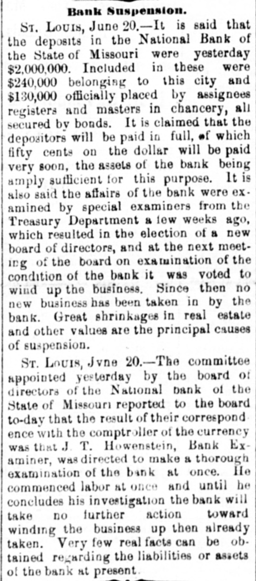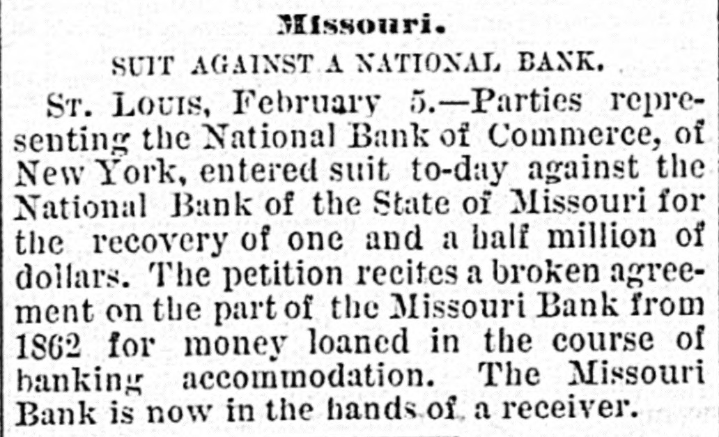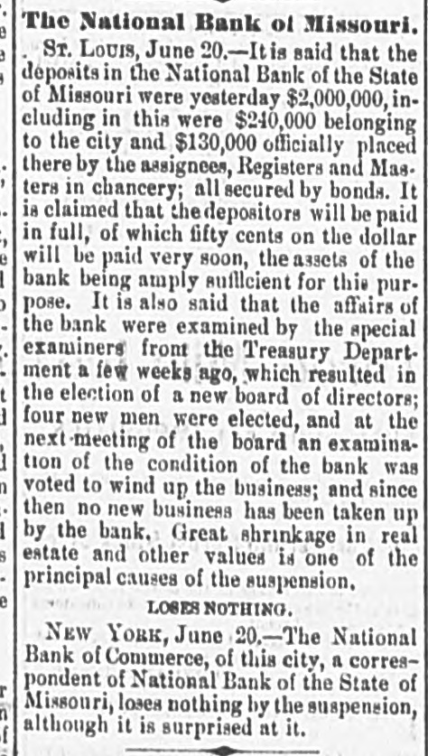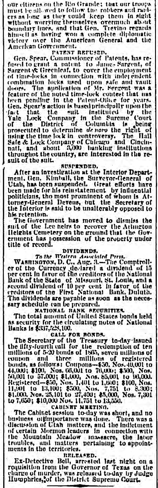 our citizens on the Rio Grande: that our troops must be all. wed to follow the robbers and raiders as long us they could keep them In might without worring themselves overmuch ab ut boundary lines. and that Gen. Trevino regards himsell as having won a complete diplomatic victory over the American General and the American Government. PATENT REFUSED. Gen. Spear. Commissioner of Patents, has refused to graut n patent to James Sargent, of Sargent it Greenlcaf. to cover the employment of time-locks in connection with inder endent combination locks used upon safe and vault doors. The application of Mr. Fergent was a feature of the noted time-lock context that nas been pendine in the Patent-Olive for years. tien. Spear's action is based principally upon the fact that tl.c suit Instituted by the Yale Lock Company in the Sureme Court of the District of Columbia is being prosecuted to determine de more the right of using the time lock in controversy. The Hall Safe & Lock Company of Chicago and Cinclunati, and about 3,000 banking institutions throughot the country, are Interested in the result of the suit. RESPENDED After an Investigation at the Interior Department. (len. Kimball, the Surveyor-General of Utah, has been suspended. Great efforts have been made for his reinstatement by influential politicians, tho most prominent of whom is Attorney-General Deveus, but the Secretary of the Interior is said to be unalterably opposed to his retention. The Government has moved to dismiss the suit of the Lee heirs to recover the Artington [leights Cemetery on the ground that the Goverminent has prossession of the proberty under title of record. DIVIDENDS. To the Wetern Associated Press. WARNINGTON, D. C., Aug. 3.-The Comptrollcr of the Currency declared a dividend of 15 per cent In favor of the creditors of the National Bank of the State of Missouri. St. Louis, and a second dividend of 10 per cent In favor of the creditors of the First National Bank. Duluth. The dividends are payable as soon as the tiecessary schedule can be prepared. NATIONAL BANK SECURITIES. The total amount of United States bonds held as security for the circulating notes of National Banks is $337,528,100. CALL FOR RONDS. The Secretary of the Treasury to-day issued the lifty-fourtli call for the redemption of ten millions of 5-20 bonds of 1805, seven millions of coupon and three millions of registered bonds, as follows: Coupons-$50. Nos. 40,001 to 44,000; $100. Nos. 66,001 to 76,000; $300, Nos. 50,001 to 57.000; $1,000, Nos. 85,001 to 90,000. Registered-8:00 Nos. 1.40L to 1,000; $100, Nos. 11,001 to 13,100; $500, Nos. 7,751 to 8.300: 81.000, Non. 25,101 to 27,400; $5,000, Nos. 7,301 to 7,050; $10,000 Nos. 11,751 to 13,550. CABINET MEETING. The Cabinet session to-day was short, and no business of importance was done. There was a discussion of Utah mattere, and the Indletment of certain Mormon leaders In connection with the Mountain Meadow maseacre, the labor troubles, and matters pertaining to appointments in the territories. RELEASED. Ex-Detective Bell, arrested last night on a requisition from the Governor of Texas on the charge of murder, was released to-day by Judge Humphrics, of the District Supreme Court.