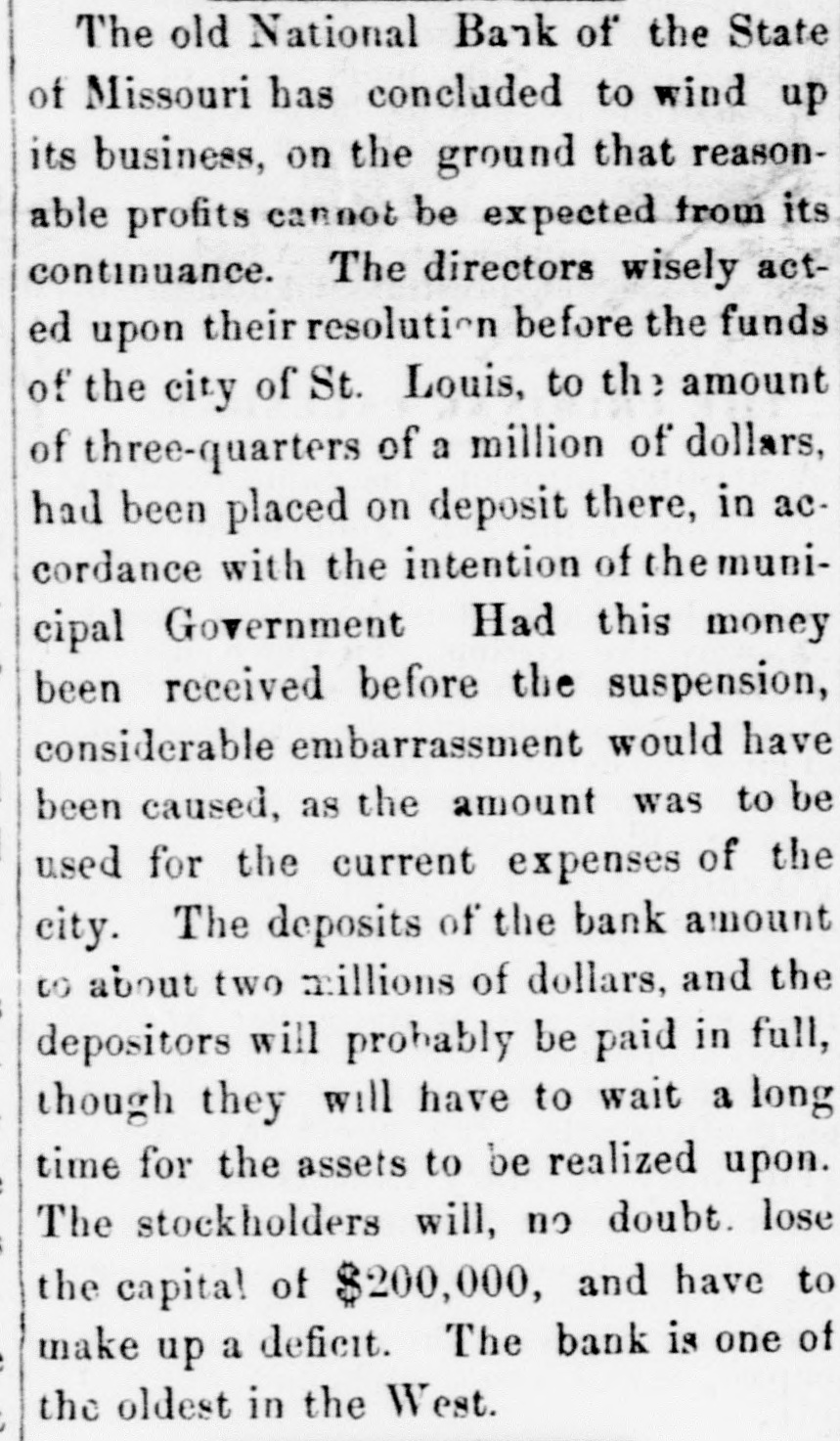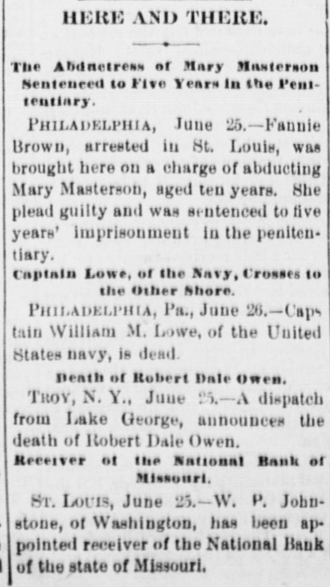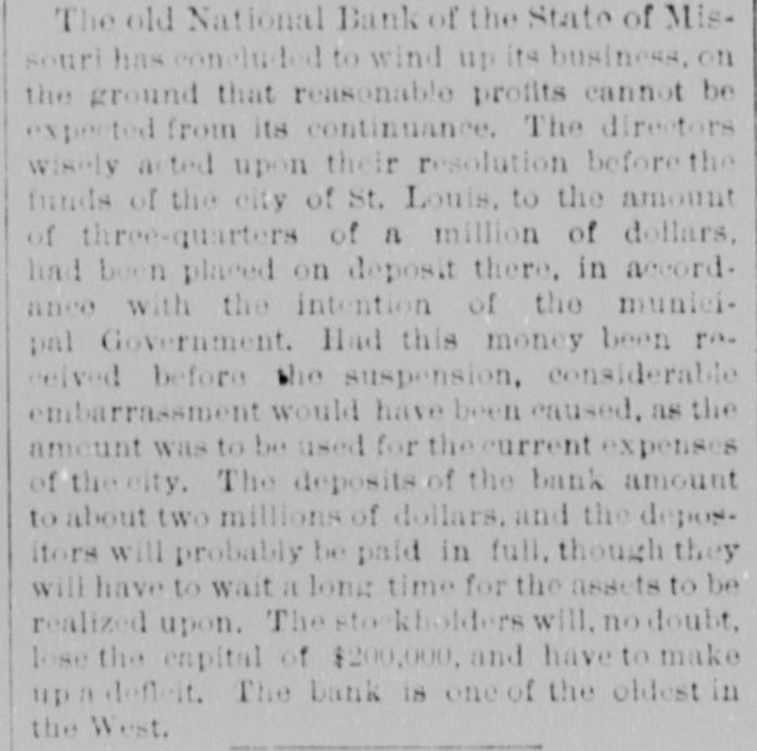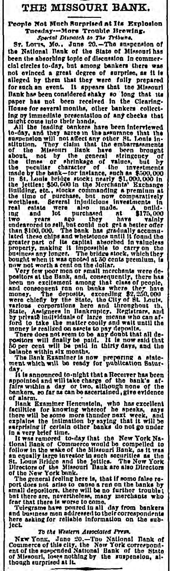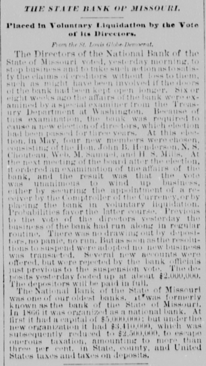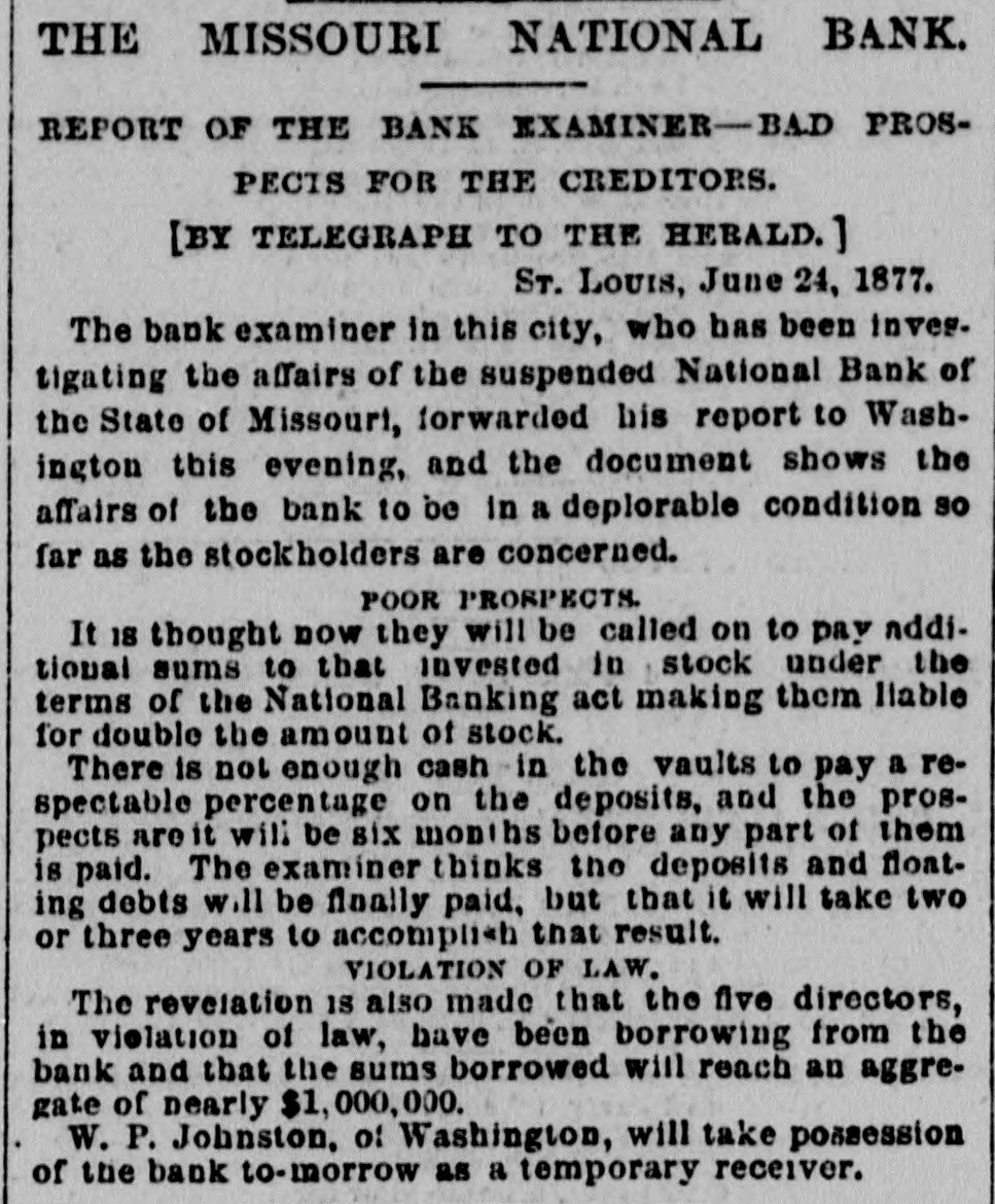 our citizens on the Rio Grande: that our troops must be all. wed to follow the robbers and raiders as long us they could keep them In might without worring themselves overmuch ab ut boundary lines. and that Gen. Trevino regards himsell as having won a complete diplomatic victory over the American General and the American Government. PATENT REFUSED. Gen. Spear. Commissioner of Patents, has refused to graut n patent to James Sargent, of Sargent it Greenlcaf. to cover the employment of time-locks in connection with inder endent combination locks used upon safe and vault doors. The application of Mr. Fergent was a feature of the noted time-lock context that nas been pendine in the Patent-Olive for years. tien. Spear's action is based principally upon the fact that tl.c suit Instituted by the Yale Lock Company in the Sureme Court of the District of Columbia is being prosecuted to determine de more the right of using the time lock in controversy. The Hall Safe & Lock Company of Chicago and Cinclunati, and about 3,000 banking institutions throughot the country, are Interested in the result of the suit. RESPENDED After an Investigation at the Interior Department. (len. Kimball, the Surveyor-General of Utah, has been suspended. Great efforts have been made for his reinstatement by influential politicians, tho most prominent of whom is Attorney-General Deveus, but the Secretary of the Interior is said to be unalterably opposed to his retention. The Government has moved to dismiss the suit of the Lee heirs to recover the Artington [leights Cemetery on the ground that the Goverminent has prossession of the proberty under title of record. DIVIDENDS. To the Wetern Associated Press. WARNINGTON, D. C., Aug. 3.-The Comptrollcr of the Currency declared a dividend of 15 per cent In favor of the creditors of the National Bank of the State of Missouri. St. Louis, and a second dividend of 10 per cent In favor of the creditors of the First National Bank. Duluth. The dividends are payable as soon as the tiecessary schedule can be prepared. NATIONAL BANK SECURITIES. The total amount of United States bonds held as security for the circulating notes of National Banks is $337,528,100. CALL FOR RONDS. The Secretary of the Treasury to-day issued the lifty-fourtli call for the redemption of ten millions of 5-20 bonds of 1805, seven millions of coupon and three millions of registered bonds, as follows: Coupons-$50. Nos. 40,001 to 44,000; $100. Nos. 66,001 to 76,000; $300, Nos. 50,001 to 57.000; $1,000, Nos. 85,001 to 90,000. Registered-8:00 Nos. 1.40L to 1,000; $100, Nos. 11,001 to 13,100; $500, Nos. 7,751 to 8.300: 81.000, Non. 25,101 to 27,400; $5,000, Nos. 7,301 to 7,050; $10,000 Nos. 11,751 to 13,550. CABINET MEETING. The Cabinet session to-day was short, and no business of importance was done. There was a discussion of Utah mattere, and the Indletment of certain Mormon leaders In connection with the Mountain Meadow maseacre, the labor troubles, and matters pertaining to appointments in the territories. RELEASED. Ex-Detective Bell, arrested last night on a requisition from the Governor of Texas on the charge of murder, was released to-day by Judge Humphrics, of the District Supreme Court.