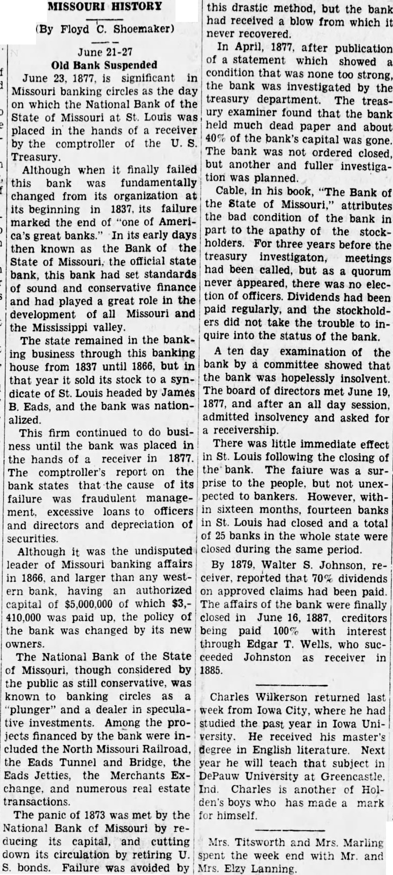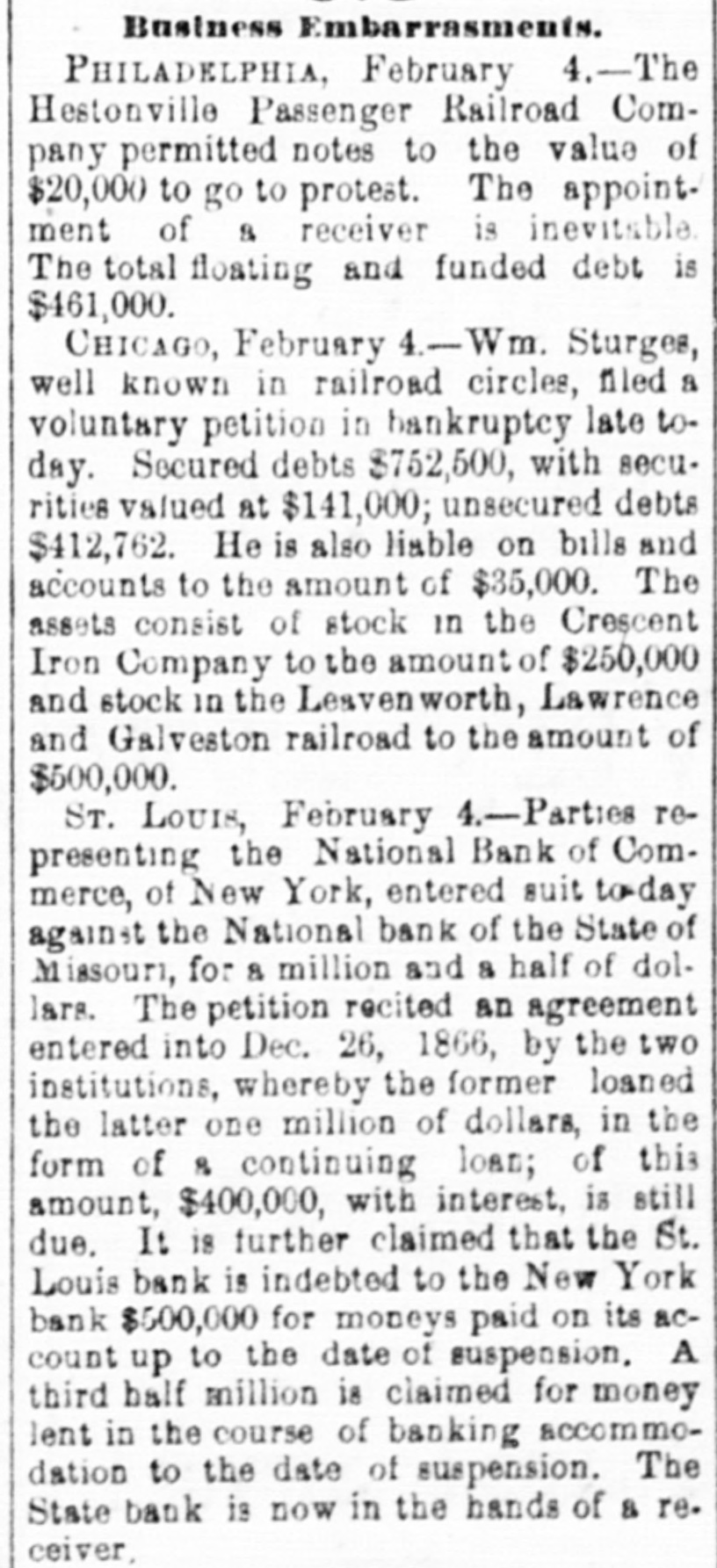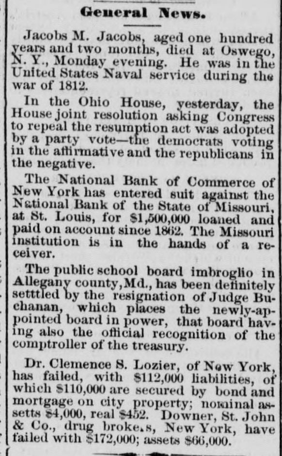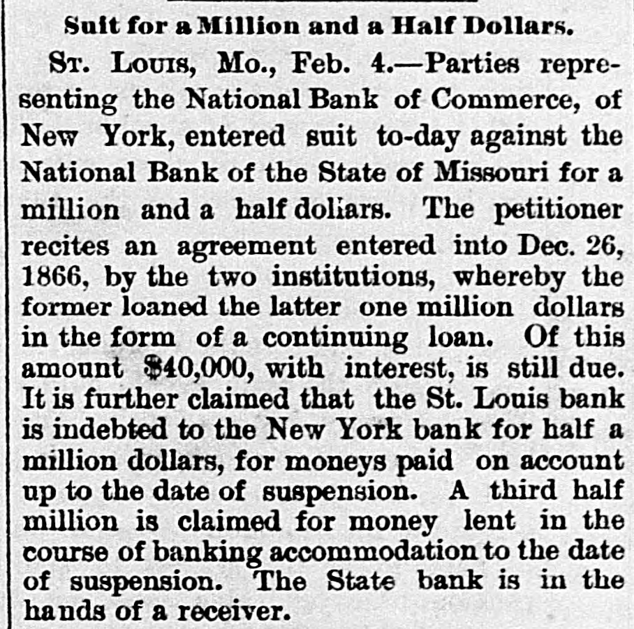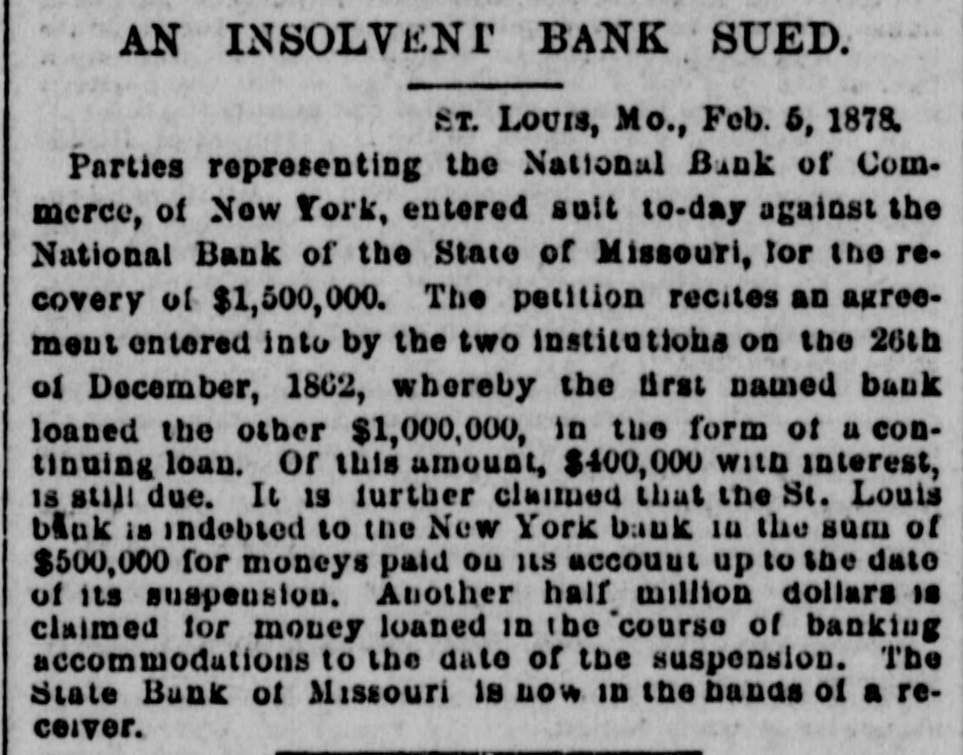 our citizens on the Rio Grande: that our troops must be all. wed to follow the robbers and raiders as long us they could keep them In might without worring themselves overmuch ab ut boundary lines. and that Gen. Trevino regards himsell as having won a complete diplomatic victory over the American General and the American Government. PATENT REFUSED. Gen. Spear. Commissioner of Patents, has refused to graut n patent to James Sargent, of Sargent it Greenlcaf. to cover the employment of time-locks in connection with inder endent combination locks used upon safe and vault doors. The application of Mr. Fergent was a feature of the noted time-lock context that nas been pendine in the Patent-Olive for years. tien. Spear's action is based principally upon the fact that tl.c suit Instituted by the Yale Lock Company in the Sureme Court of the District of Columbia is being prosecuted to determine de more the right of using the time lock in controversy. The Hall Safe & Lock Company of Chicago and Cinclunati, and about 3,000 banking institutions throughot the country, are Interested in the result of the suit. RESPENDED After an Investigation at the Interior Department. (len. Kimball, the Surveyor-General of Utah, has been suspended. Great efforts have been made for his reinstatement by influential politicians, tho most prominent of whom is Attorney-General Deveus, but the Secretary of the Interior is said to be unalterably opposed to his retention. The Government has moved to dismiss the suit of the Lee heirs to recover the Artington [leights Cemetery on the ground that the Goverminent has prossession of the proberty under title of record. DIVIDENDS. To the Wetern Associated Press. WARNINGTON, D. C., Aug. 3.-The Comptrollcr of the Currency declared a dividend of 15 per cent In favor of the creditors of the National Bank of the State of Missouri. St. Louis, and a second dividend of 10 per cent In favor of the creditors of the First National Bank. Duluth. The dividends are payable as soon as the tiecessary schedule can be prepared. NATIONAL BANK SECURITIES. The total amount of United States bonds held as security for the circulating notes of National Banks is $337,528,100. CALL FOR RONDS. The Secretary of the Treasury to-day issued the lifty-fourtli call for the redemption of ten millions of 5-20 bonds of 1805, seven millions of coupon and three millions of registered bonds, as follows: Coupons-$50. Nos. 40,001 to 44,000; $100. Nos. 66,001 to 76,000; $300, Nos. 50,001 to 57.000; $1,000, Nos. 85,001 to 90,000. Registered-8:00 Nos. 1.40L to 1,000; $100, Nos. 11,001 to 13,100; $500, Nos. 7,751 to 8.300: 81.000, Non. 25,101 to 27,400; $5,000, Nos. 7,301 to 7,050; $10,000 Nos. 11,751 to 13,550. CABINET MEETING. The Cabinet session to-day was short, and no business of importance was done. There was a discussion of Utah mattere, and the Indletment of certain Mormon leaders In connection with the Mountain Meadow maseacre, the labor troubles, and matters pertaining to appointments in the territories. RELEASED. Ex-Detective Bell, arrested last night on a requisition from the Governor of Texas on the charge of murder, was released to-day by Judge Humphrics, of the District Supreme Court.