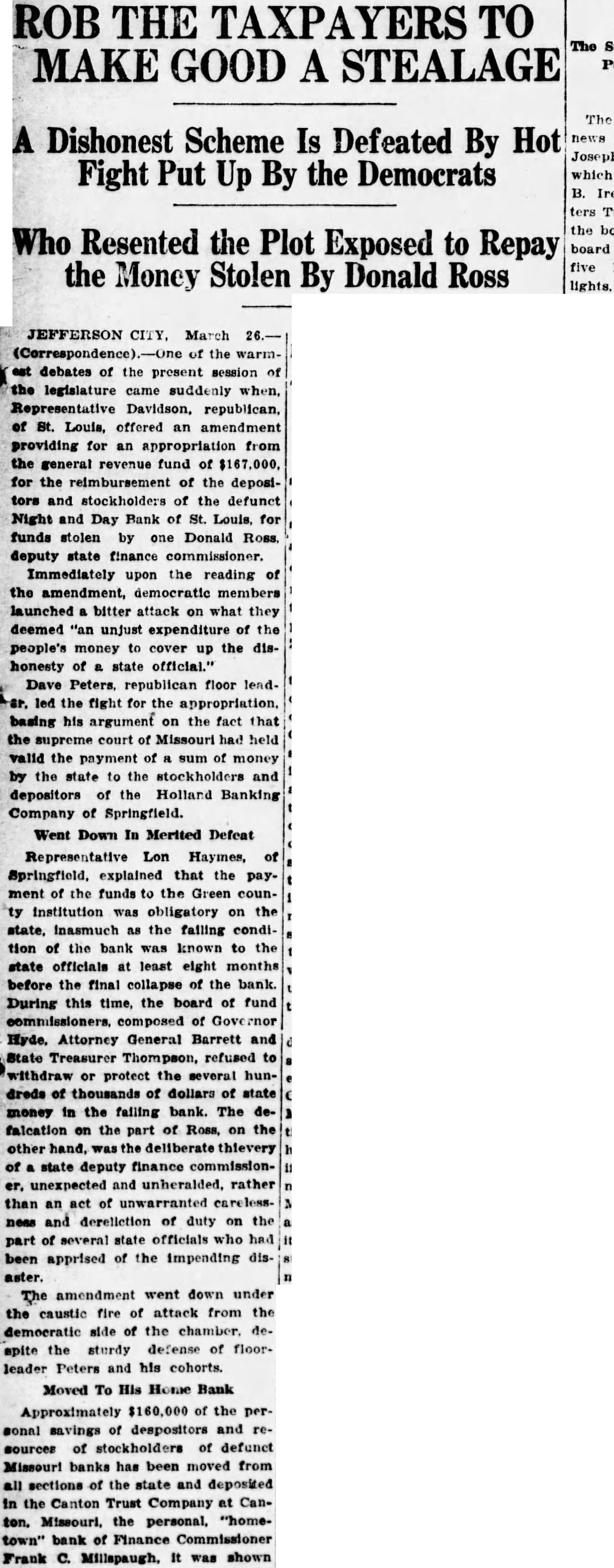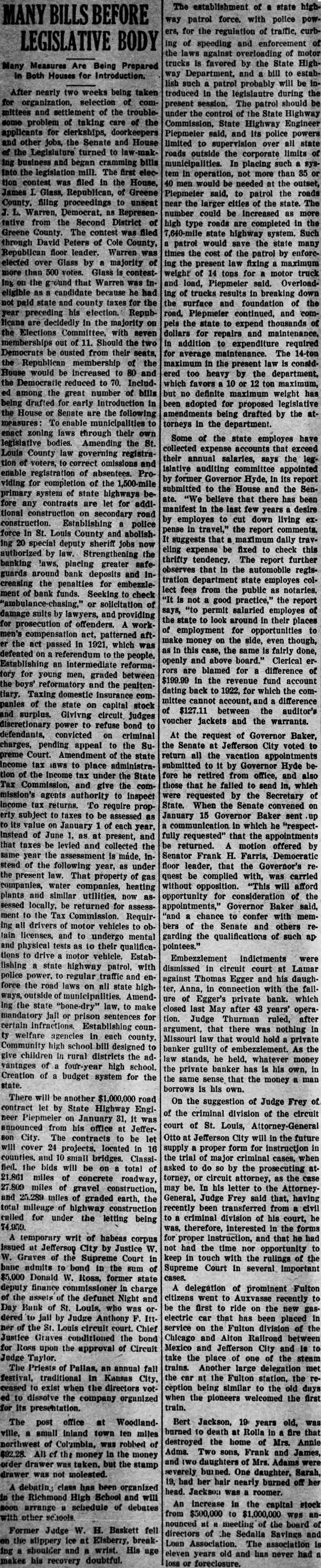 Many Measures Are Being Prepared Both Houses for Introduction. After nearly two weeks being taken selection mittees and settlement of the troubleproblem of taking the applicants clerkships, doorkeepers other the Senate and House Legislature turned to business and began bills the first eleccontest was filed in the House, James Republican, Greene filing proceedings unseat Warren, Democrat, Representative from the Second District Greene County. The contest was filed through David Peters of Cole County, Republican floor leader. Warren was elected over Glass by majority than Glass contestthe ground that Warren Ineligible candidate because he state county for the preceding his election. Republicans are decidedly the majority Elections Committee, with memberships out of Should the Democrats ousted from seats, Republican membership House would increased and the Democratic reduced to Includamong the great number of bills being drafted for early Introduction in the House Senate the following measures: enable to enact zoning laws through their own legislative bodies. Amending the St. Louis County law governing registration voters, correct omissions and enable registration of absentees. Providing for completion of the 1,500-mile primary system of state before any contracts are let for additional construction on secondary road construction. Establishing police force In Louis County and abolishing special deputy sheriff jobs now authorized law. Strengthening the banking !aws, placing greater safeguards around bank deposits and creasing the penalties for embezzlement bank funds. Seeking to check or solicitation damage for prosecution of offenders. workmen's compensation act, patterned aftthe act passed in 1921, which referendum to the people. Establishing an Intermediate reformatory for young men, graded between reformatory and the penitentiary. Taxing domestic Insurance companies of the state on capital stock surplus. circuit judges discretionary power to refuse bond defendants, convicted criminal on charges, pending appeal to the Supreme Court. Amendment of the state Income tax laws to place administration the Income tax under the State Tax Commission, and give the mission's agents authority to inspect Income returns. To require property subject taxes to be assessed value on January of each Instead of June at present, and that taxes be levied and collected the year the assessment is máde, instead of the following year, as under the present That of property gas companies, water companies, heating plants and similar utilities, now sessed locally, be returned for ment to the Tax Commission. RequirIng drivers of motor vehicles to licenses, and to undergo mental and physical tests to their qualifications to drive motor vehicle. Establishing state highway patrol, with police power, regular traffic and enforce the road laws on all state highIng the state "bone-dry" law, to make mandatory Jall or prison sentences for certain infractions. Establishing counwelfare agencies in each county. Community high school designed give children In rural districts the vantages of high school. Creation of budget system for the state. There will be another road contract let State Highway Engineer Piepmeier January 31, announced his office Jefferson City. The contracts be will cover 24 located in projects. counties, and small bridges. Classified. bids will be total of 21.861 miles of concrete roadway, miles gravel construction, and 25.289 miles of graded earth, the total mileage of highway construction called for under the letting being temporary writ of habeas corpus Issued City by Justice Graves of the Supreme Court bane admits bond in the sum of $5,000 Donald W. Ross, former state deputy finance commissioner in charge the assets the defunct Night and Day Bank Louis, who ordered to Jall Judge Anthony Ittof the Louis circuit court. Chief Justice Graves conditioned the bond for Ross upon the approval of Circuit Judge Taylor. The Priests of Pallas, an annual fall festival, traditional in Kansas City, ceased exist when the directors votdissolve the company organized for its presentation. The post office at Woodlandville, small Inland town ten miles northwest Colambia, was robbed of $92.28. All of the money in the money taken. but the stamp drawer was not molested. debating has been organized the Richmond High School and will soon arrange schedule of debates other schools Former Judge H. Baskett fell the slippery ice at Elsberry, breakshoulder and wrist. His age makes his recovery doubtful. The establishment state patrol force. with police for the regulation of curbspeeding and enforcement against overloading of motor trucks favored by the State Department, and bill to estabsuch patrol probably will be troduced in the legislautre during the present session. The patrol should be the control of the State Highway Commission, State Highway Engineer Piepmeier and police powers limited to supervision over all state roads outside the corporate limits of In placing such sysoperation, not more than would be needed at the outset, said, to patrol the roads the larger of the state. The number could be increased as more high type roads are completed in the state highway system. Such patrol would save the state many times the cost of the patrol by the present law fixing maximum weight of 14 tons for motor truck load, Piepmeter said. Overloadtrucks results in breaking down surface and foundation the Plepmeter continued, and comthe state to expend thousands dollars for repairs and maintenance, addition to expenditure required for average maintenance. The present law considheavy by the department, which favors or ton maximum, no definite maximum weight has been adopted for proposed amendments being drafted by the torneys in the department. Some of the state employes have collected that exceed their annual salaries, the says islative auditing committee appointed former Governor Hyde, in its report submitted to the House and the Senate. believe t