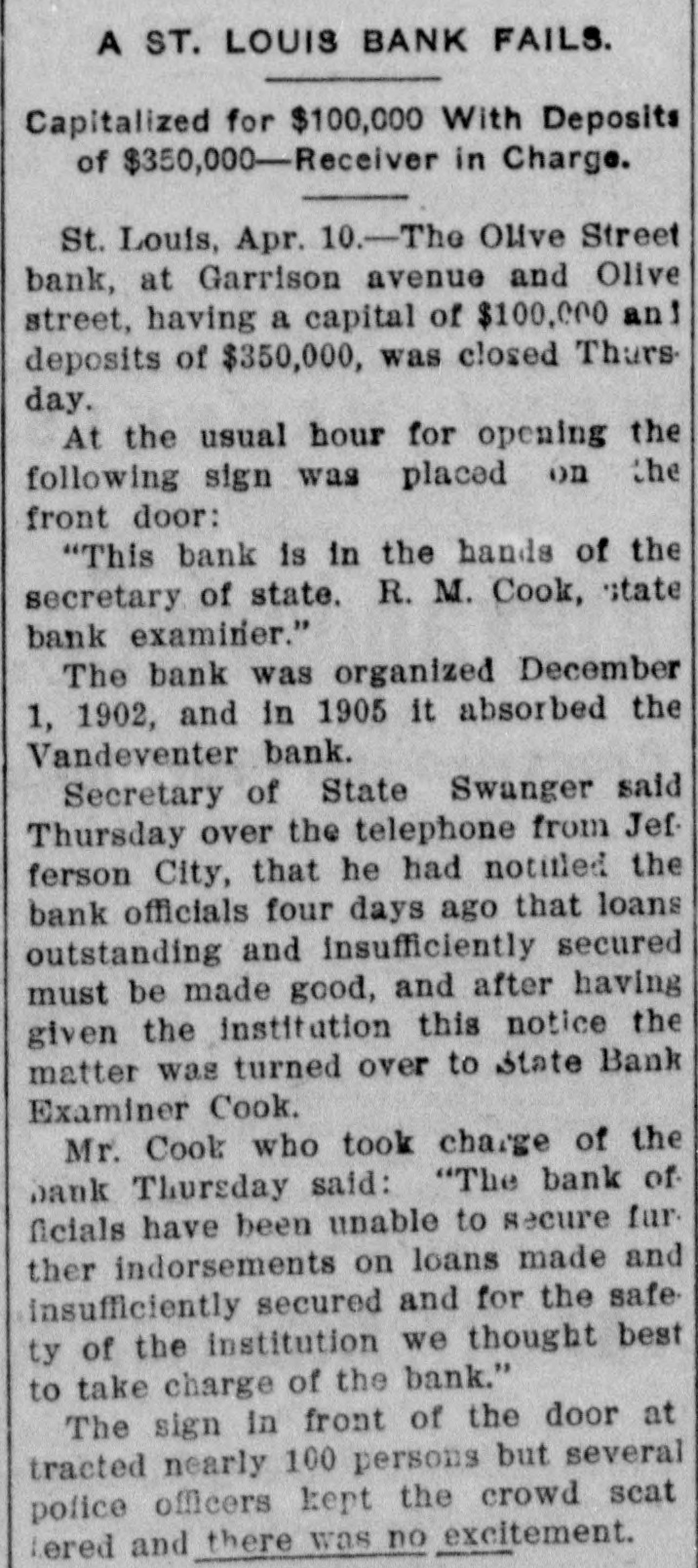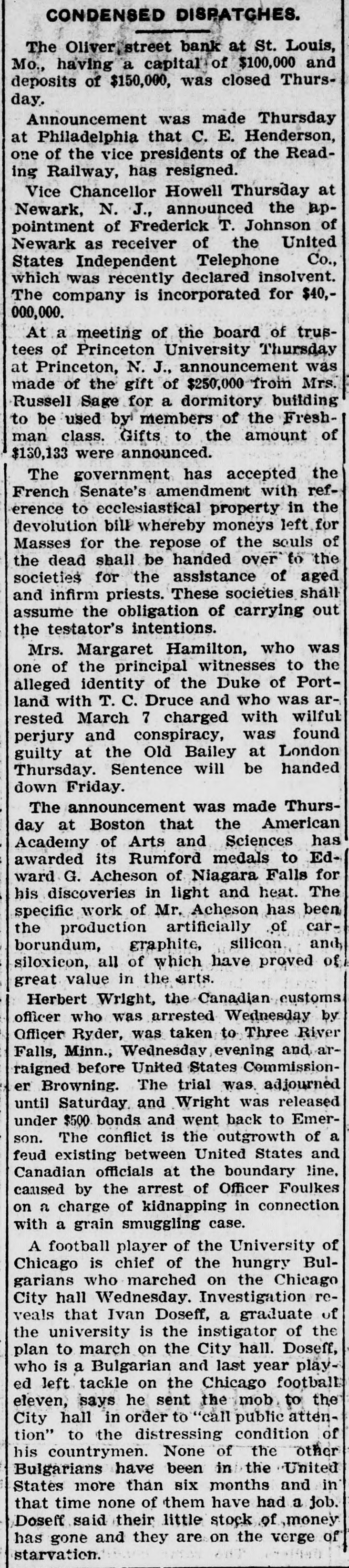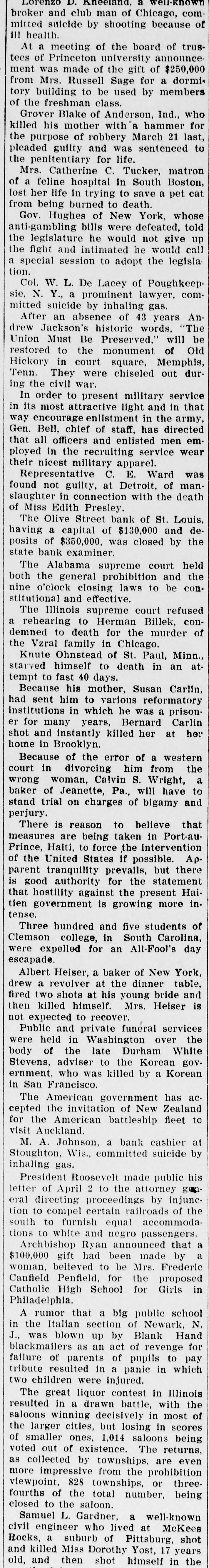 13 'GT roker and club man of Chicago, comitted suicide by shooting because of health I At a meeting of the board of truses of Princeton university announceent was made of the gift of $250,000 om Mrs. Russell Sage for a dormiry building to be used by members f the freshman class. Grover Blake of Anderson, Ind., who illed his mother with a hammer for e purpose of robbery March 21 last, leaded guilty and was sentenced to e penitentiary for life. Mrs. Catherine C. Tucker, matron : a feline hospital in South Boston, st her life in trying to save a pet cat om being burned to death. Gov. Hughes of New York, whose ati-gambling bills were defeated, told e legislature he would not give up e fight and intimated be would call special session to adopt the legisla'uo Col. W. L. De Lacey of Poughkeepe, N. Y., a prominent lawyer, comitted suicide by inhaling gas. After an absence of 43 years Anrew Jackson's historic words, "The nion Must Be Preserved," will be estored to the monument of Old lickory in court square, Memphis, enn. They were chiseled out durg the civil war. In order to present military service 1 its most attractive light and in that ay encourage enlistment in the army, en. Bell, chief of staff, has directed at all officers and enlisted men emloyed in the recruiting service wear eir nicest military apparel. Representative C. E. Ward was und not guilty, at Detroit, of manaughter in connection with the death ? Miss Edith Presley. The Olive Street bank of St. Louis, aving a capital of $130,000 and debsits of $350,000, was closed by the ate bank examiner. The Alabama supreme court held oth the general prohibition and the ine o'clock closing laws to be conitutional and effective. The Illinois supreme court refused rehearing to Herman Billek, conemned to death for the murder of e Vzral family in Chicago. Knute Ohnstead of St. Paul, Minn., arved himself to death in an atmpt to fast 40 days. Because his mother, Susan Carlin, d sent him to various reformatory stitutions in which he was a prison: for many years, Bernard Carlin ot and instantly killed her at her ome in Brooklyn. Because of the error of a western ourt in divorcing him from the rong woman, Calvin S. Wright, a ker of Jeanette, Pa., will have to and trial on charges of bigamy and erjury. There is reason to believe that easures are being taken in Port-aurince, Haiti, to force the intervention the United States if possible. Aprent tranquility prevails, but there good authority for the statement at hostility against the present Haien government is growing more innse. Three hundred and five students of emson college, in South Carolina, ere expelled for an All-Fool's day scapade. Albert Heiser, a baker of New York, ew a revolver at the dinner table, ed two shots at his young bride and en killed himself. Mrs. Heiser is ot expected to recover. Public and private funeral services ere held in Washington over the ody of the late Durham White tevens, adviser to the Korean gov'nment, who was killed by a Korean 1 San Francisco. The American government has acepted the invitation of New Zealand r the American battleship fleet to sit Auckland. M. A. Johnson, a bank cashier at toughton, Wis., committed suicide by haling gas. President Roosevelt made public his