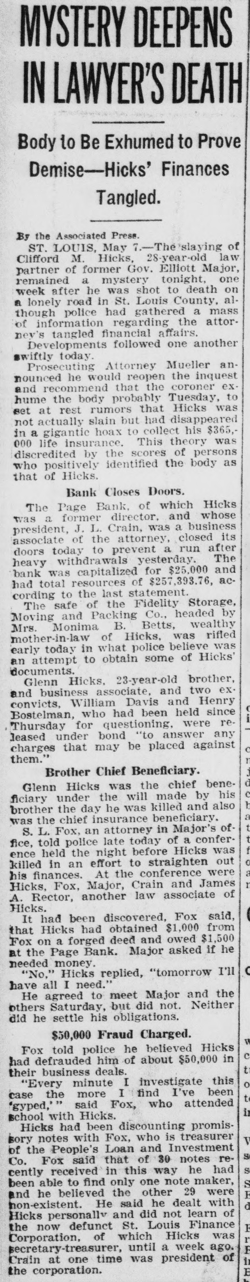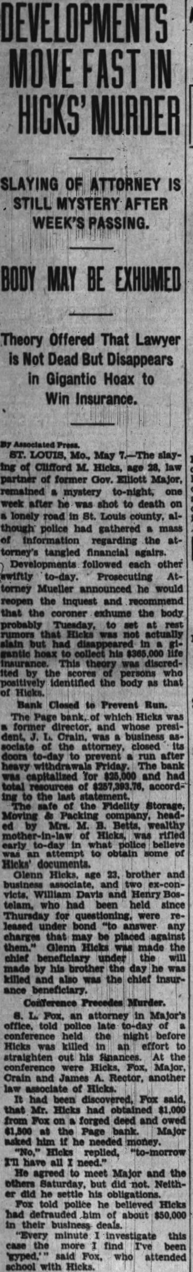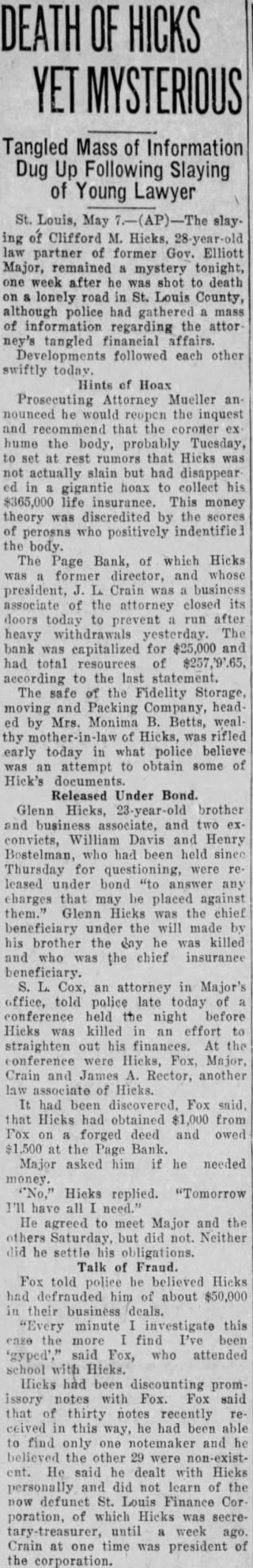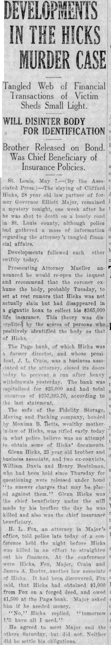 MURDER CASE Tangled Web of Financial Transactions of Victim Sheds Small Light. WILL DISINTER BODY FOR IDENTIFICATION Brother Released on Bond. Was Chief Beneficiary of Insurance Policies. St. Louis, May the Associated slaying of Clifford Hicks, 28 year old law partner of former Governor Elliott Major, remained mystery tonight, one week after he he was shot to death lonely road Louis county, although police had gathered mass of information regarding the attorney tangled financial affairs. Developments followed each other swiftly today. Prosecuting Attorney Mueller nounced he would re-open the inquest and recommend that the coroner hume the body, probably Tuesday, to set at rest rumors that Hicks was not actually slain but had disappeared in gigantic hoax to collect his $365,000 life insurance. This theory was discredited by the scores of persons positively identified the body as that Hicks. The Page bank, of which Hicks was former director, and whose president, Crain, business ciated of the attorney, closed its doors today to prevent run after heavy withdrawals yesterday. The bank was capitalized for $25,000 and had total of $257,393.76, according to the last statement. The safe of the Fidelity Storage, Moving and Packing company, headed Monima B. Betts, wealthy motherin-law of Hicks, was rifled early today what police believe was an attempt obtain some of Hicks' documents. Glenn Hicks, brother and business associate, and two ex-conviets, William Davis and Henry Bostelman, had been held since Thursday for questioning were released under bond answer charges that may be placagainst Glenn Hicks the chief beneficiary under the will made by his brother the day he was killed and also was the chief insurance beneficiary. H. Fox, an attorney in Major's office, told police late today of ference held the night before Hicks killed in an effort to straighten his finances. At the conference Hicks, Fox, Major, Crain and James Rector, law associate Hicks. It had been discovered, Fox said, that Hicks had obtained $1,000 from Fox forged deed, and owed $1,500 at the Page bank. Major asked him if he needed money. Hicks replied, tomorrow I'll have all He agreed to meet Major and the others Saturday, but did Neither did he settle his obligations.