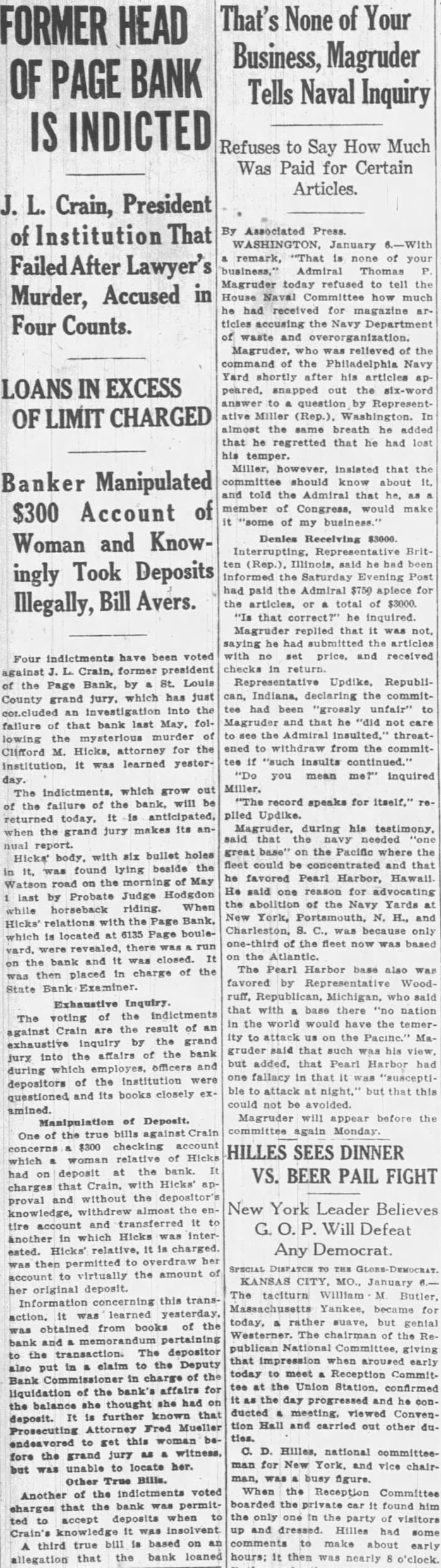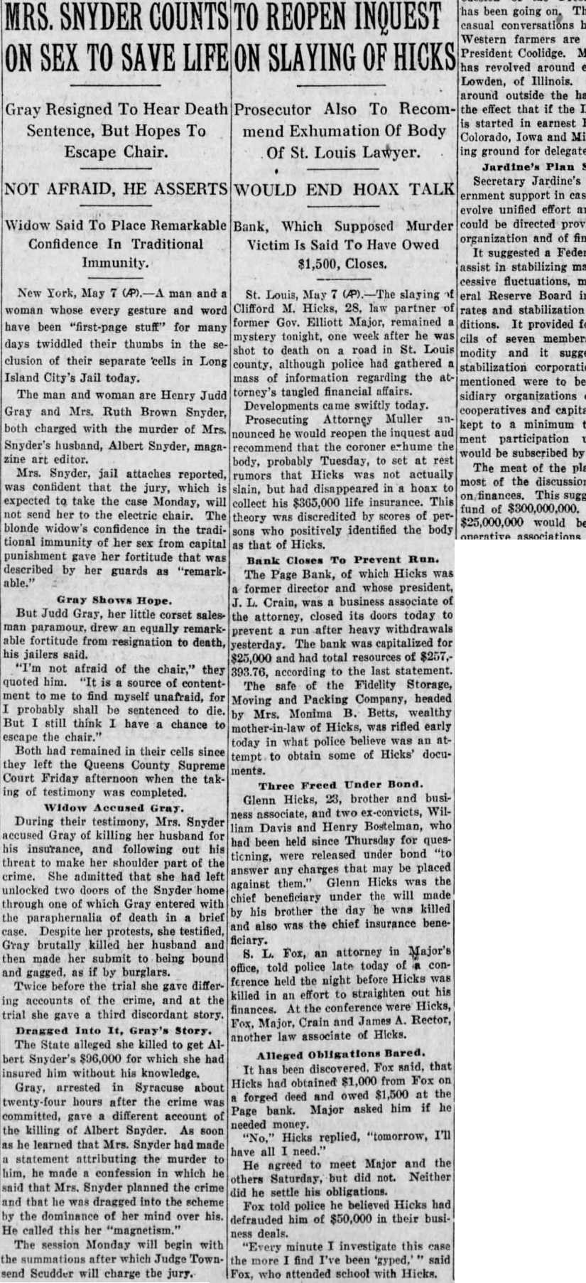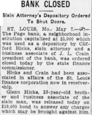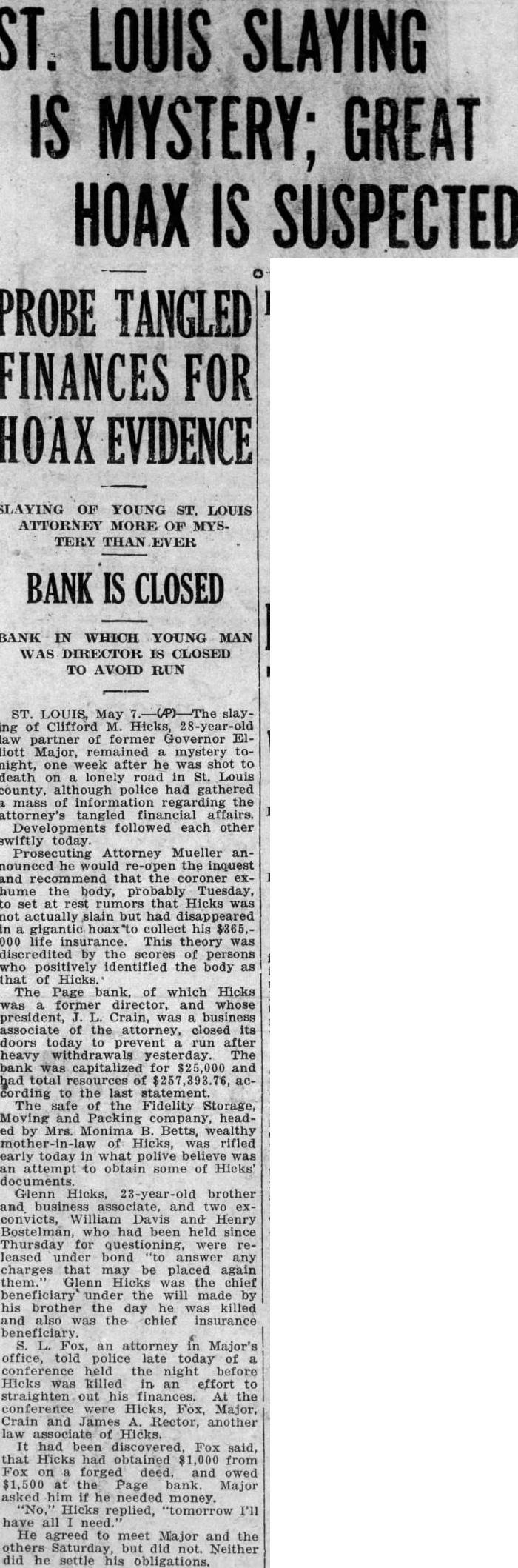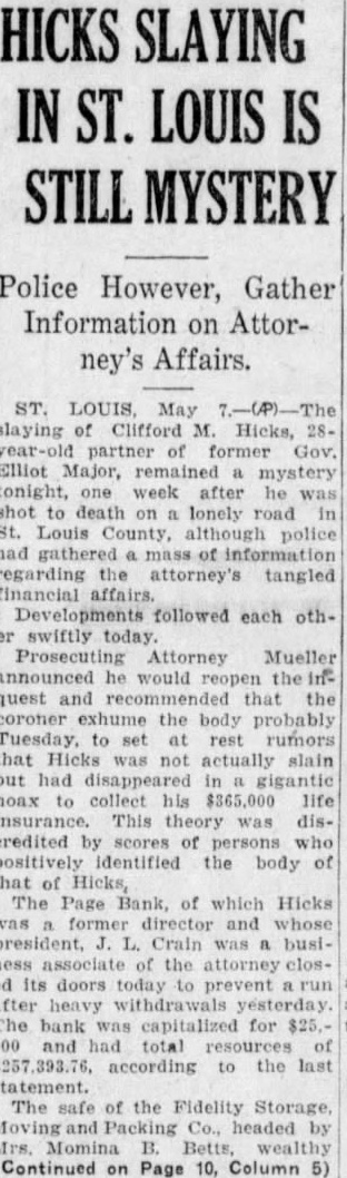 MURDER CASE Tangled Web of Financial Transactions of Victim Sheds Small Light. WILL DISINTER BODY FOR IDENTIFICATION Brother Released on Bond. Was Chief Beneficiary of Insurance Policies. St. Louis, May the Associated slaying of Clifford Hicks, 28 year old law partner of former Governor Elliott Major, remained mystery tonight, one week after he he was shot to death lonely road Louis county, although police had gathered mass of information regarding the attorney tangled financial affairs. Developments followed each other swiftly today. Prosecuting Attorney Mueller nounced he would re-open the inquest and recommend that the coroner hume the body, probably Tuesday, to set at rest rumors that Hicks was not actually slain but had disappeared in gigantic hoax to collect his $365,000 life insurance. This theory was discredited by the scores of persons positively identified the body as that Hicks. The Page bank, of which Hicks was former director, and whose president, Crain, business ciated of the attorney, closed its doors today to prevent run after heavy withdrawals yesterday. The bank was capitalized for $25,000 and had total of $257,393.76, according to the last statement. The safe of the Fidelity Storage, Moving and Packing company, headed Monima B. Betts, wealthy motherin-law of Hicks, was rifled early today what police believe was an attempt obtain some of Hicks' documents. Glenn Hicks, brother and business associate, and two ex-conviets, William Davis and Henry Bostelman, had been held since Thursday for questioning were released under bond answer charges that may be placagainst Glenn Hicks the chief beneficiary under the will made by his brother the day he was killed and also was the chief insurance beneficiary. H. Fox, an attorney in Major's office, told police late today of ference held the night before Hicks killed in an effort to straighten his finances. At the conference Hicks, Fox, Major, Crain and James Rector, law associate Hicks. It had been discovered, Fox said, that Hicks had obtained $1,000 from Fox forged deed, and owed $1,500 at the Page bank. Major asked him if he needed money. Hicks replied, tomorrow I'll have all He agreed to meet Major and the others Saturday, but did Neither did he settle his obligations.